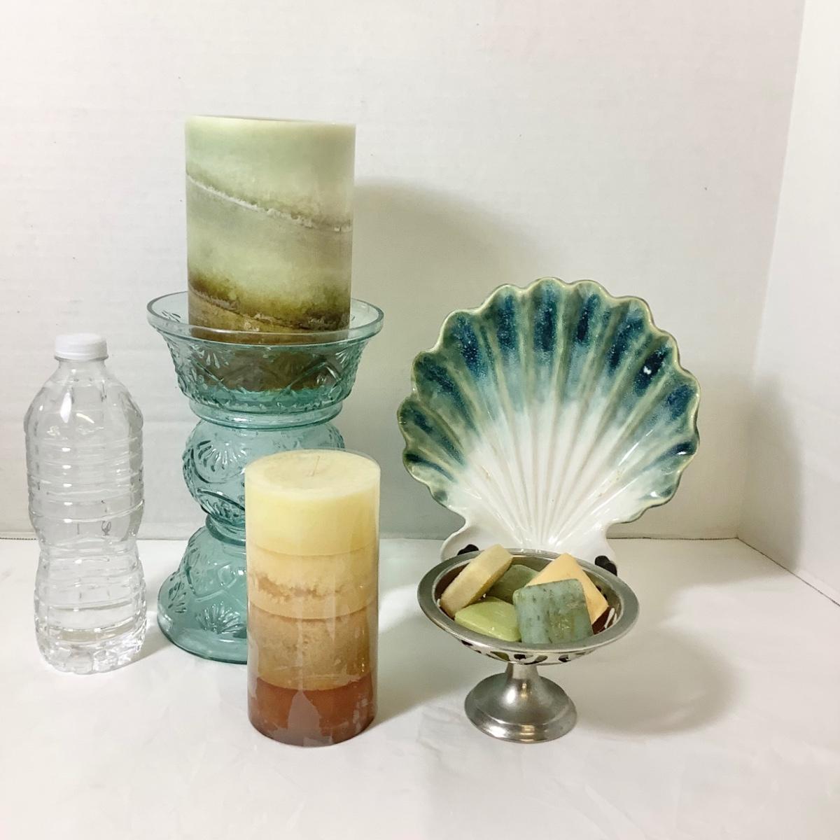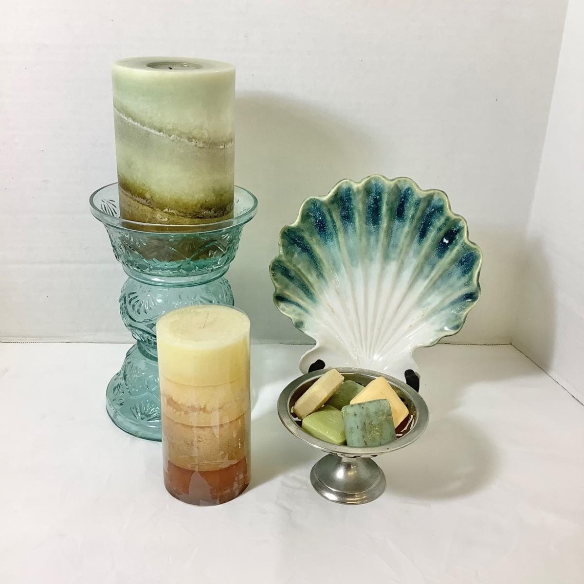 Shell dish, Pier One Candle & Glass Holder, Decorative Soap in silver tone dish, Wicks & More Candle.