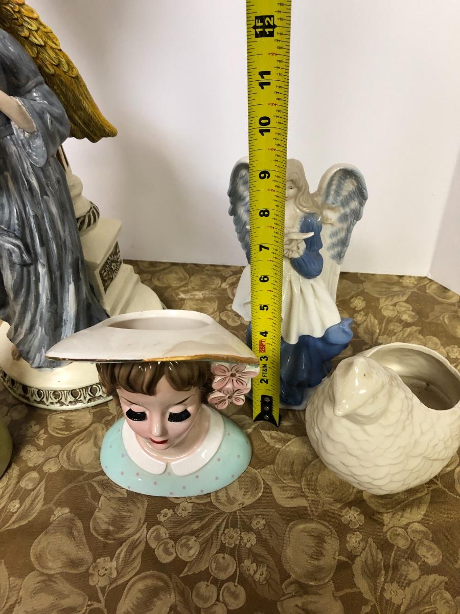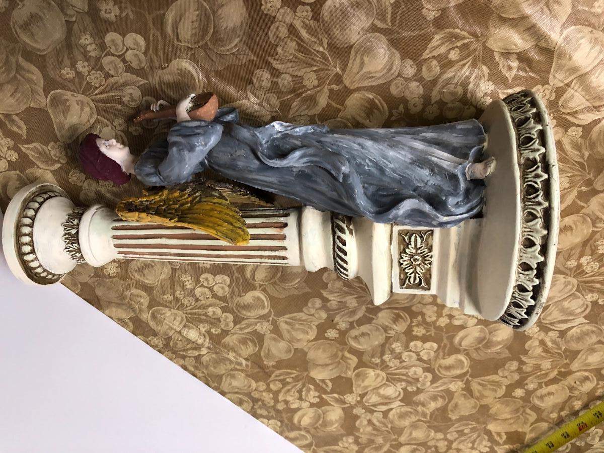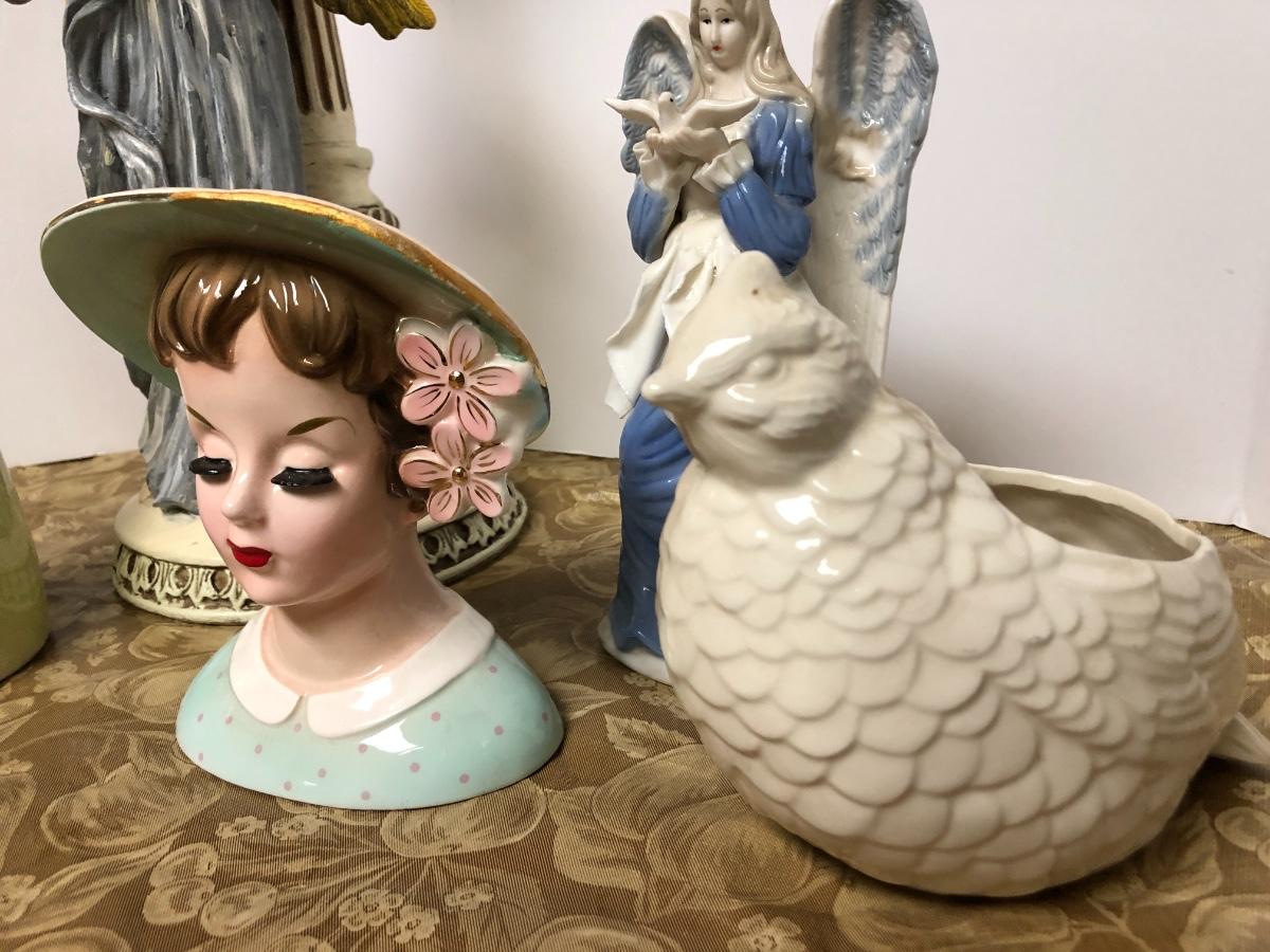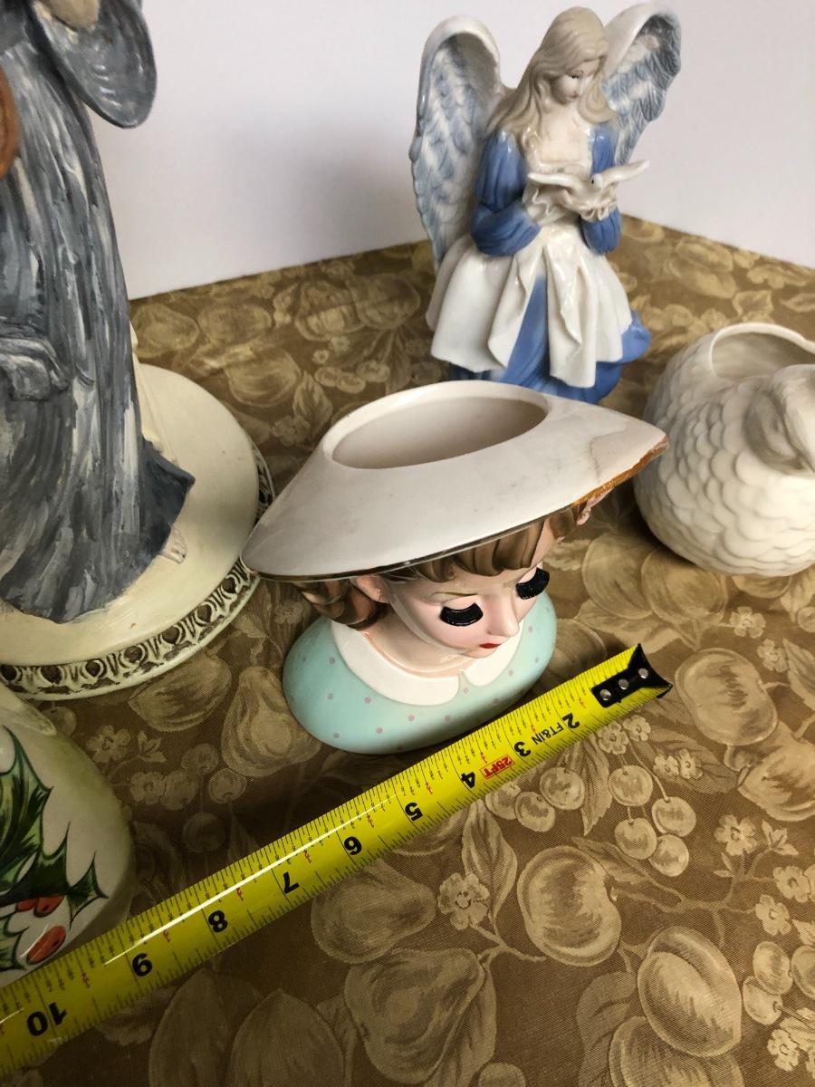 All items are sold as is, as found in the estate. Please see all photos for content, measurements and condition. Lady statue appears that her hat has been repaired. Main photo only shows one ceramic Kimple Mold but located the second one as shown in the other photos.