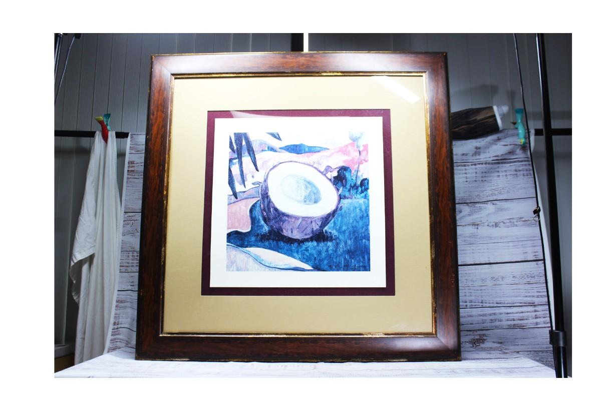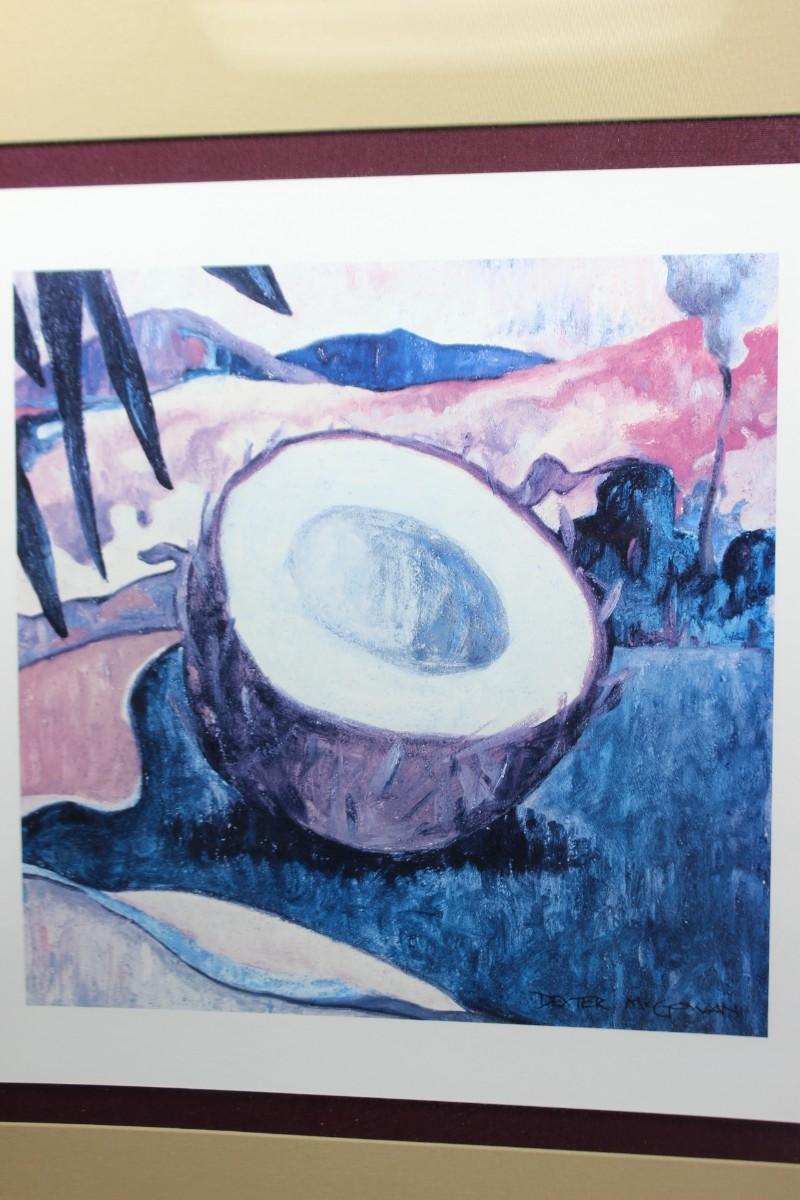Home Decor Framed Art Coconut by Dexter McGowan, there is some slight discoloration of the image, but there is no damage to the frame or the protective glass and is in good condition. Check pictures for more details and for sizing.