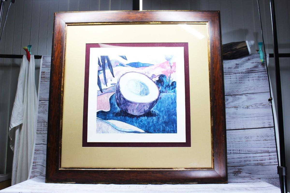 Home Decor Framed Art Coconut by Dexter McGowan, there is some slight discoloration of the image, but there is no damage to the frame or the protective glass and is in good condition. Large, about 36" square. Check pictures for more details and for sizing.