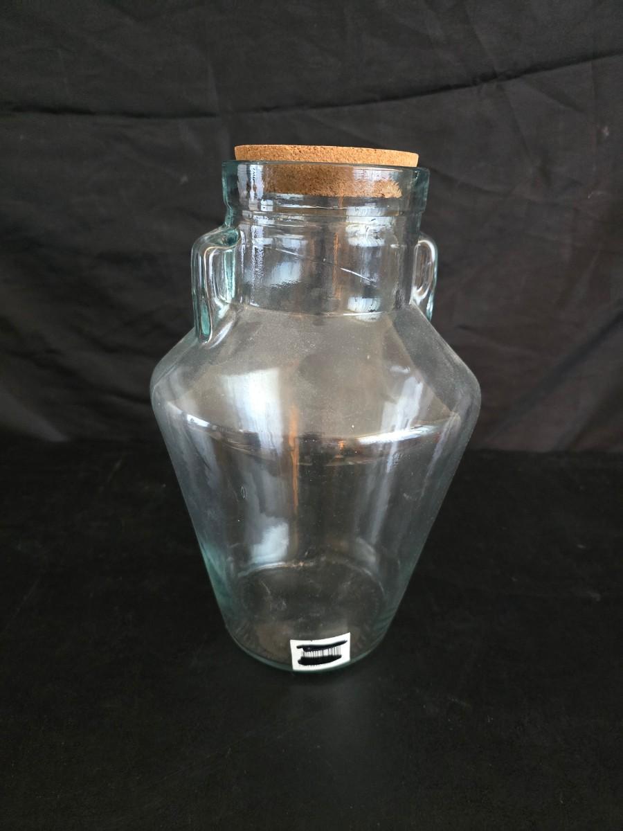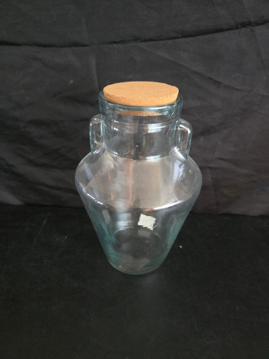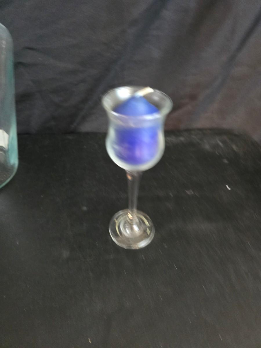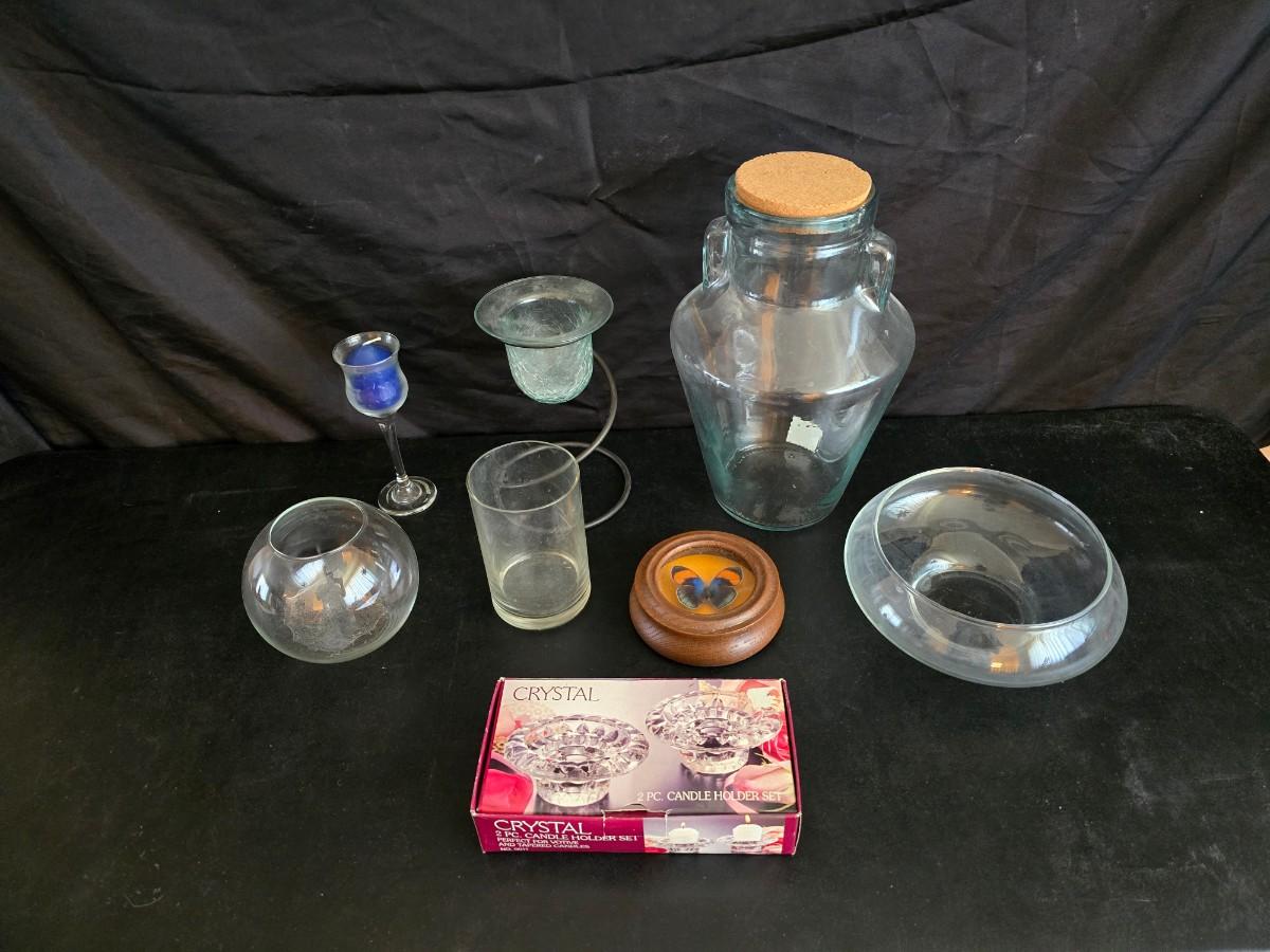 Home decor - large, corked jar - candle holders - and a framed specimen of an Asterope Sapphira butterfly