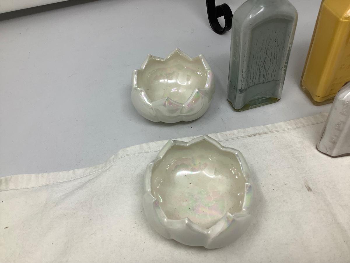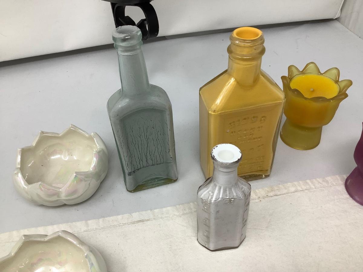 You get a cast iron candle holder, three painted bottles, two flower open dishes, two candles.
