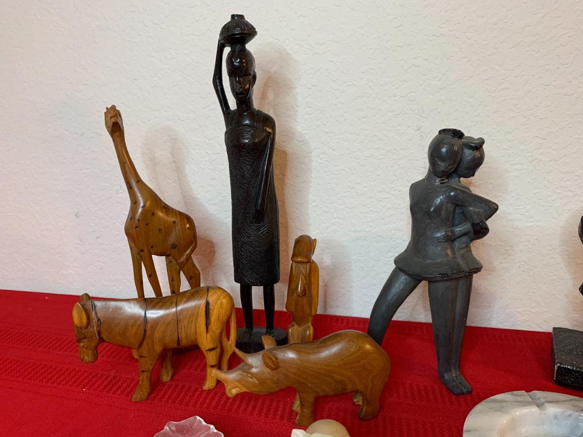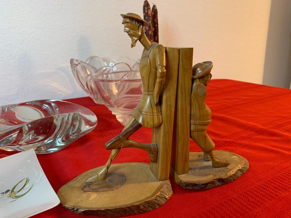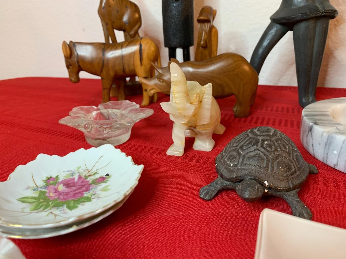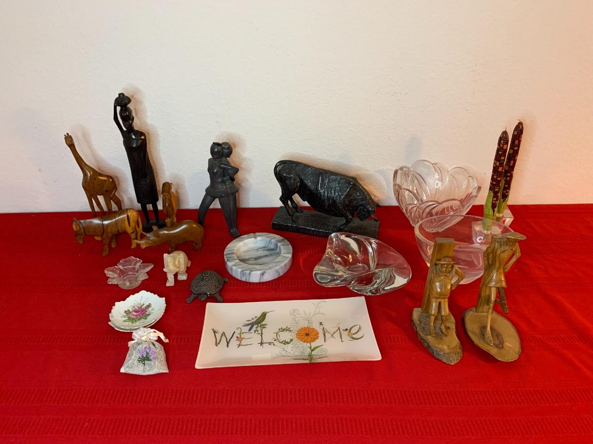 Includes a 1961 Austin Prod chalk ware cast bull, a Fred Press dancing couple (with cracked heads that have been repaired), collection of wood carved animals, heavy crystal bowls, candles, and cast iron turtle trinket box. Wood bookends and more!