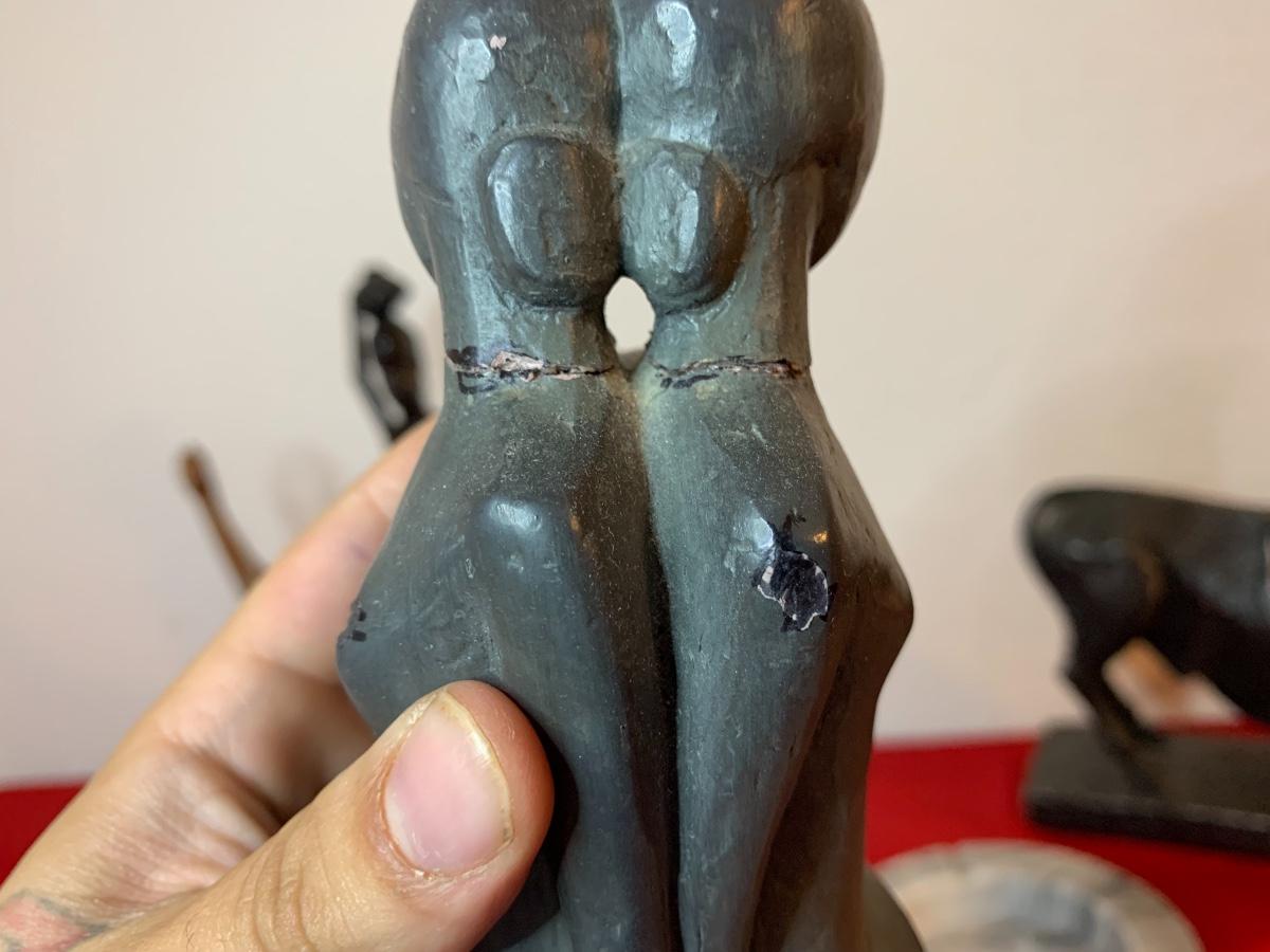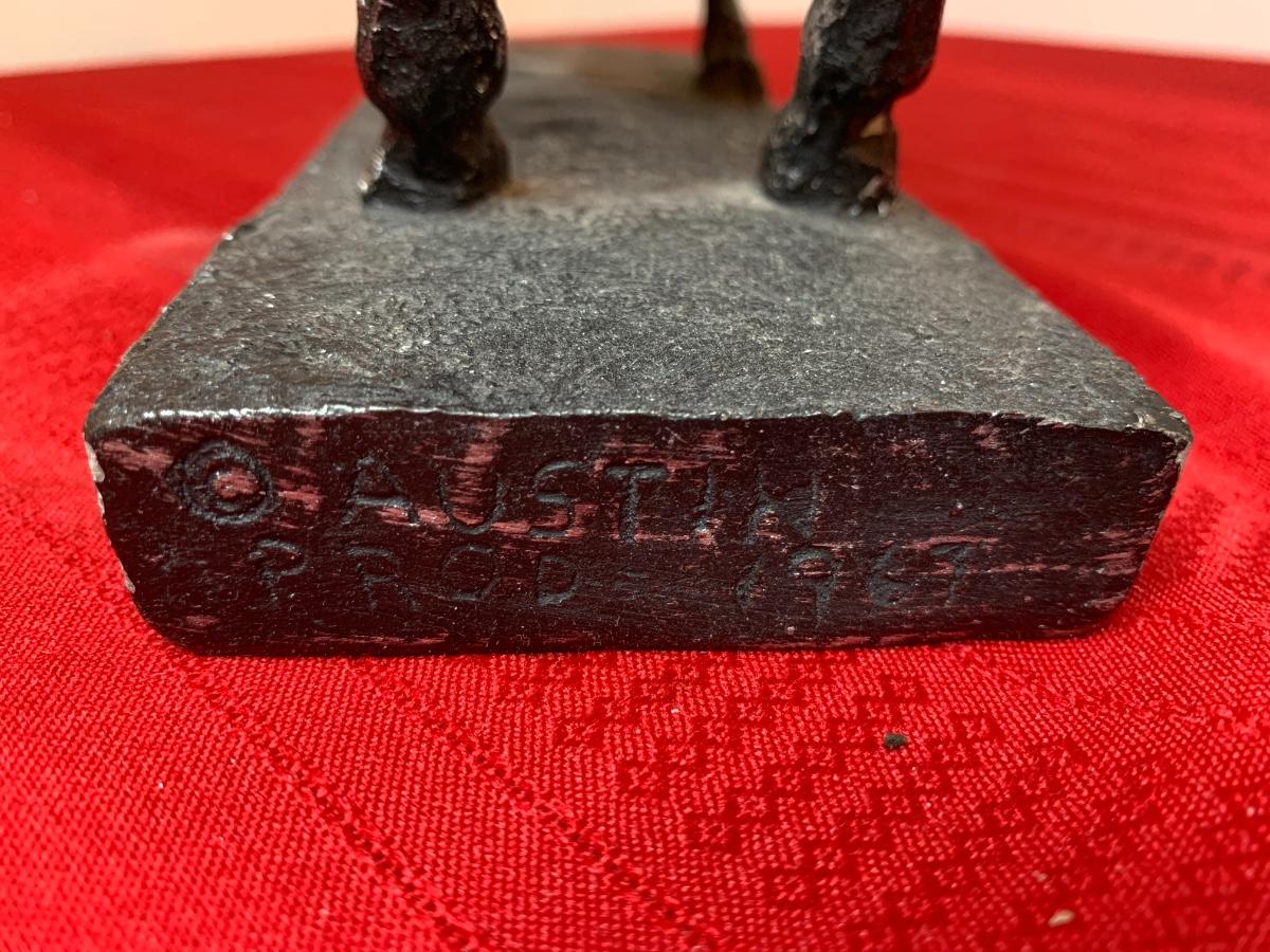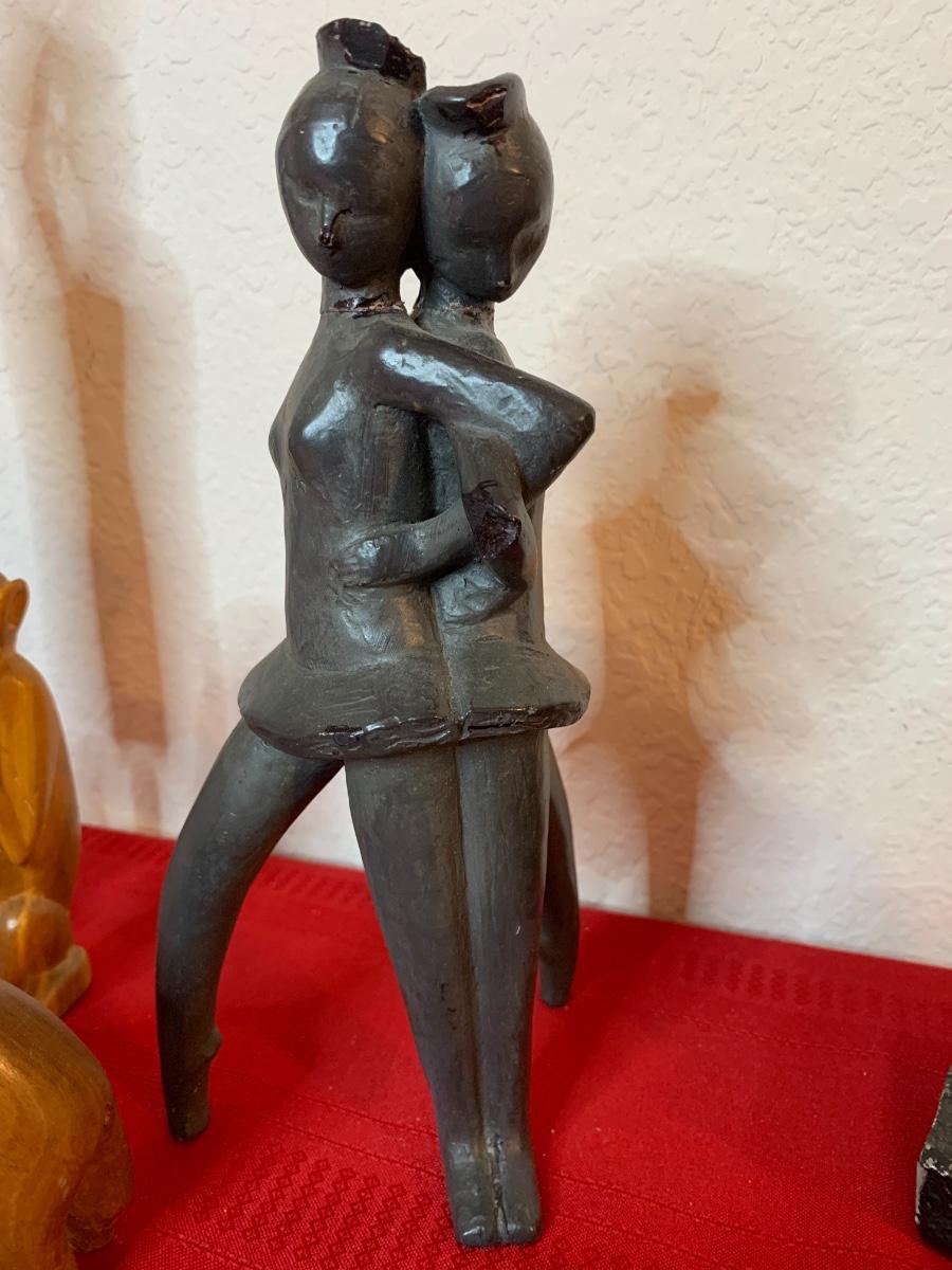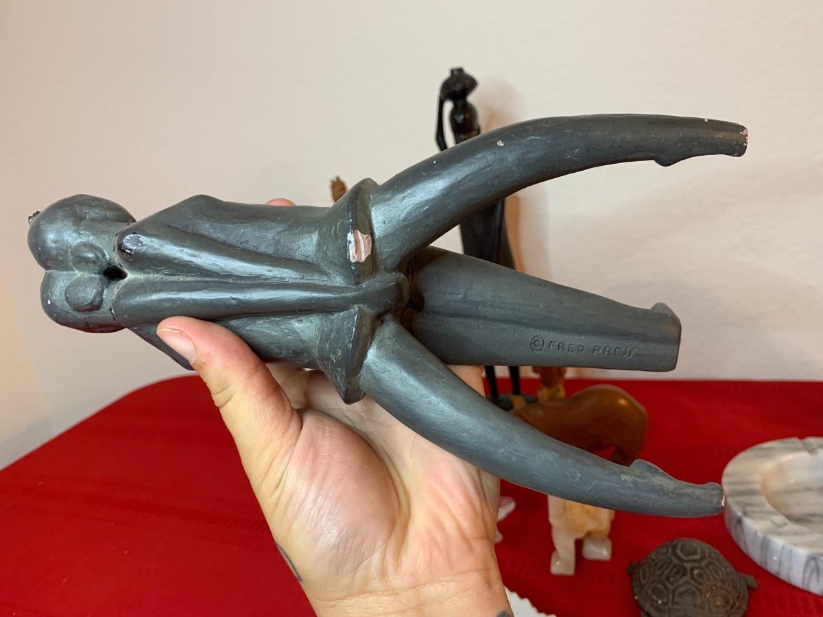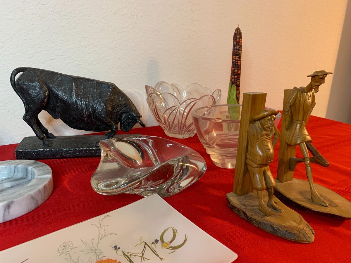 Includes a 1961 Austin Prod chalk ware cast bull, a Fred Press dancing couple (with cracked heads that have been repaired), collection of wood carved animals, heavy crystal bowls, candles, and cast iron turtle trinket box. Wood bookends and more!