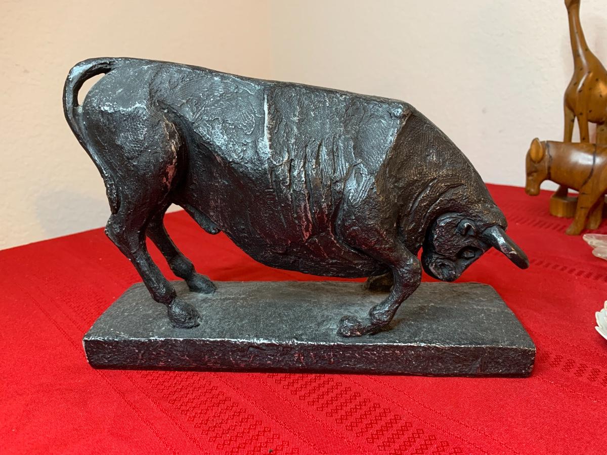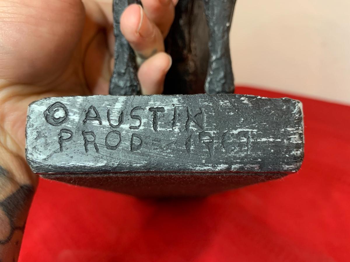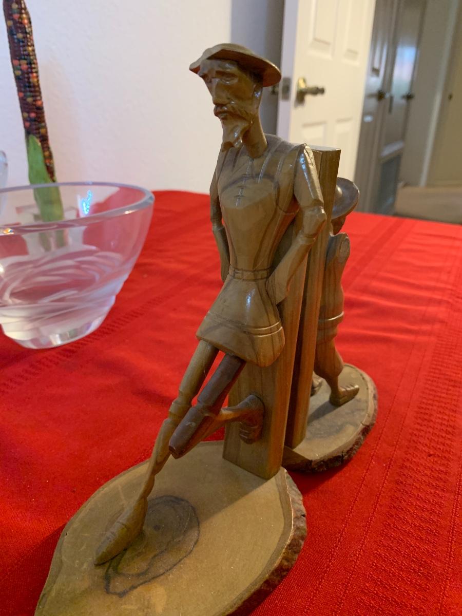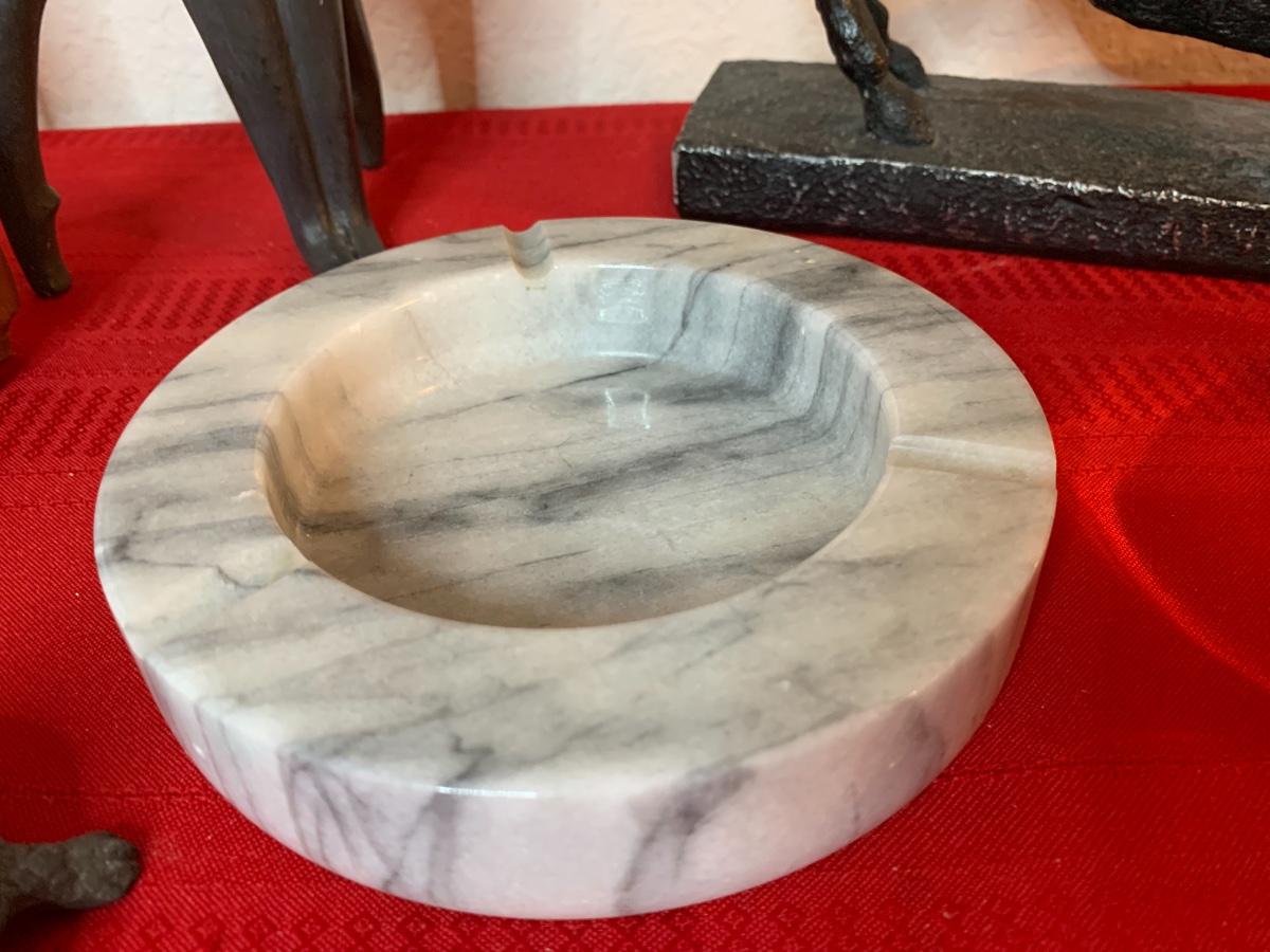 Includes a 1961 Austin Prod chalk ware cast bull, a Fred Press dancing couple (with cracked heads that have been repaired), collection of wood carved animals, heavy crystal bowls, candles, and cast iron turtle trinket box. Wood bookends and more!