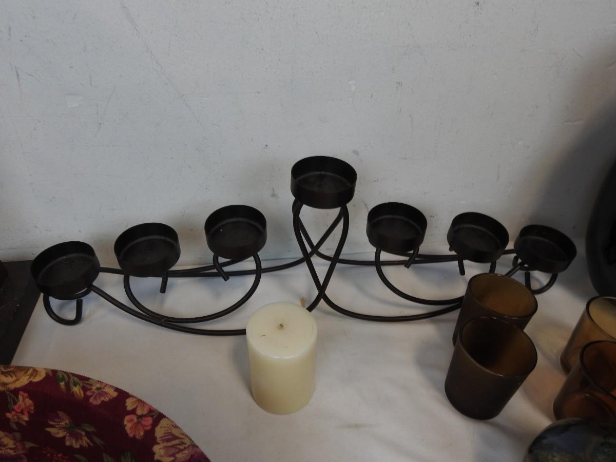 Home Decor Lot: Candle Holder, Brown Shot Glasses, Peacock, Ceramic Organic Candle Holder