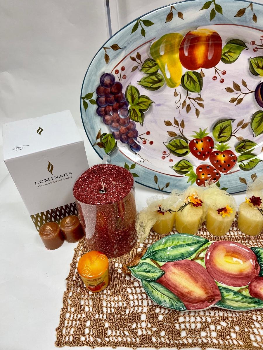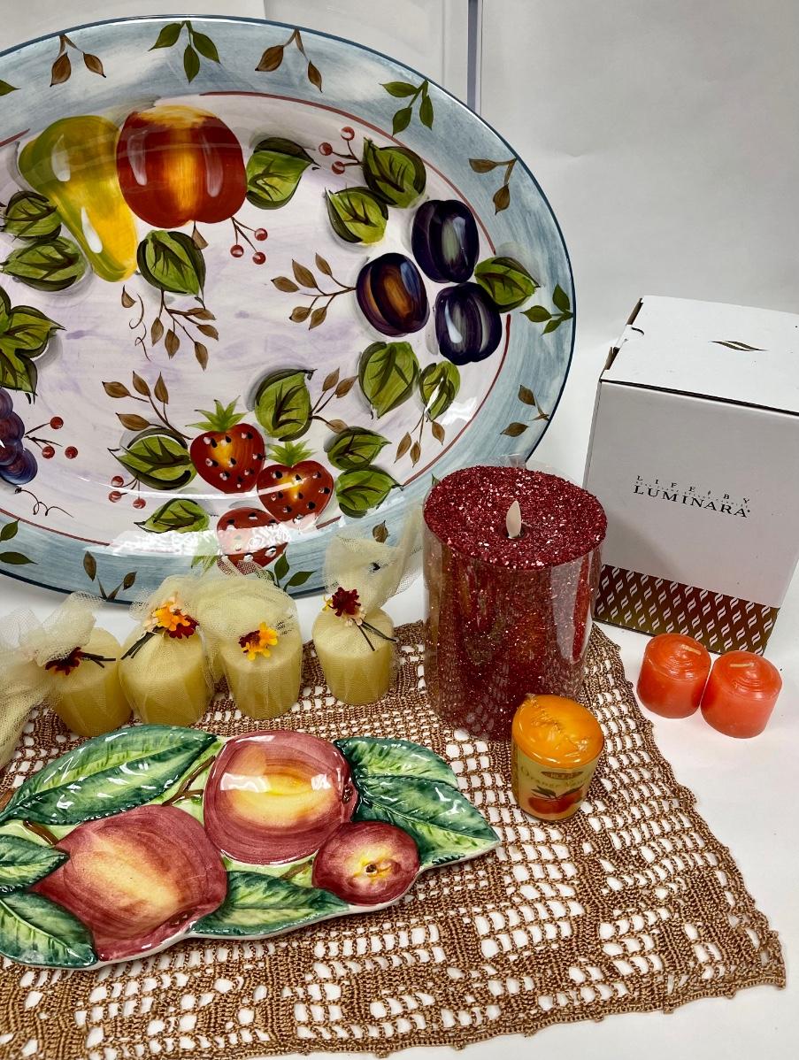 Home Decor Lot - Black Forest Fruits Platter, Majolica Fruit Serving Dish, Luminara Candles, Doily, Votive Candles
