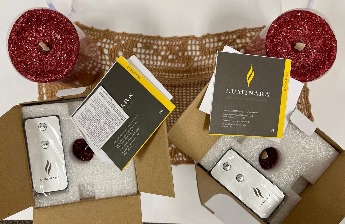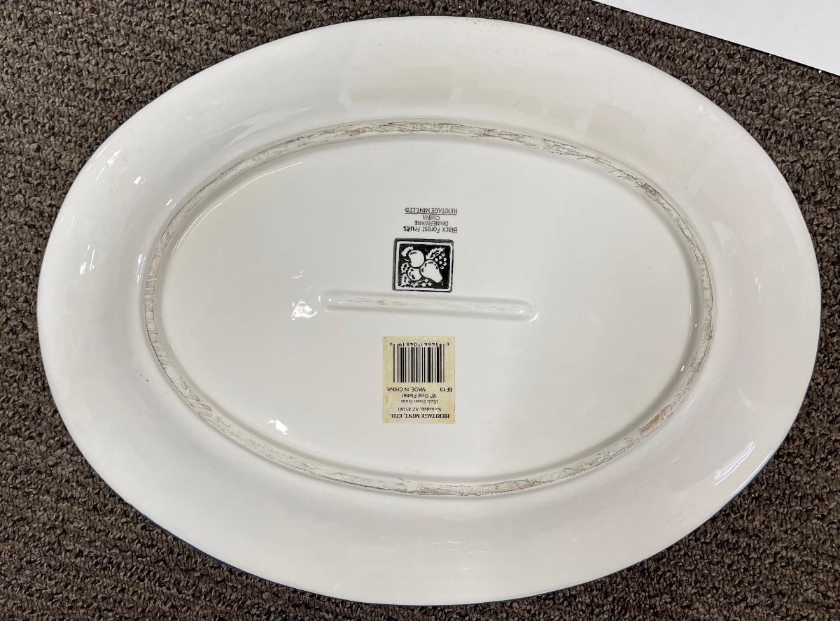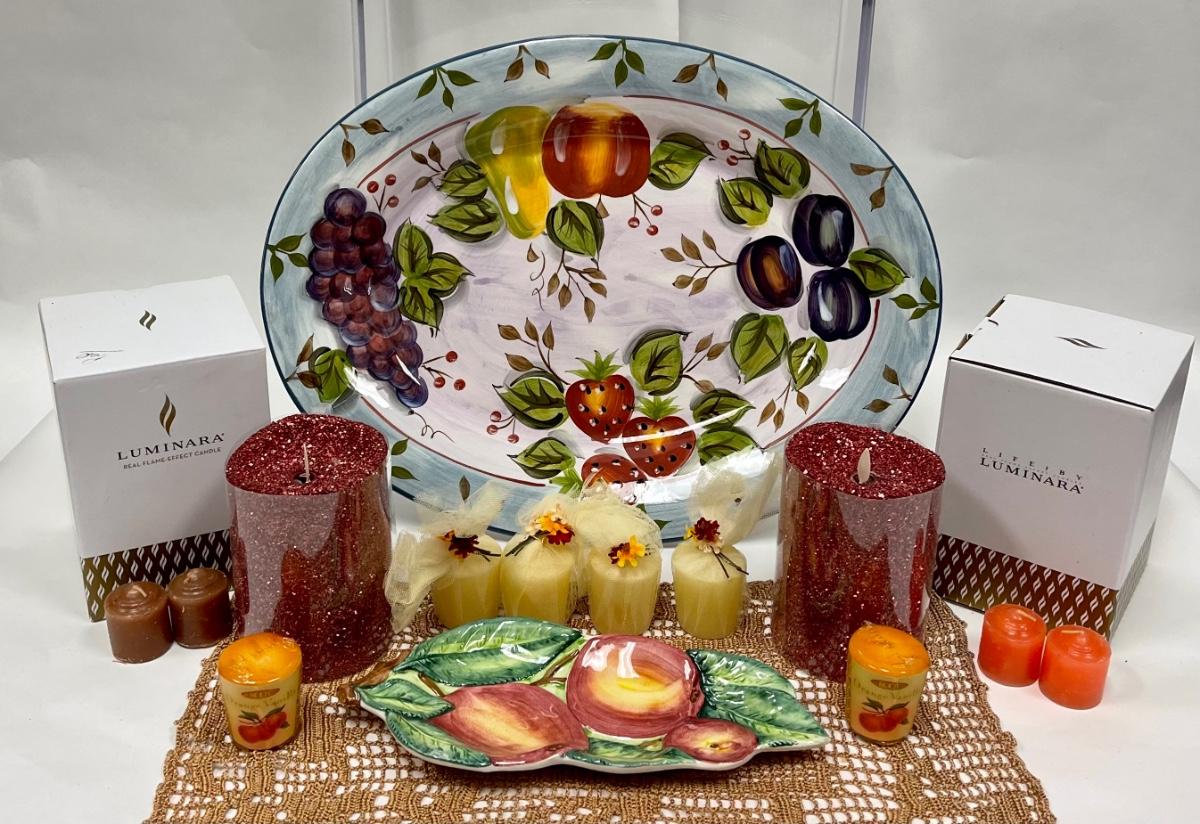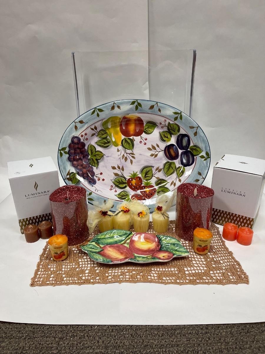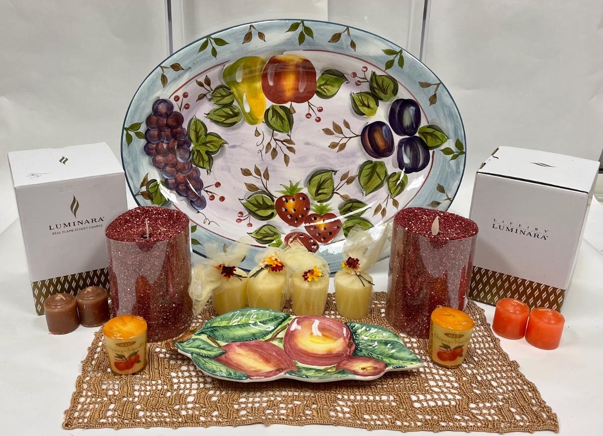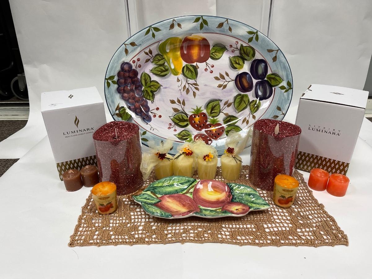 Large 15" Ceramic Platter by Heritage Mint, "Black Forest Fruits", small fruit majolica serving dish made in Italy 9", 4 Life by Luminara candles (2 outside of boxes without remotes and 2 in boxes with remotes)., 10 votive candles, 1 Dollie.