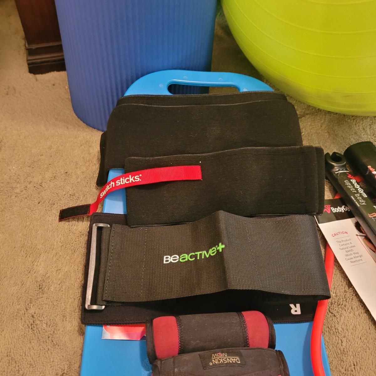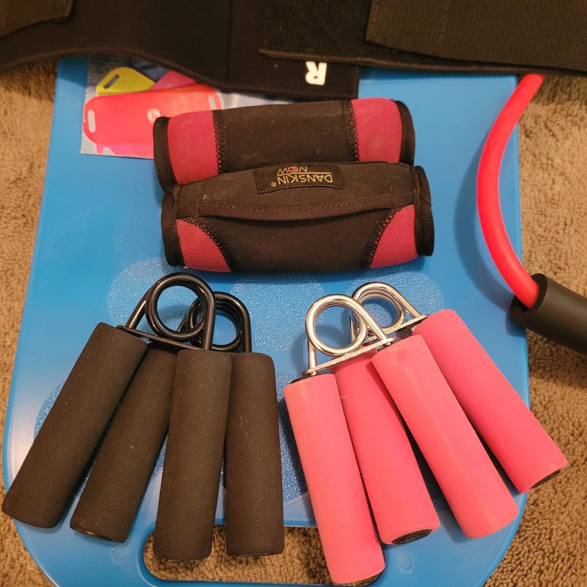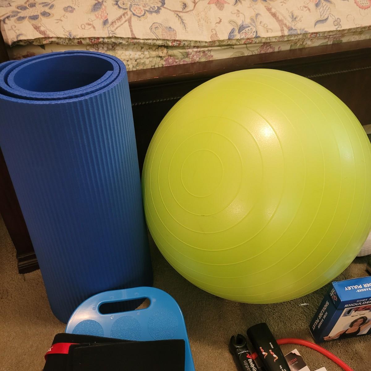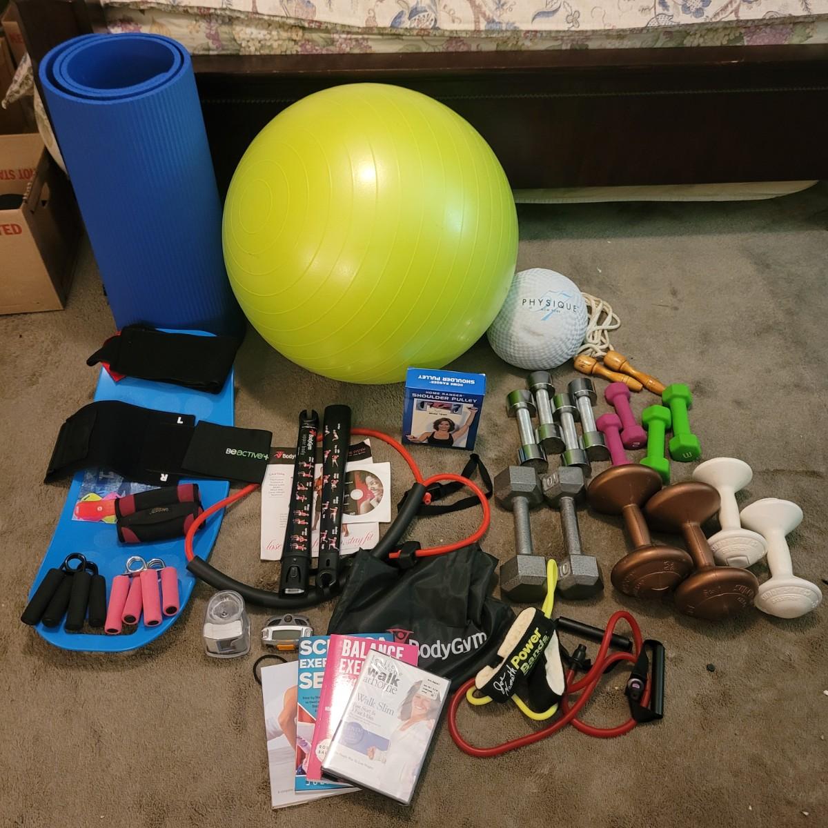 This assortment of home exercise equipment includes dumb bells, stability ball, yoga mat, tension bands, electronic blood pressure monitor (not tested), pedometer, hand grip trainers and much more. Local pickup only.