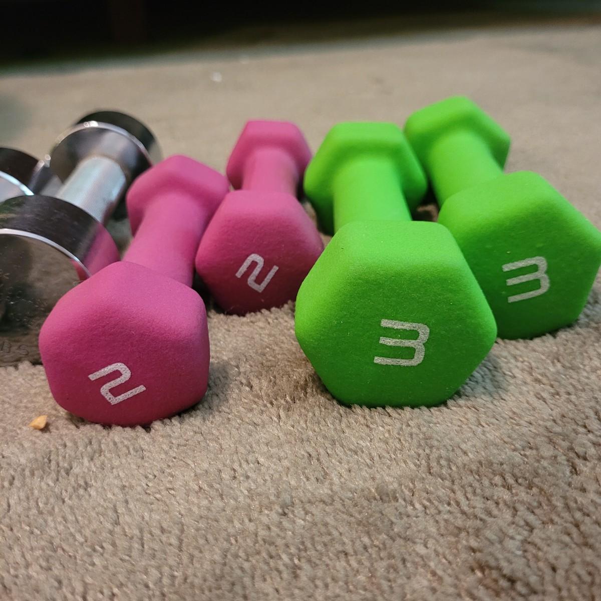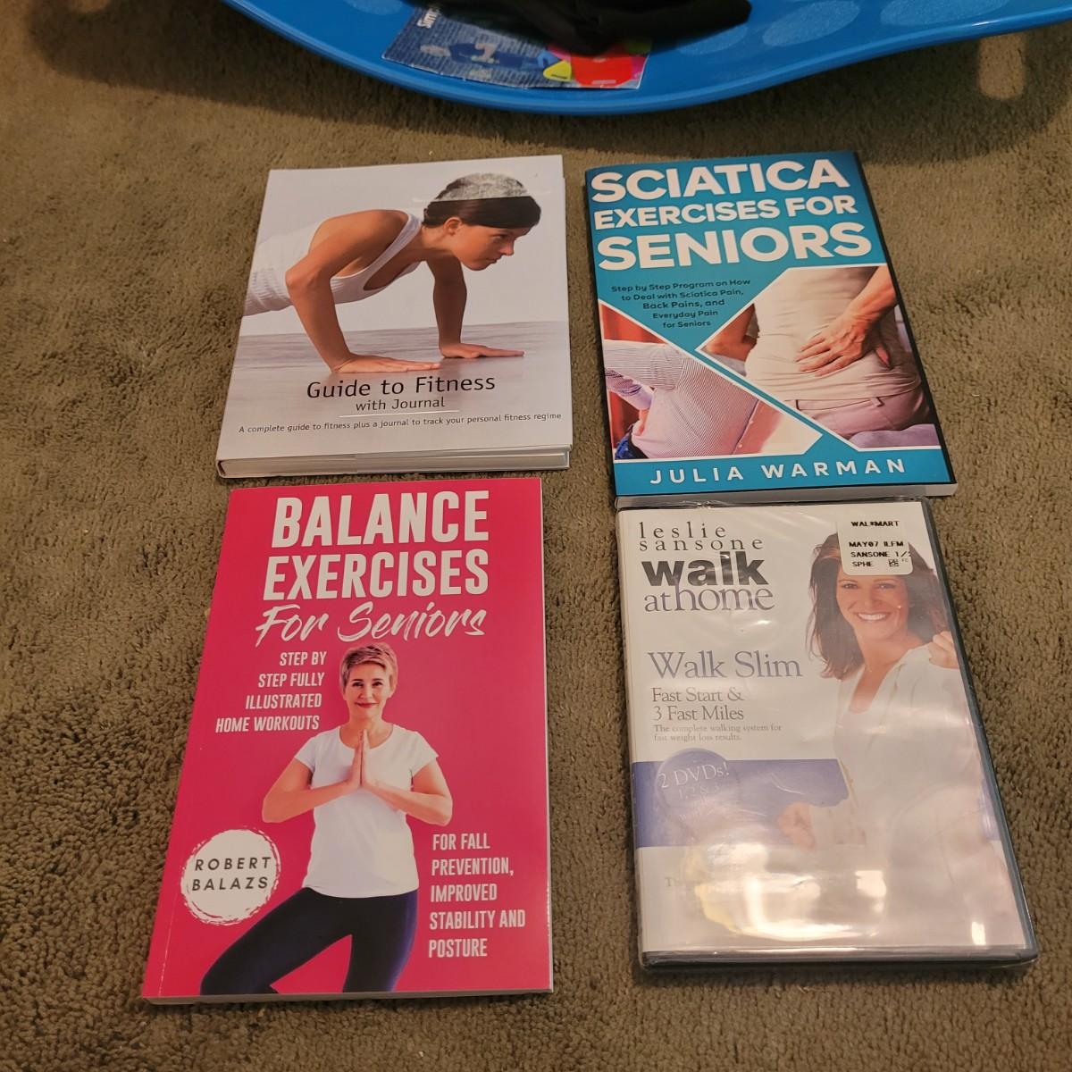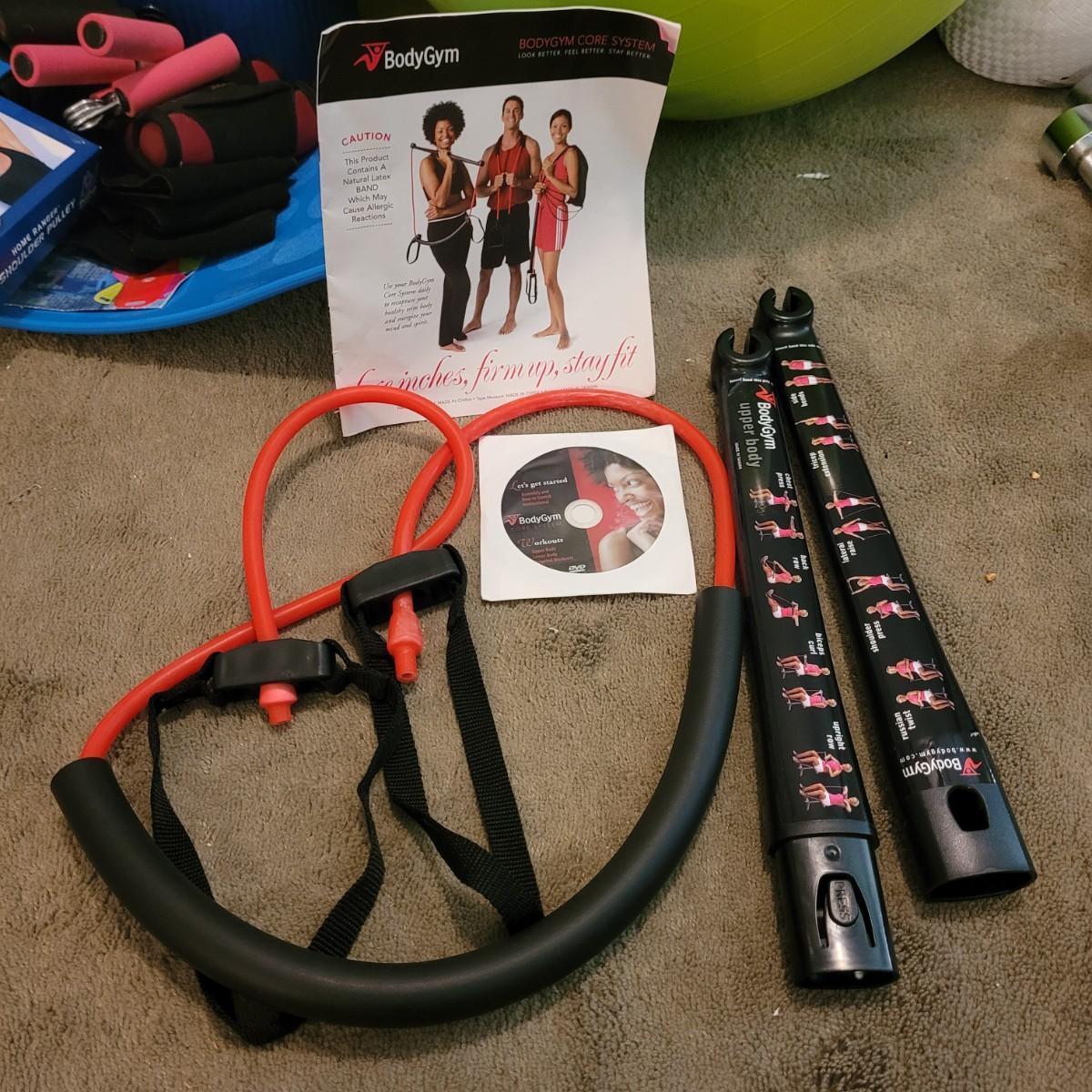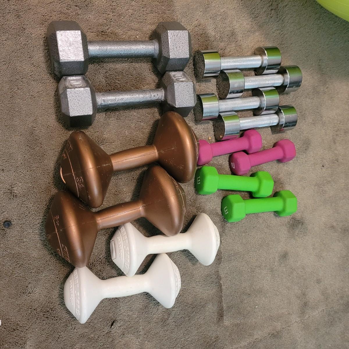 This assortment of home exercise equipment includes dumb bells, stability ball, yoga mat, tension bands, electronic blood pressure monitor (not tested), pedometer, hand grip trainers and much more. Local pickup only.