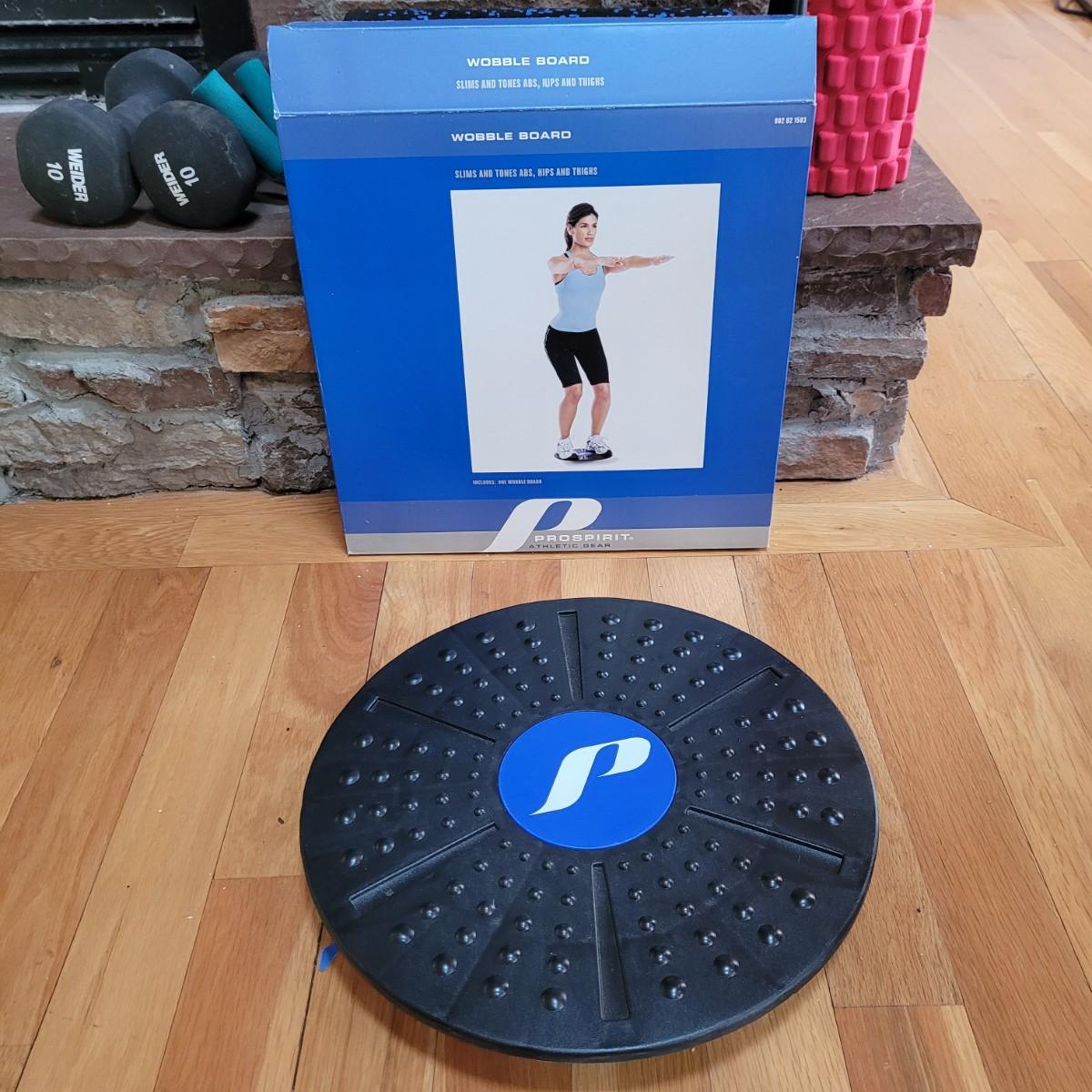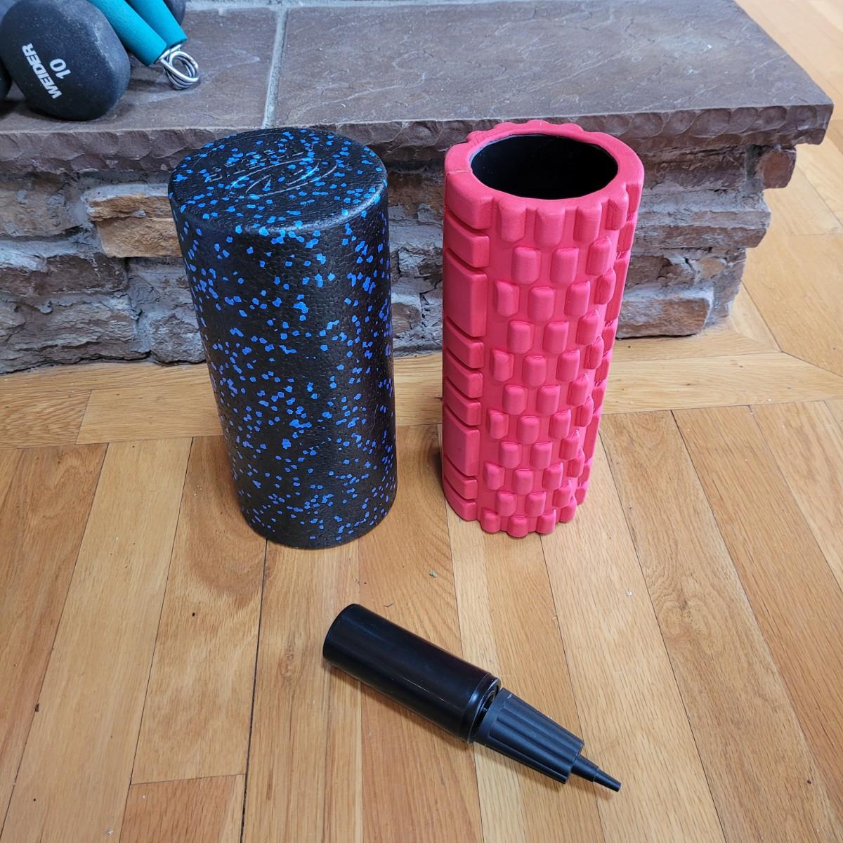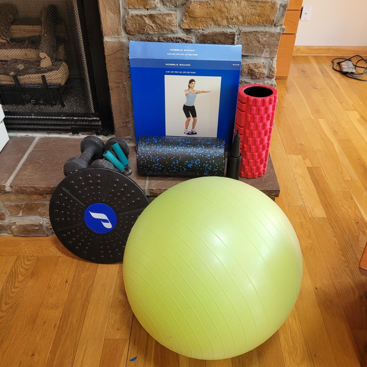 A nice collection of home gym exercise equipment, including a stability ball with pump, two 10lb dumbbells, a handgrip strengthener, wobble board and two foam rollers. Local pickup only.