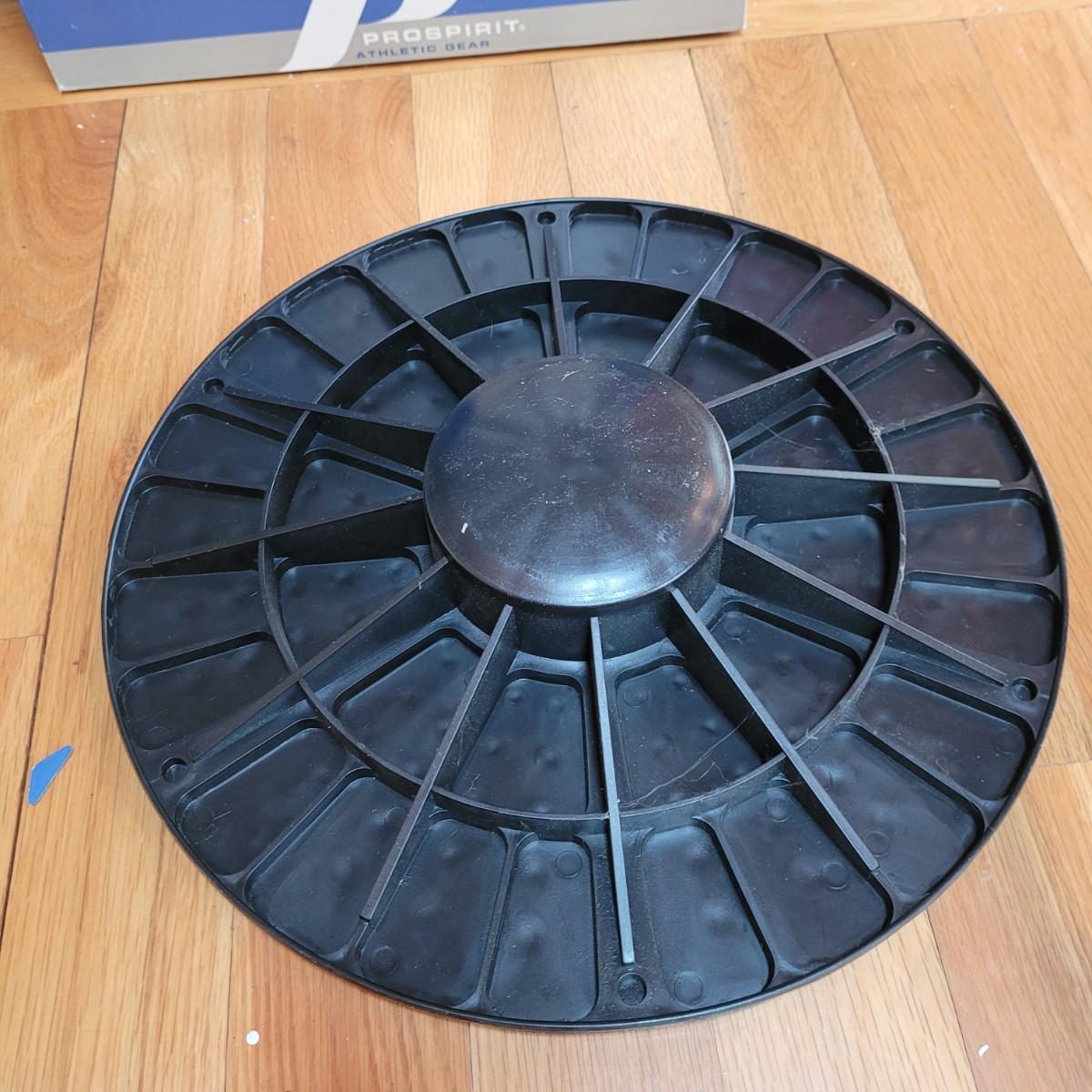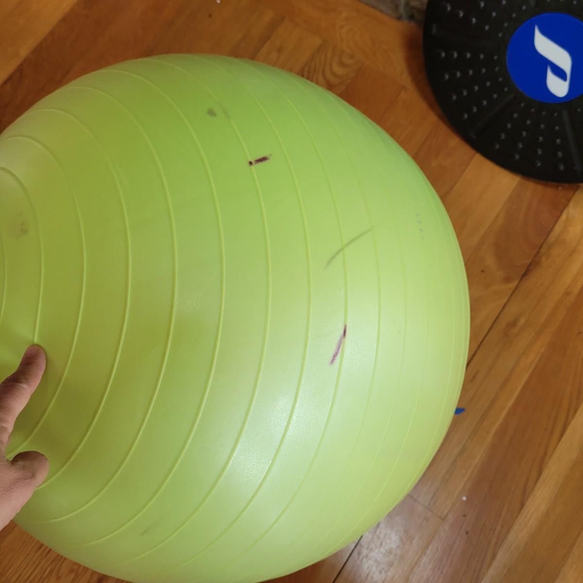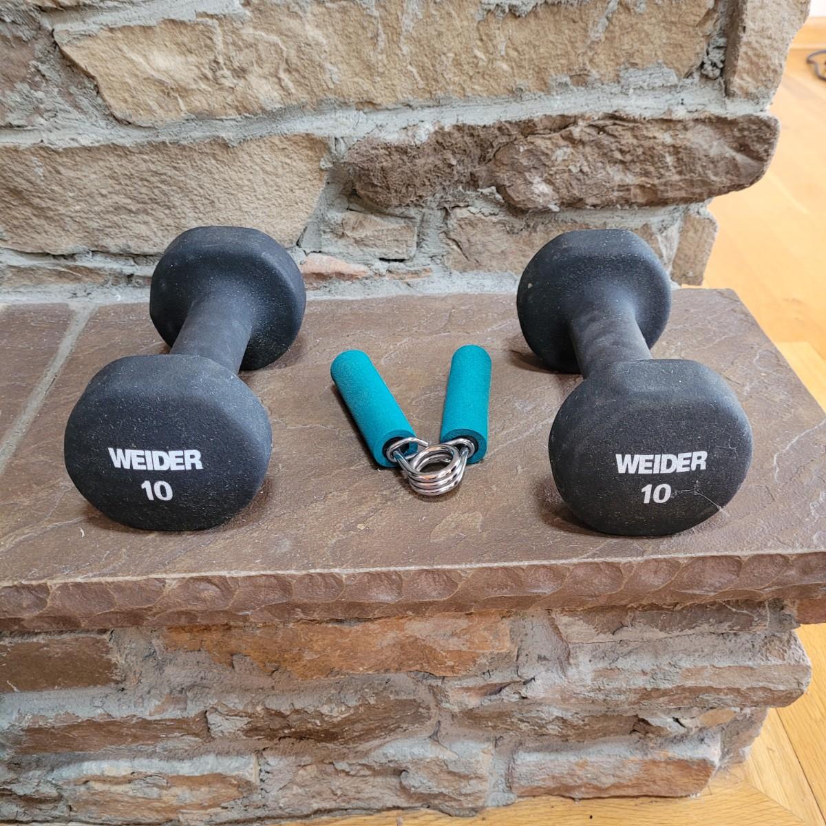 A nice collection of home gym exercise equipment, including a stability ball with pump, two 10lb dumbbells, a handgrip strengthener, wobble board and two foam rollers. Local pickup only.