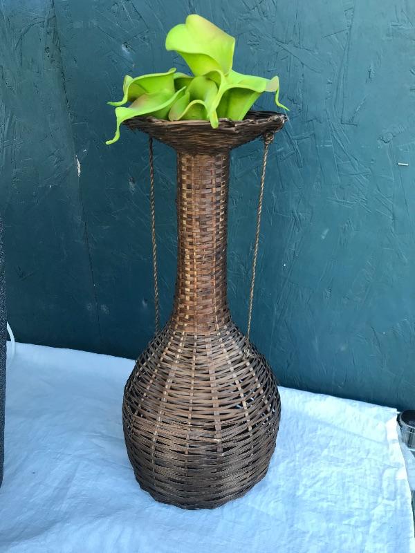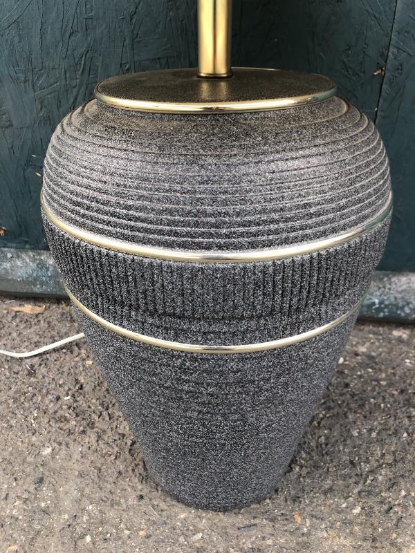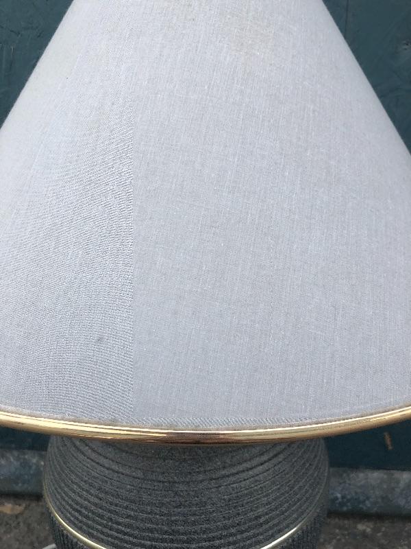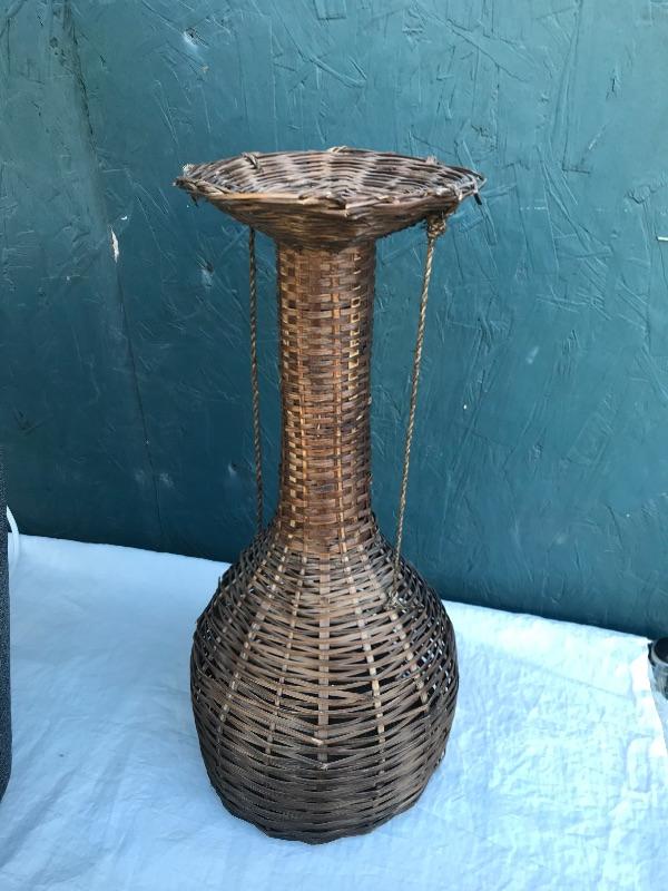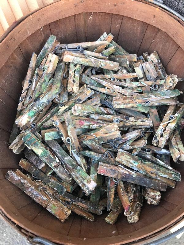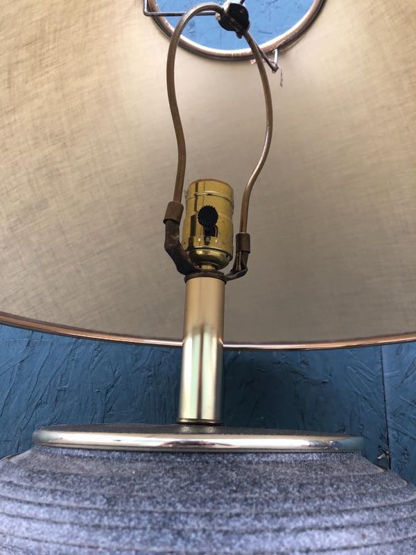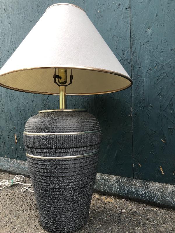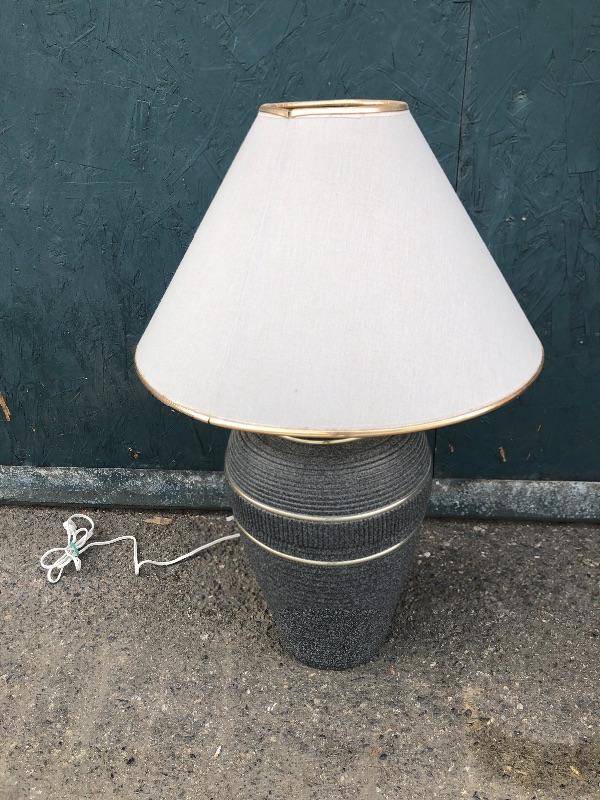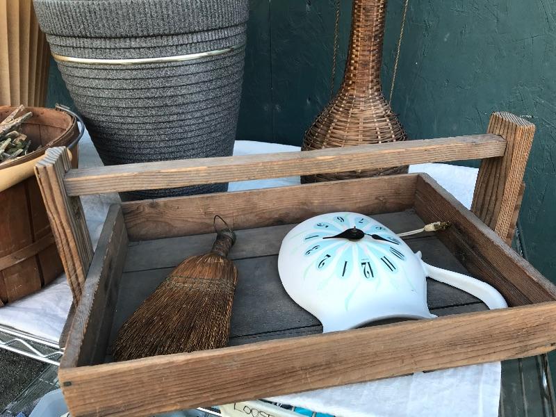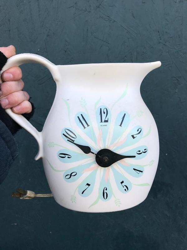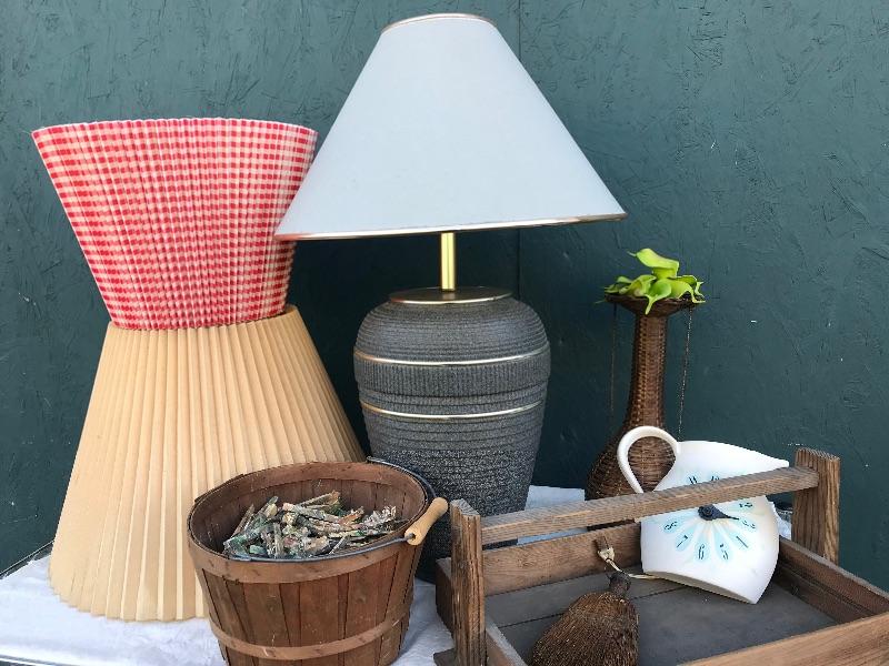 Grey lamp is 29.5" H. It is in great condition! The basket of clothes pins were used by an artist to hold their canvases and are now covered in a very cool finish of layered paint. Mid century ceramic pitcher clock is so cute! Wicker vase is 15"H.