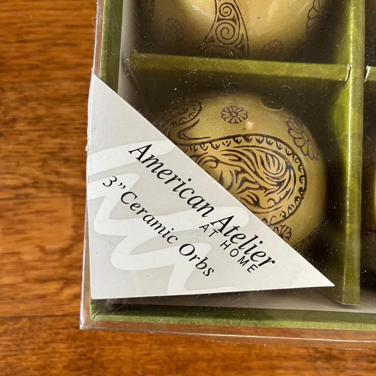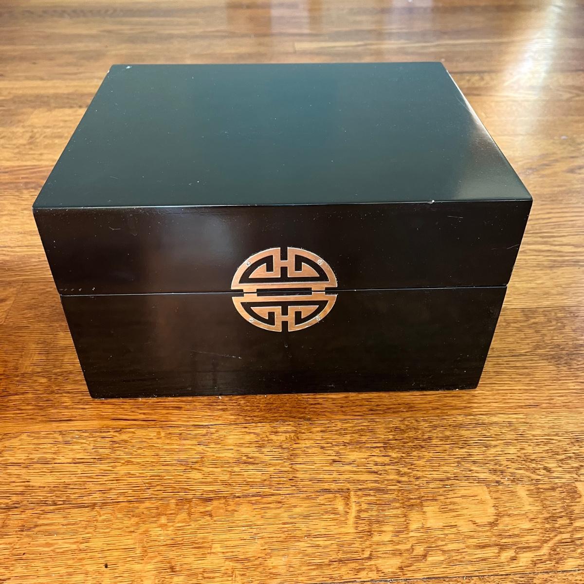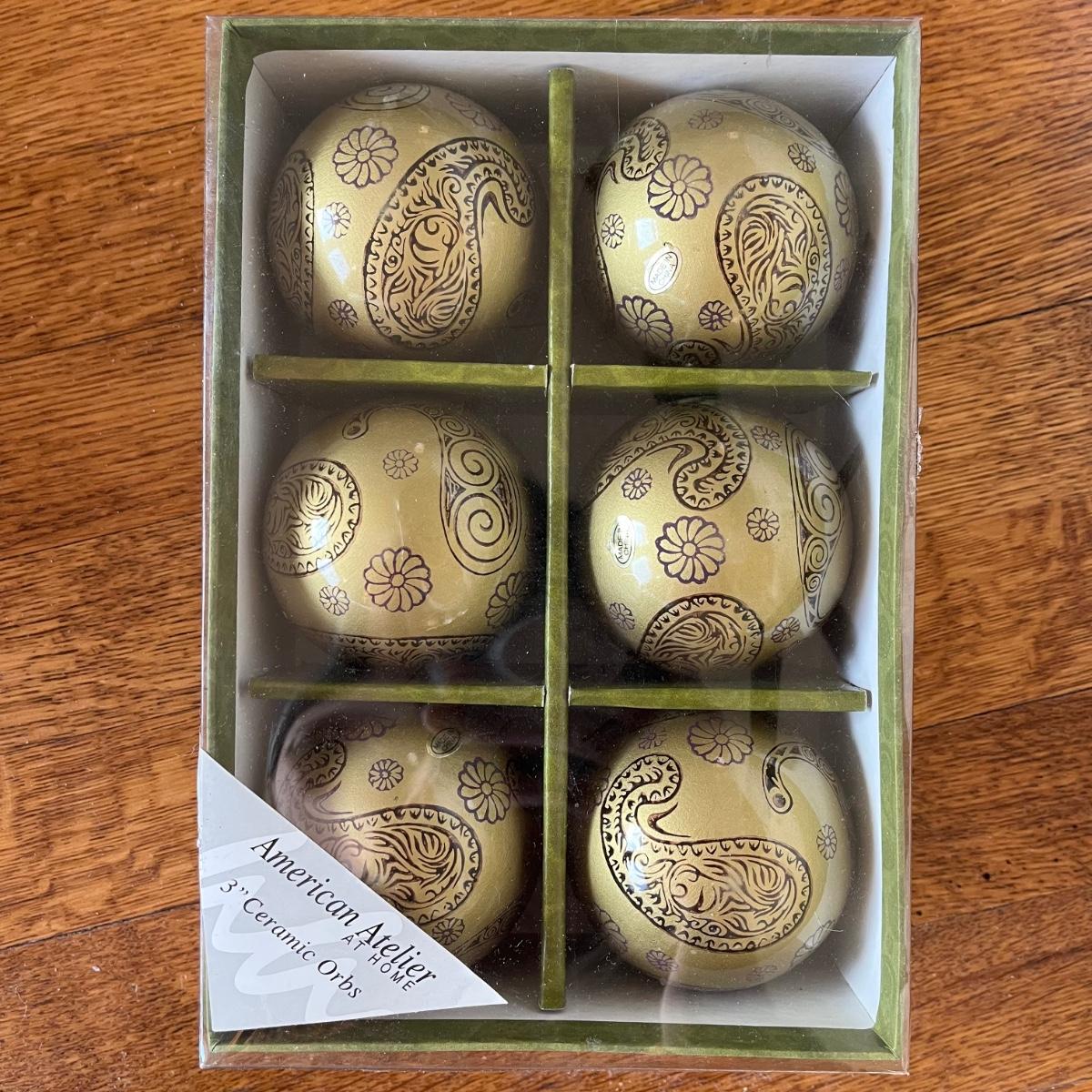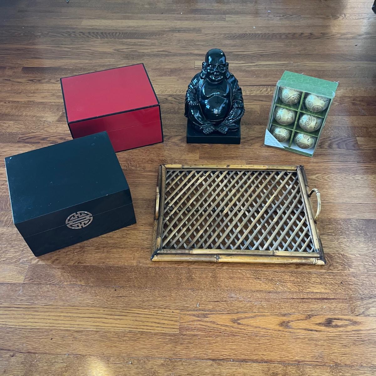 Collection of five Asian themed home decor items. One handled bamboo tray (measuring 14” x 19”), a black resin Buddha, gold paisley ceramic orbs in the original box and two decorative resin boxes (both measuring approx 14” x 18”). Shipping available.