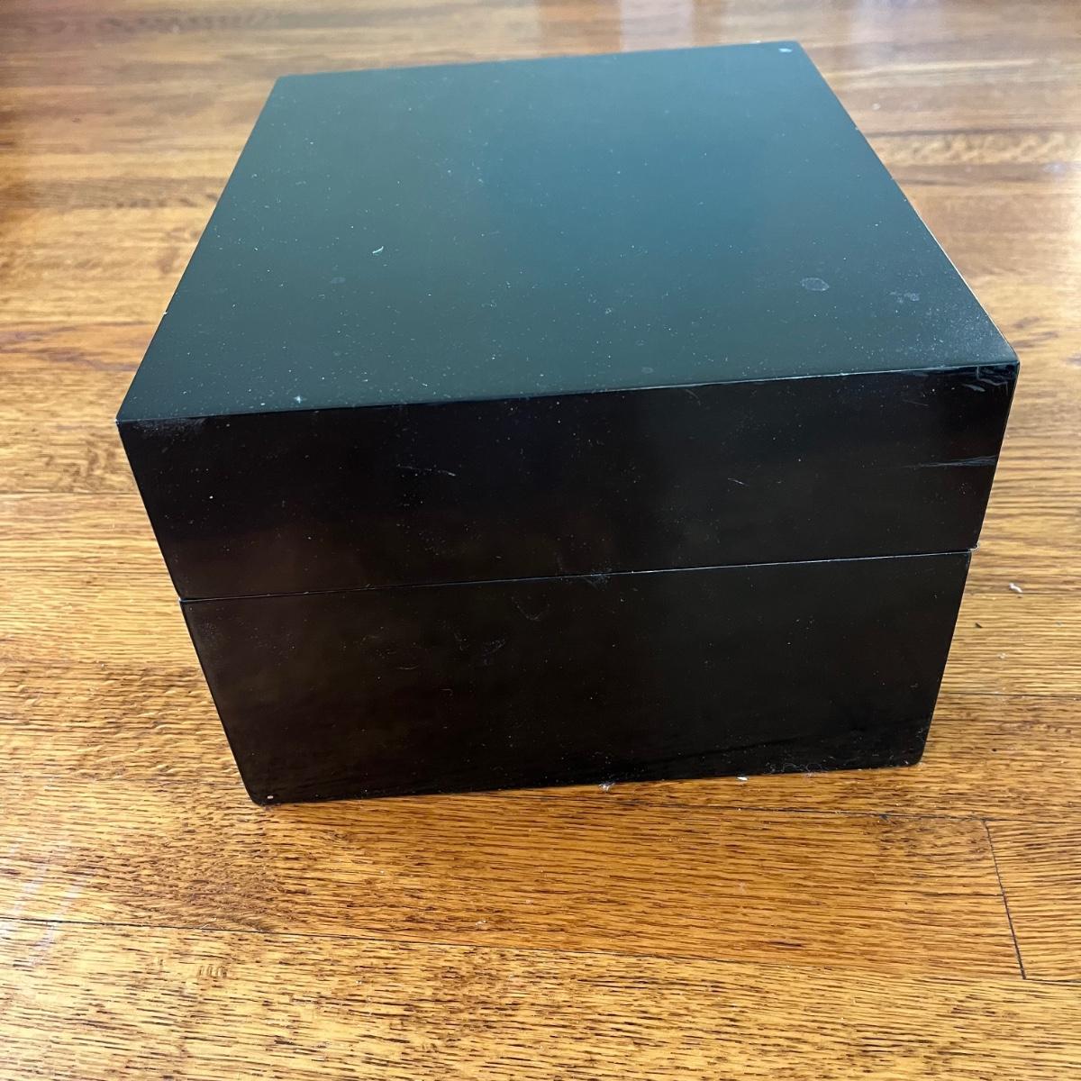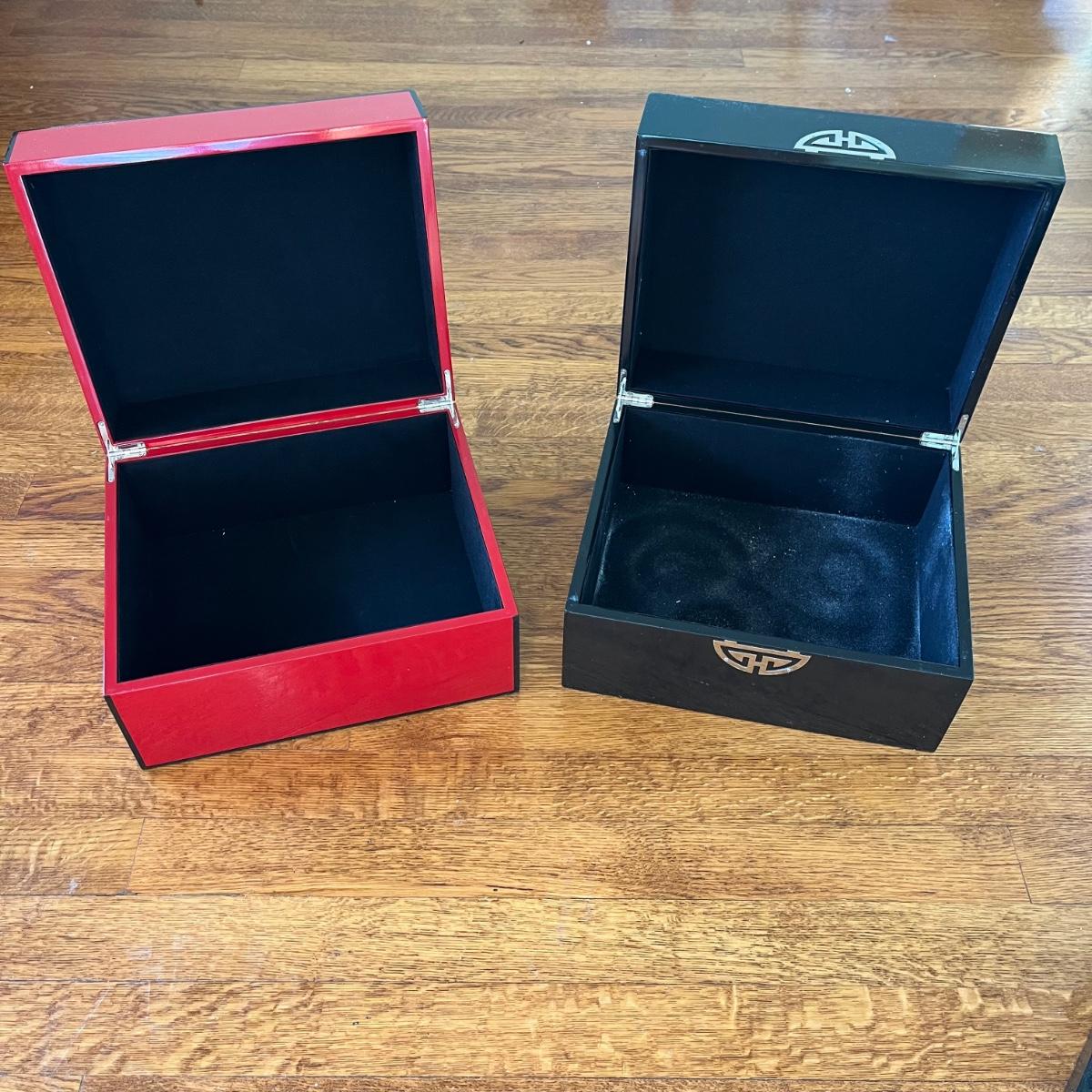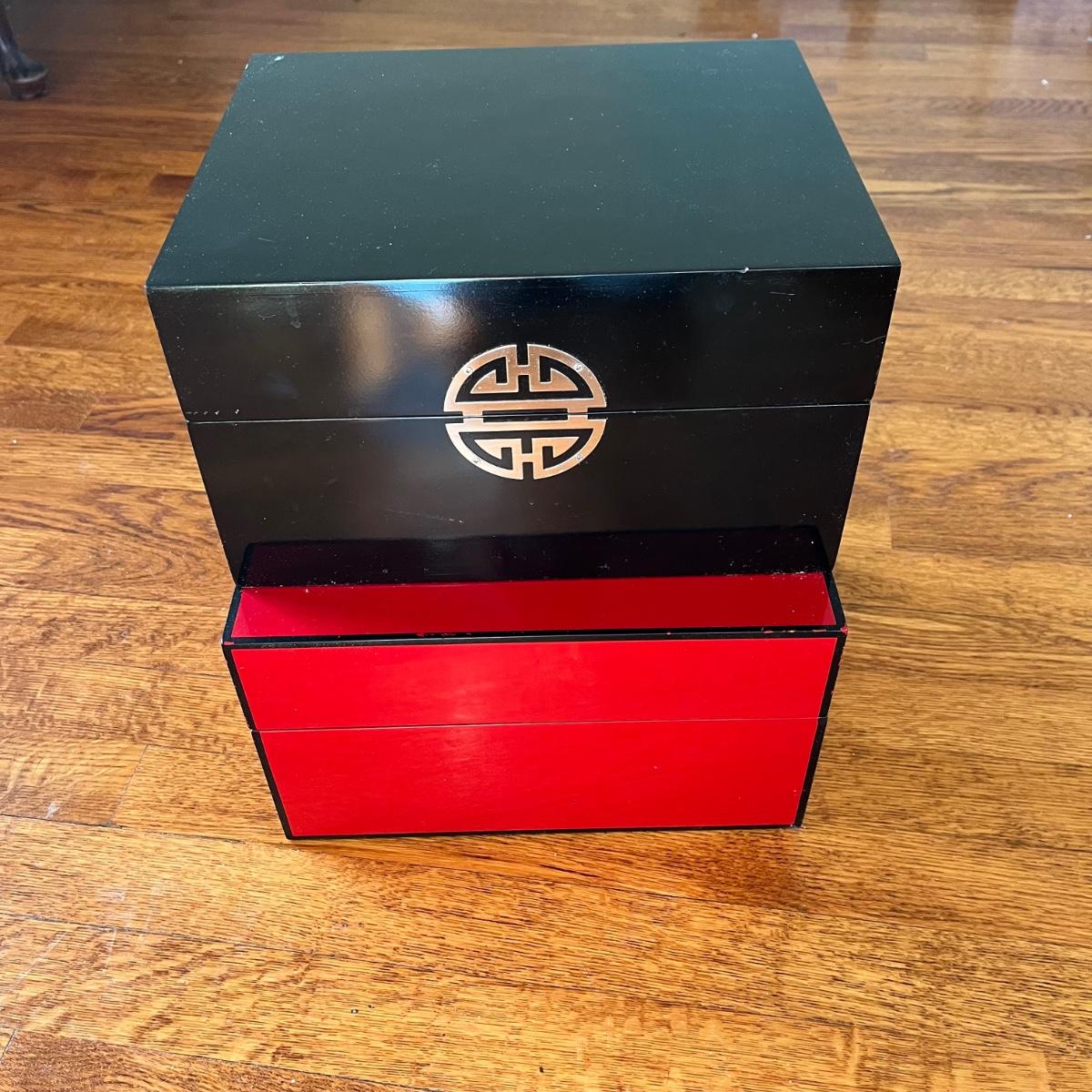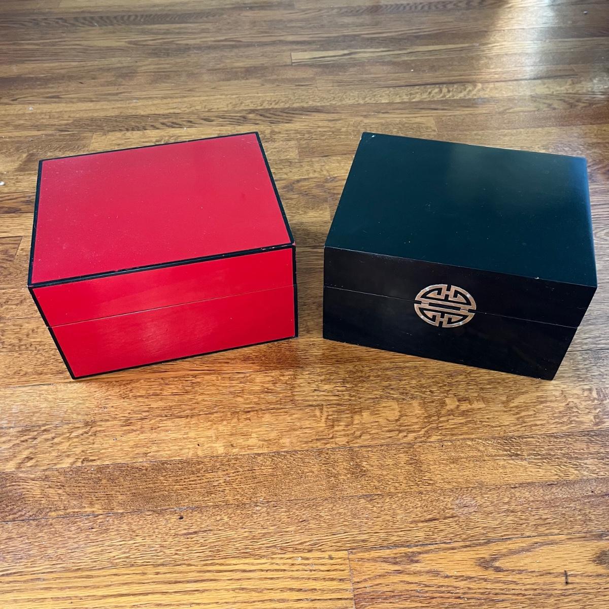 Collection of five Asian themed home decor items. One handled bamboo tray (measuring 14” x 19”), a black resin Buddha, gold paisley ceramic orbs in the original box and two decorative resin boxes (both measuring approx 14” x 18”). Shipping available.