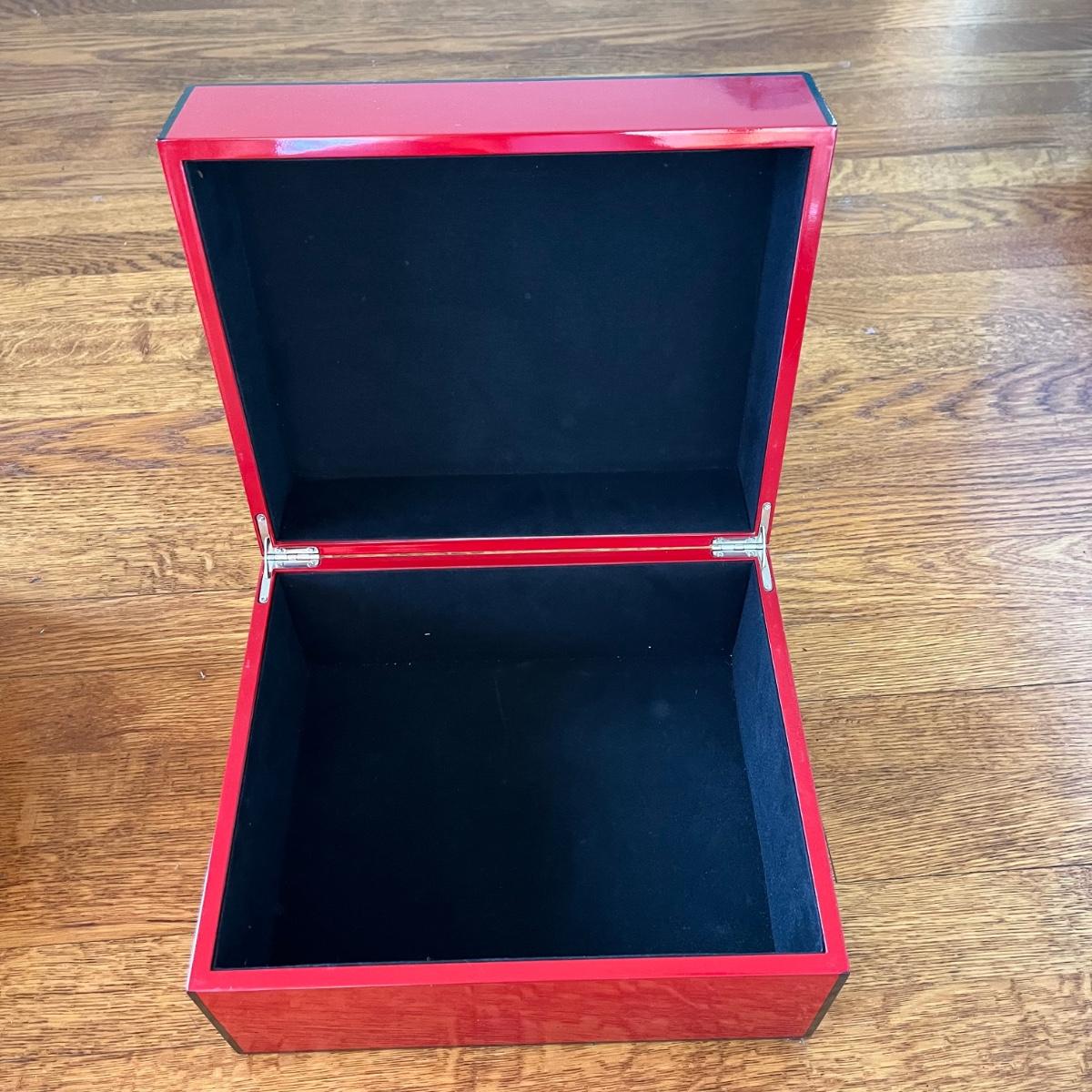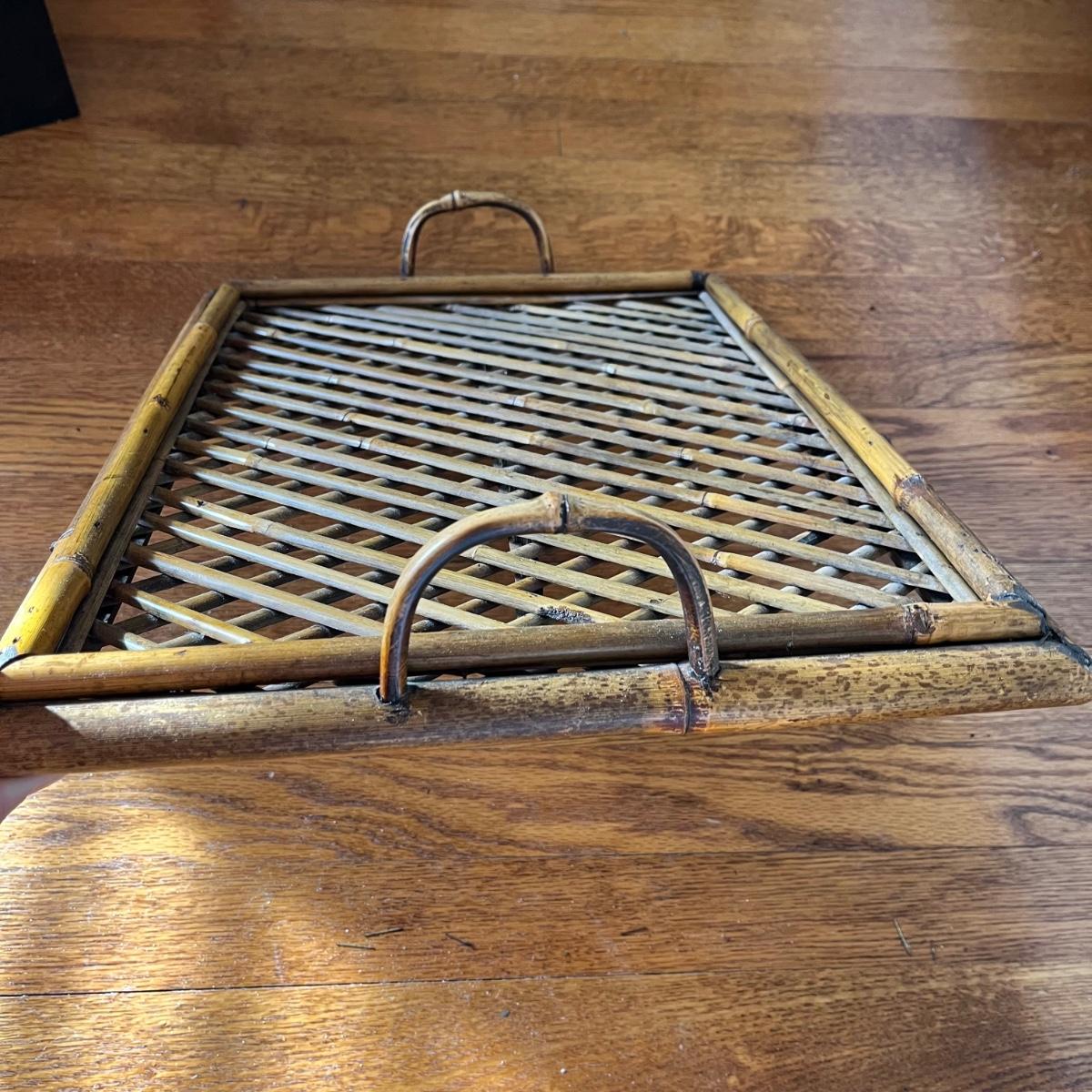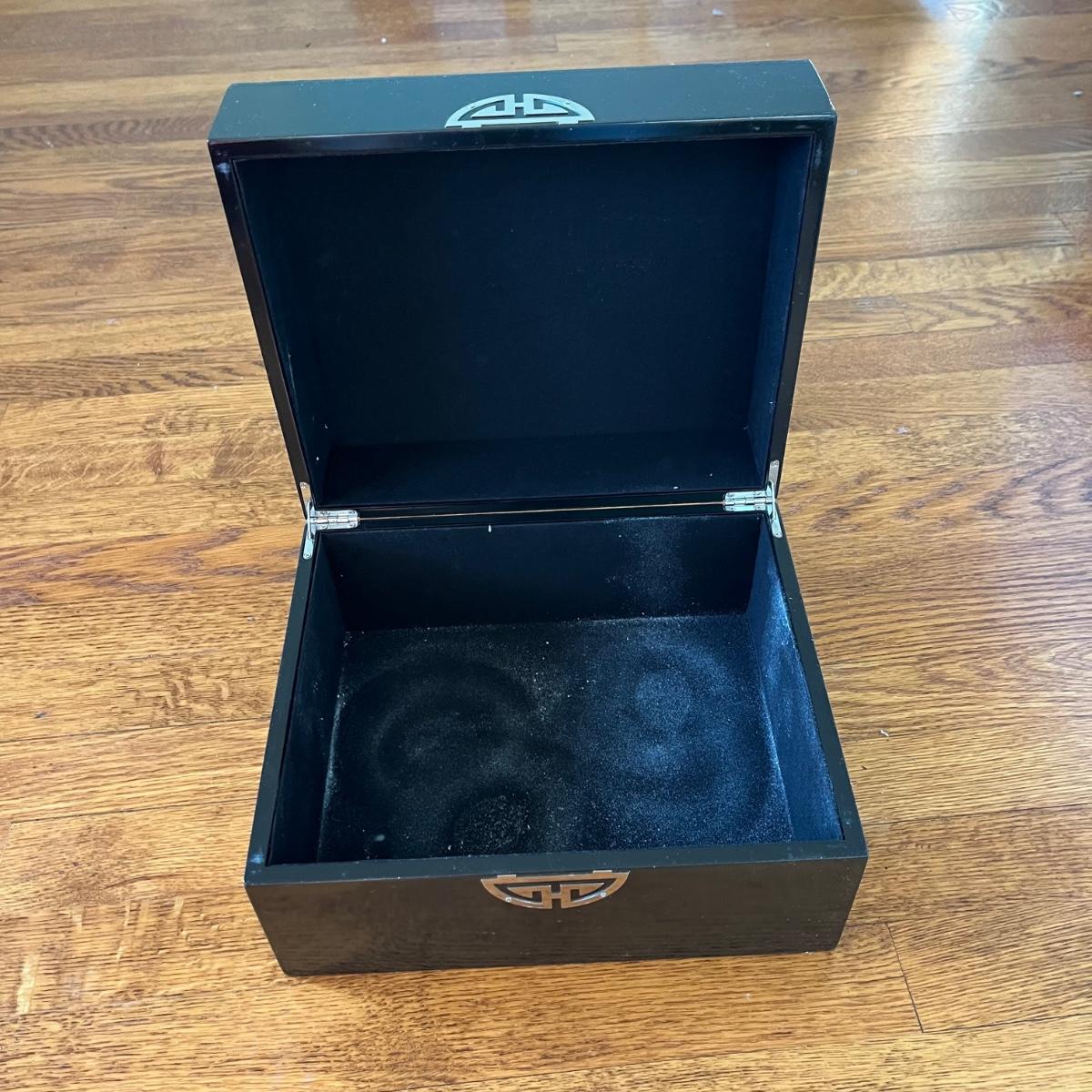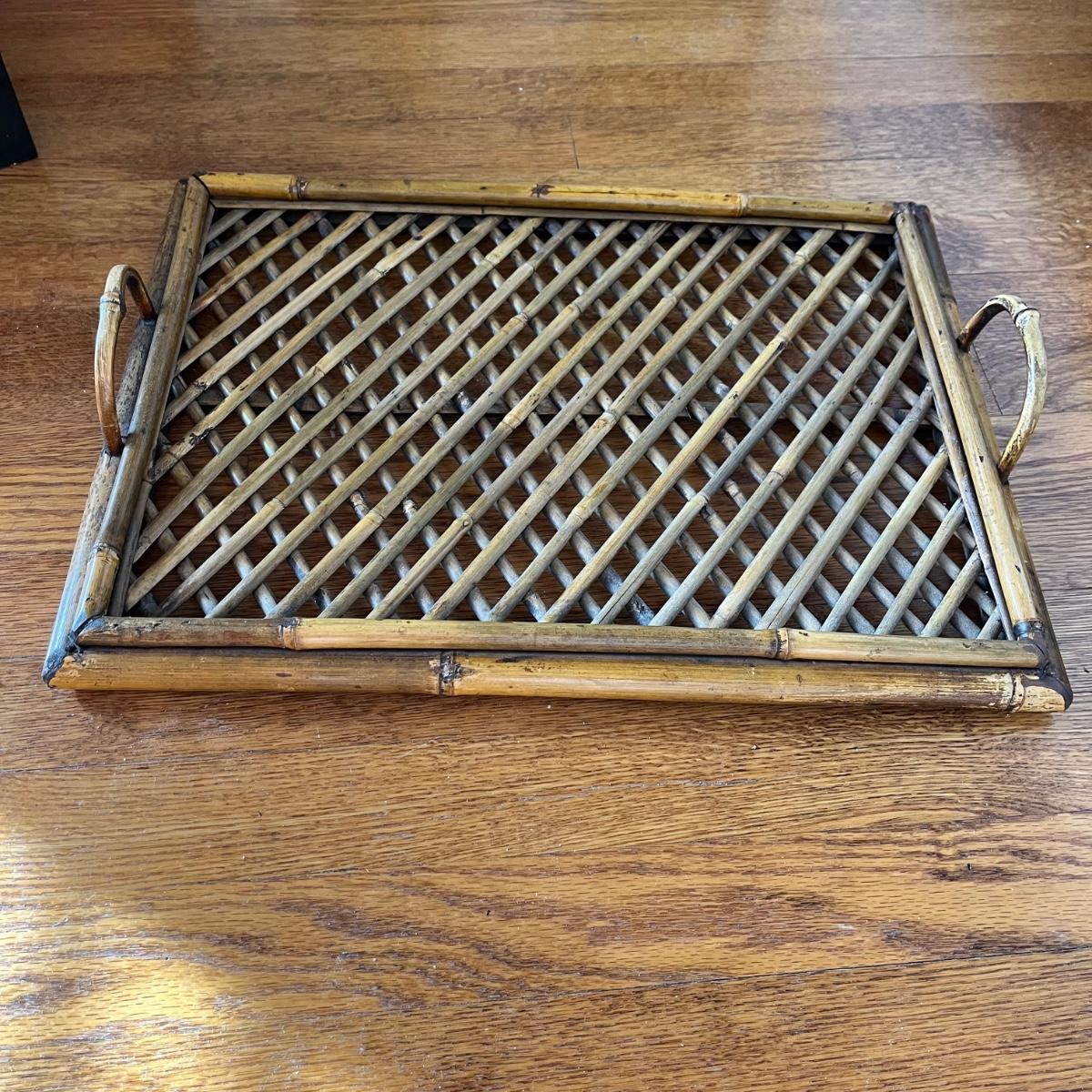 Collection of five Asian themed home decor items. One handled bamboo tray (measuring 14” x 19”), a black resin Buddha, gold paisley ceramic orbs in the original box and two decorative resin boxes (both measuring approx 14” x 18”). Shipping available.