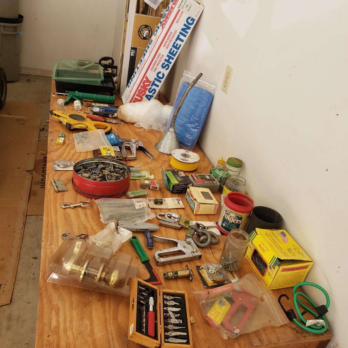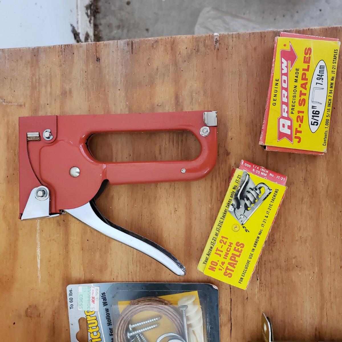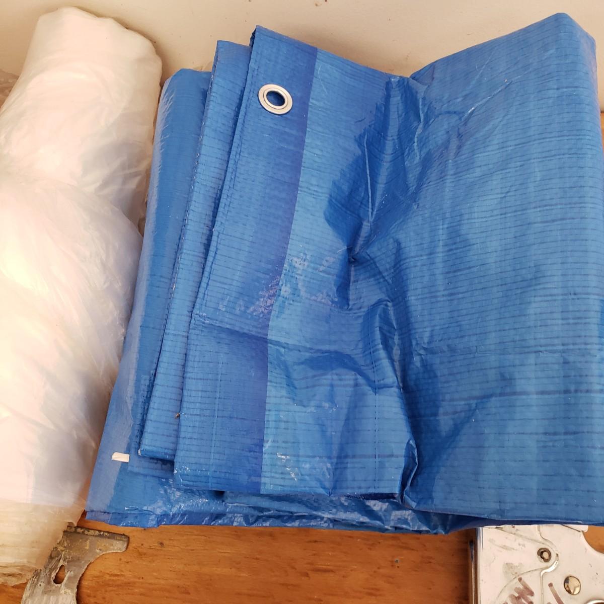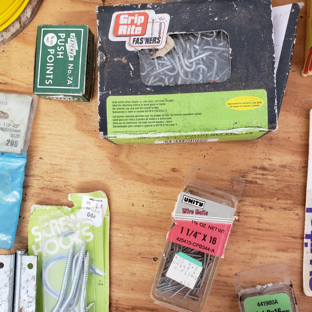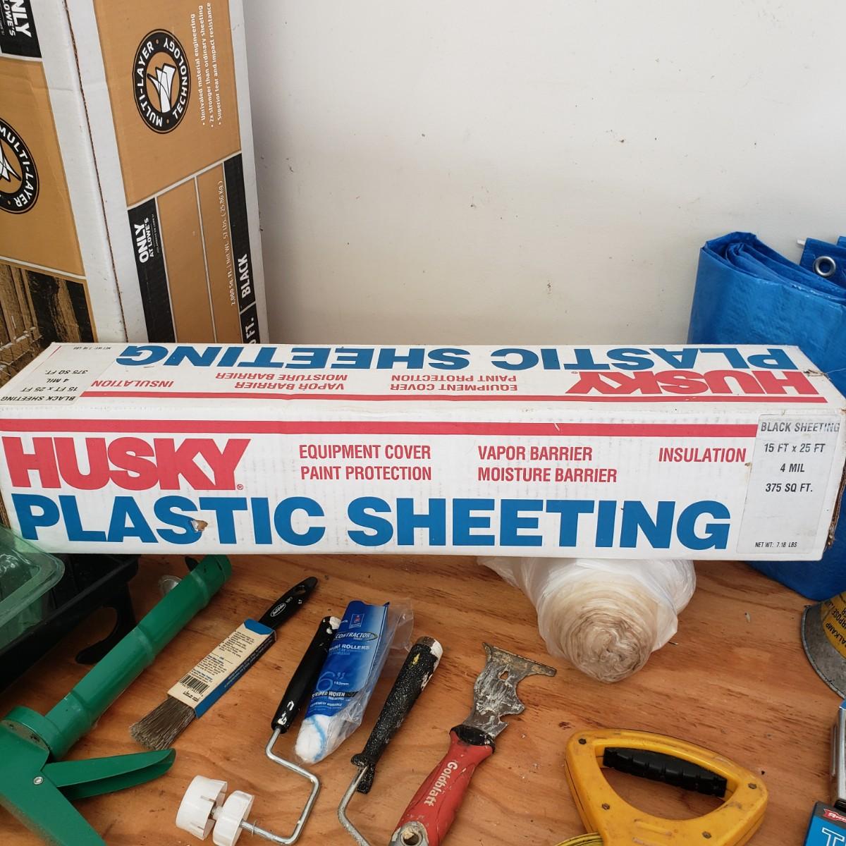 This lot has several pieces of home hardware including nails, screws and three staple guns with staples. There is an Exacto knife kit in a box and painting supplies. New in the box Husky plastic sheeting, see picture for details. Also included is a small blue tarp and a roll of thin clear plastic sheeting. Finally, a large box of thick plastic sheeting, see pictures for details.