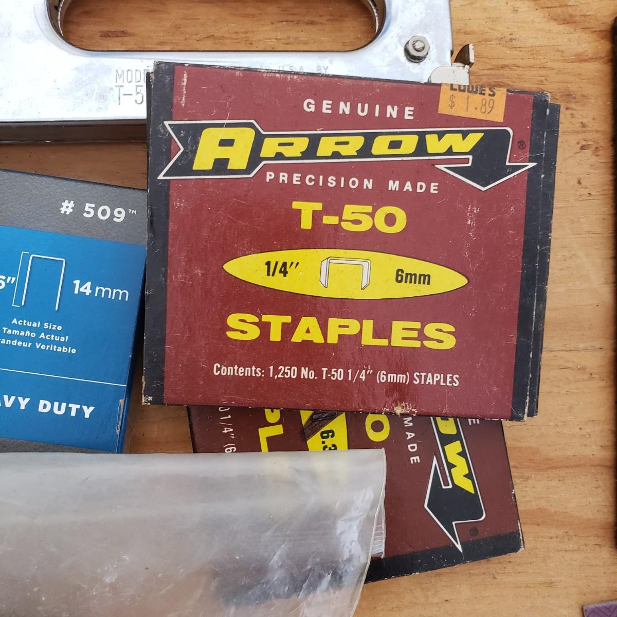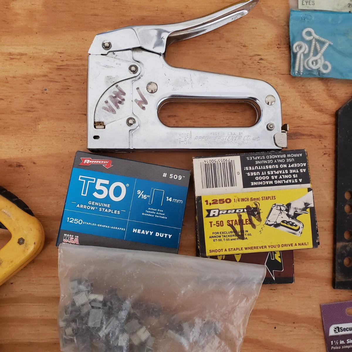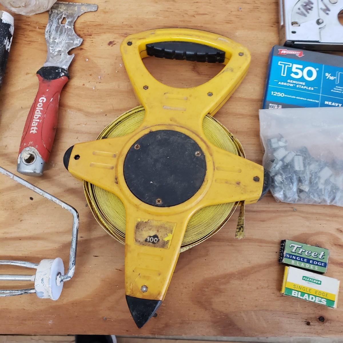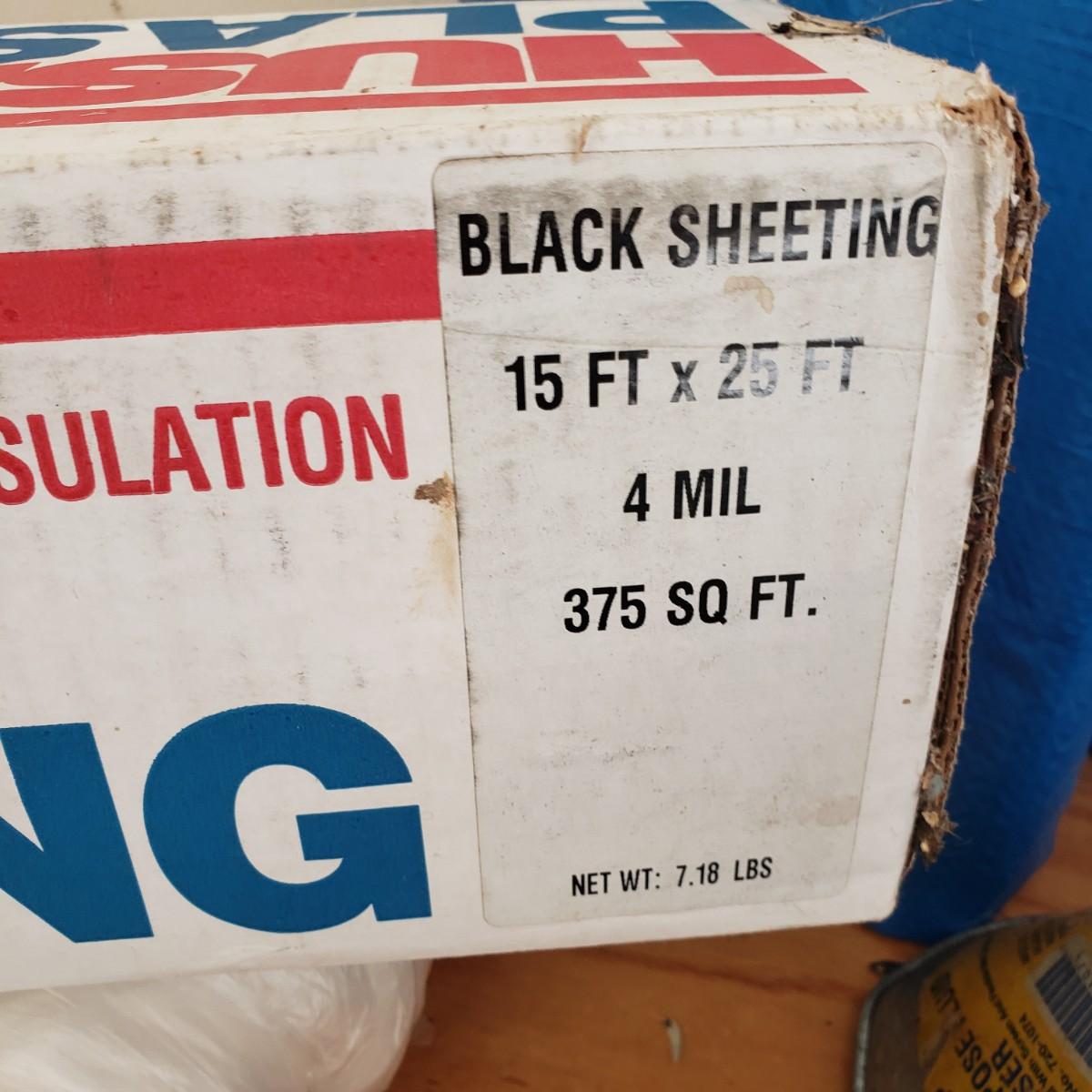 This lot has several pieces of home hardware including nails, screws and three staple guns with staples. There is an Exacto knife kit in a box and painting supplies. New in the box Husky plastic sheeting, see picture for details. Also included is a small blue tarp and a roll of thin clear plastic sheeting. Finally, a large box of thick plastic sheeting, see pictures for details.