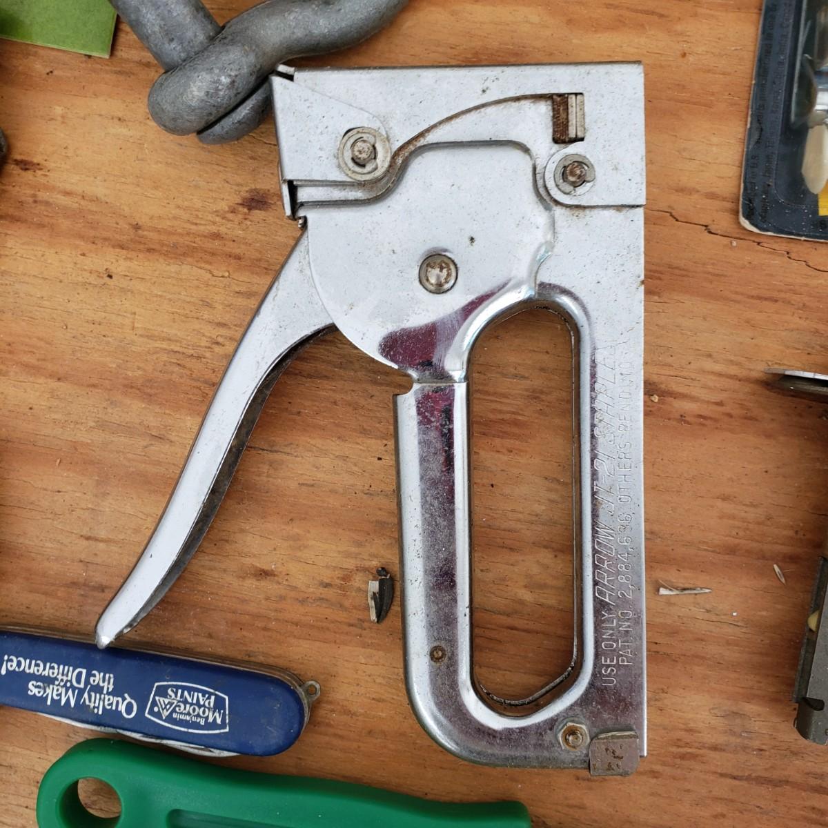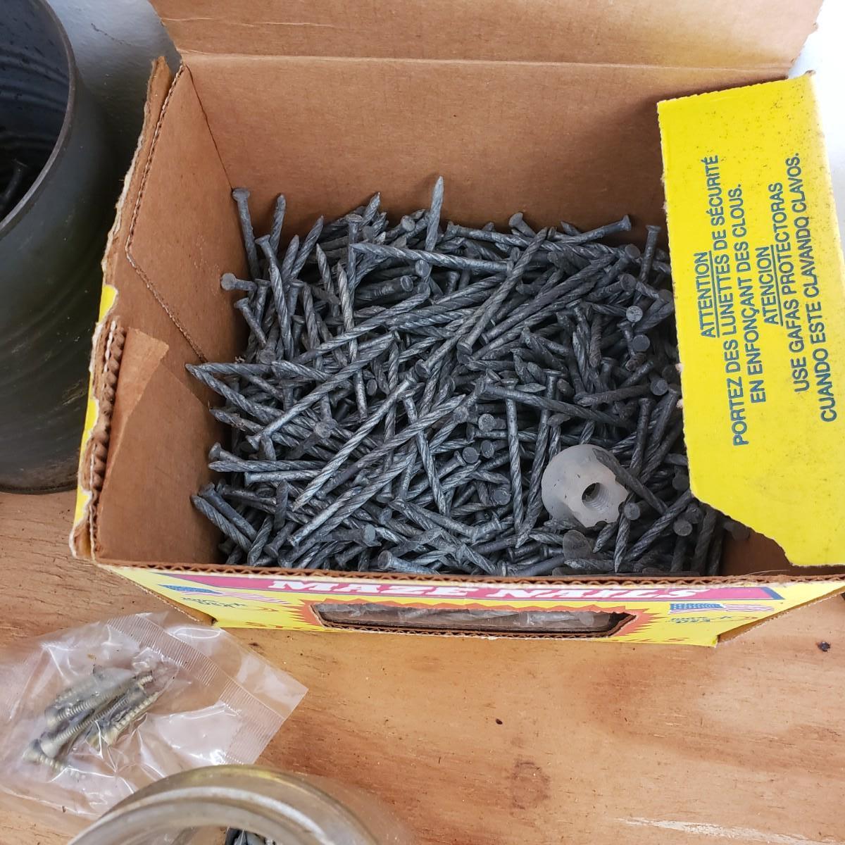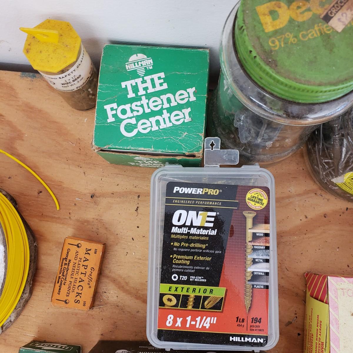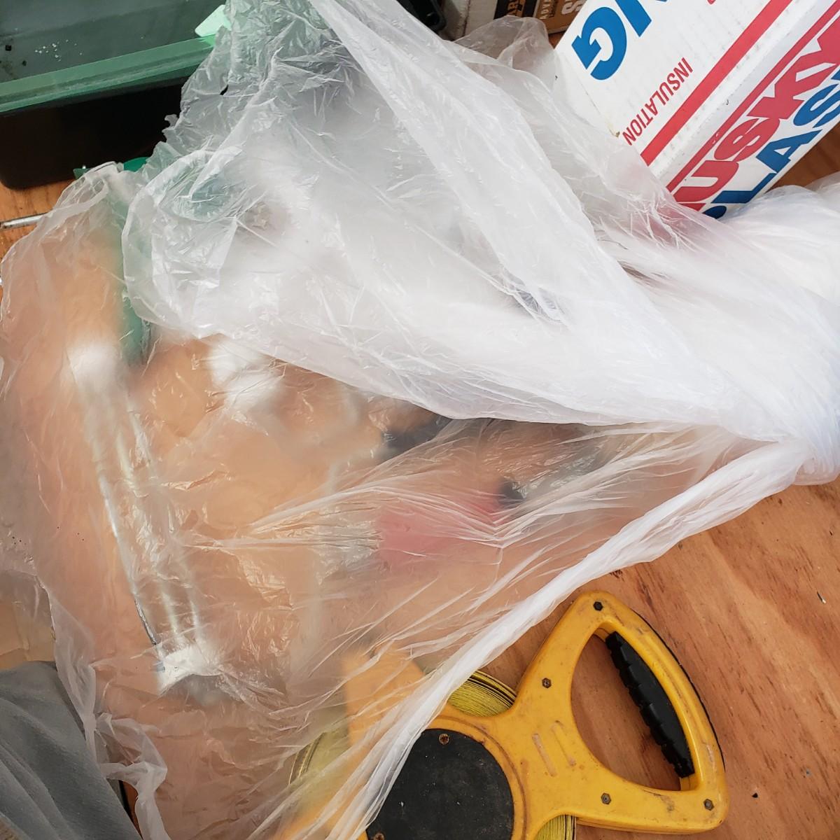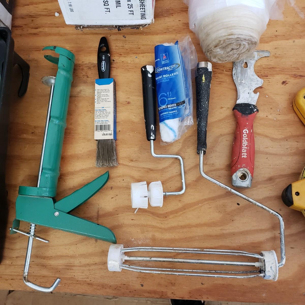 This lot has several pieces of home hardware including nails, screws and three staple guns with staples. There is an Exacto knife kit in a box and painting supplies. New in the box Husky plastic sheeting, see picture for details. Also included is a small blue tarp and a roll of thin clear plastic sheeting. Finally, a large box of thick plastic sheeting, see pictures for details.