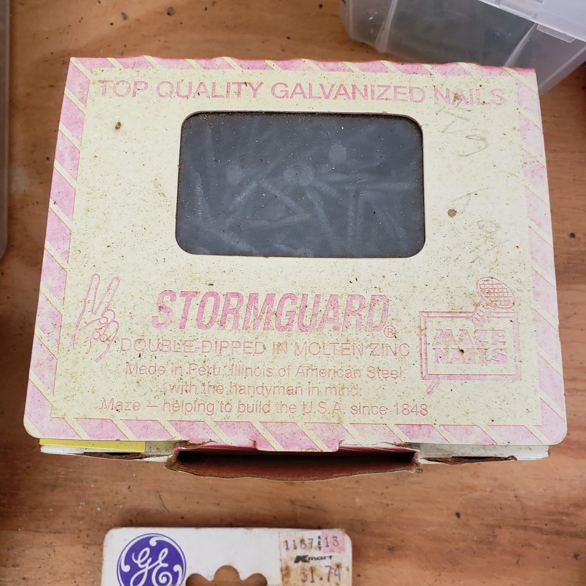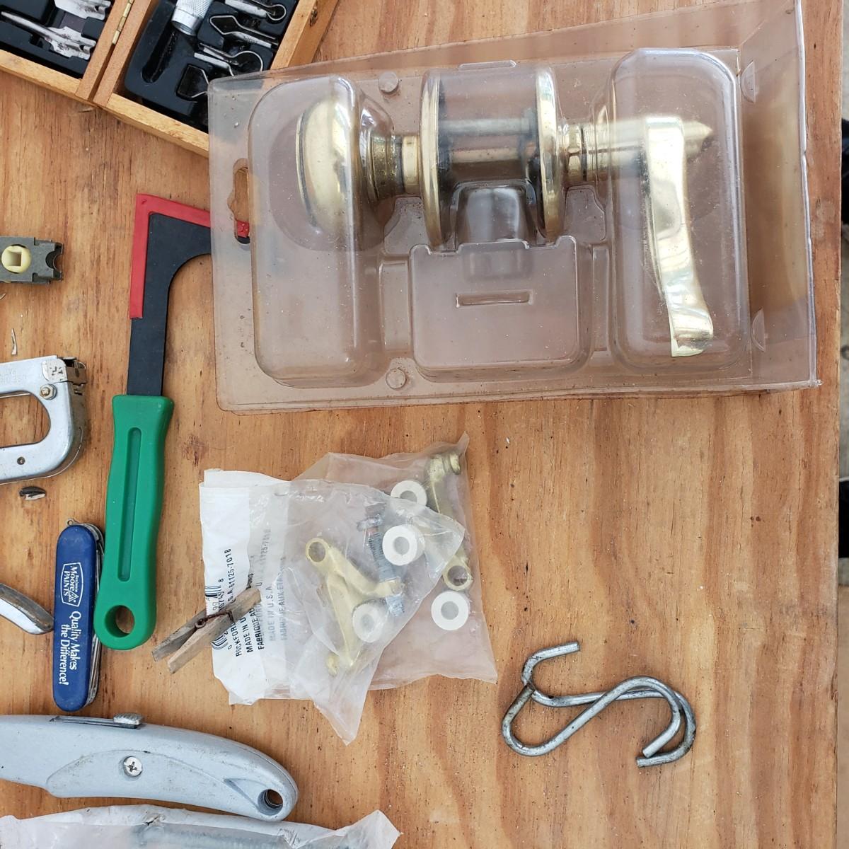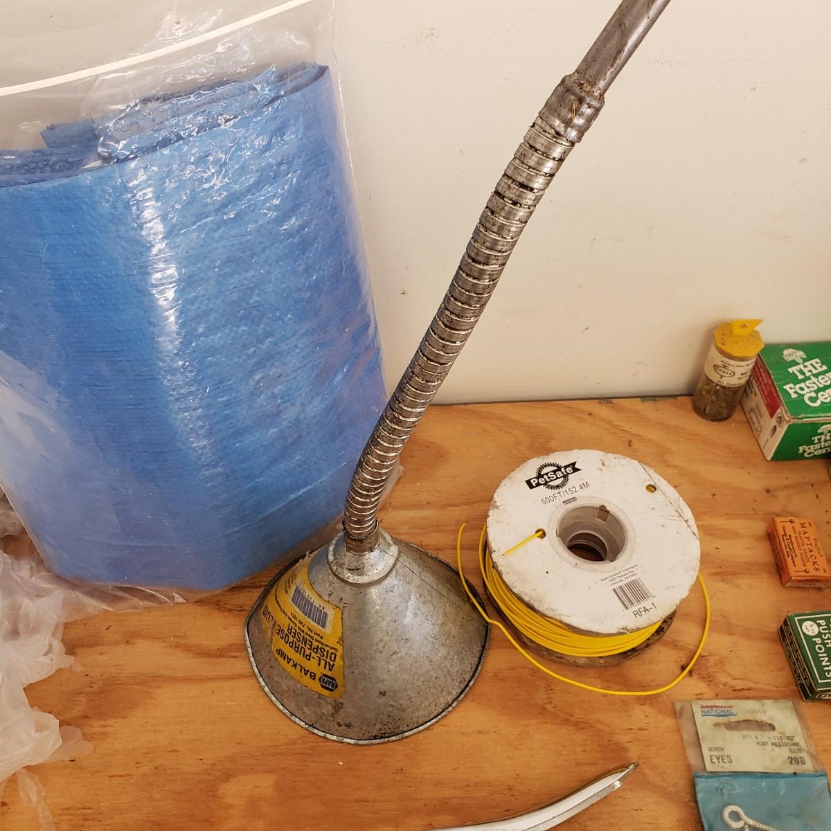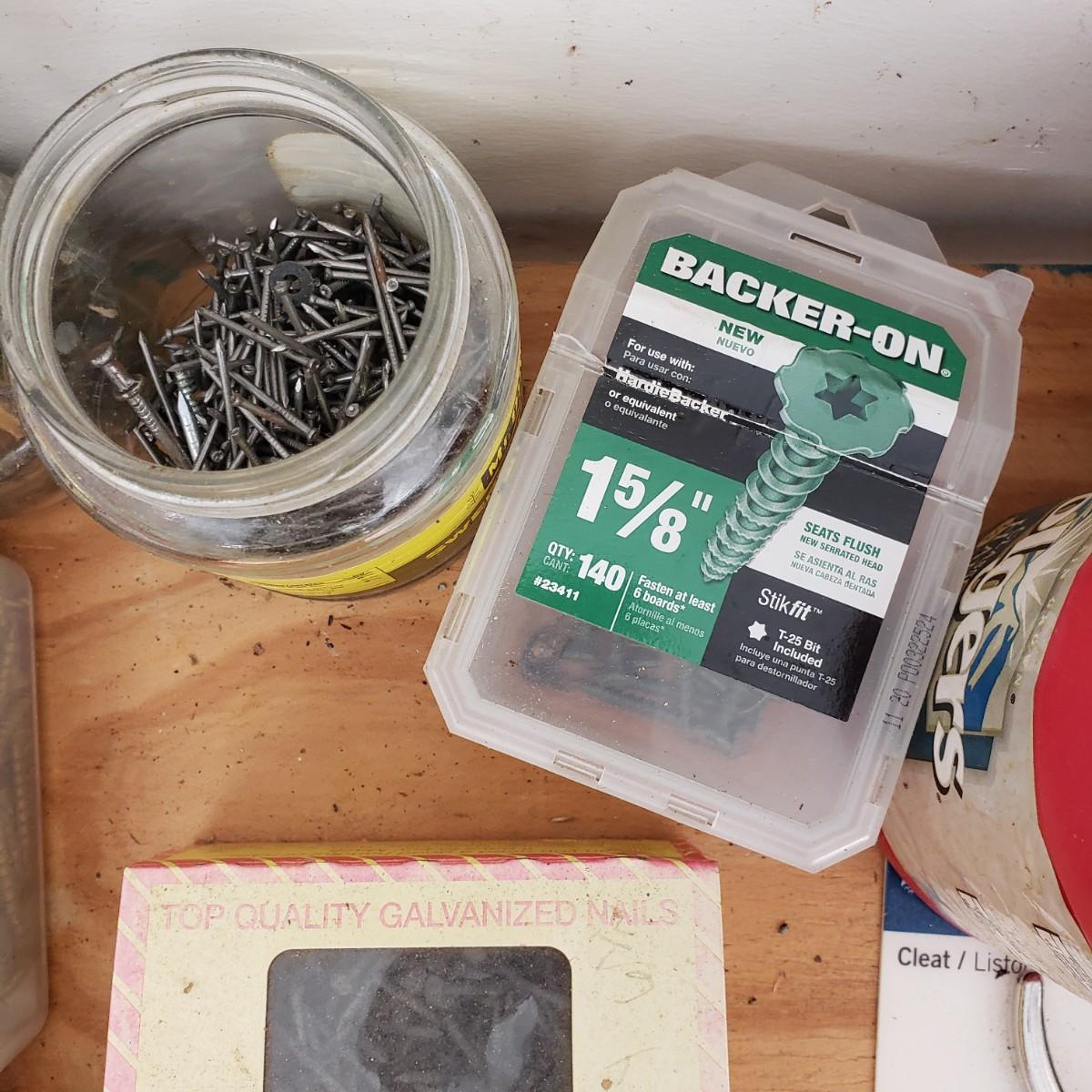 This lot has several pieces of home hardware including nails, screws and three staple guns with staples. There is an Exacto knife kit in a box and painting supplies. New in the box Husky plastic sheeting, see picture for details. Also included is a small blue tarp and a roll of thin clear plastic sheeting. Finally, a large box of thick plastic sheeting, see pictures for details.
