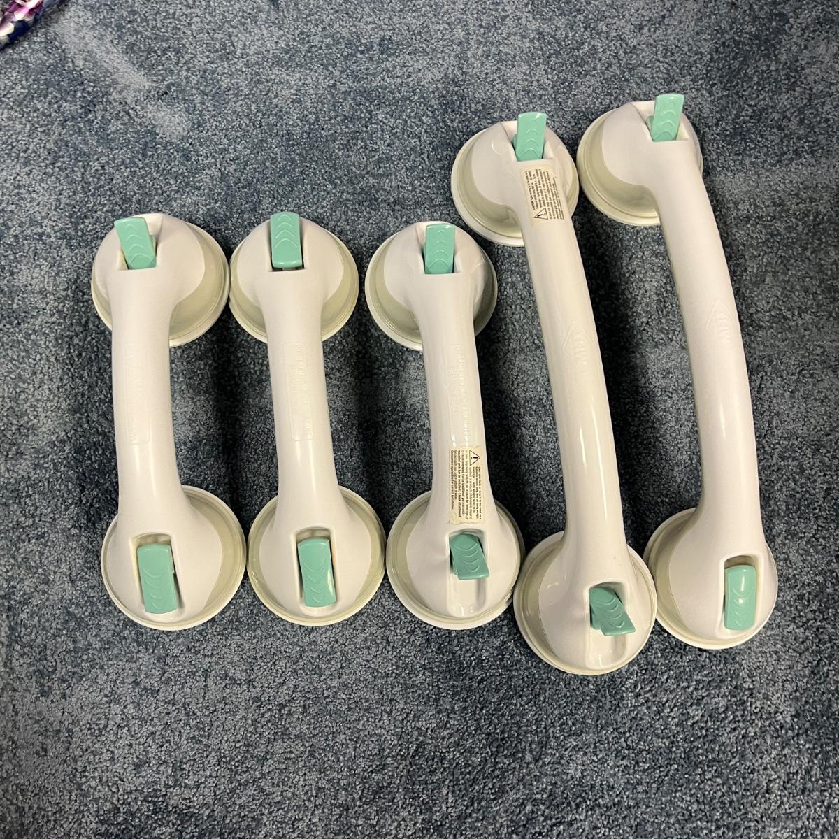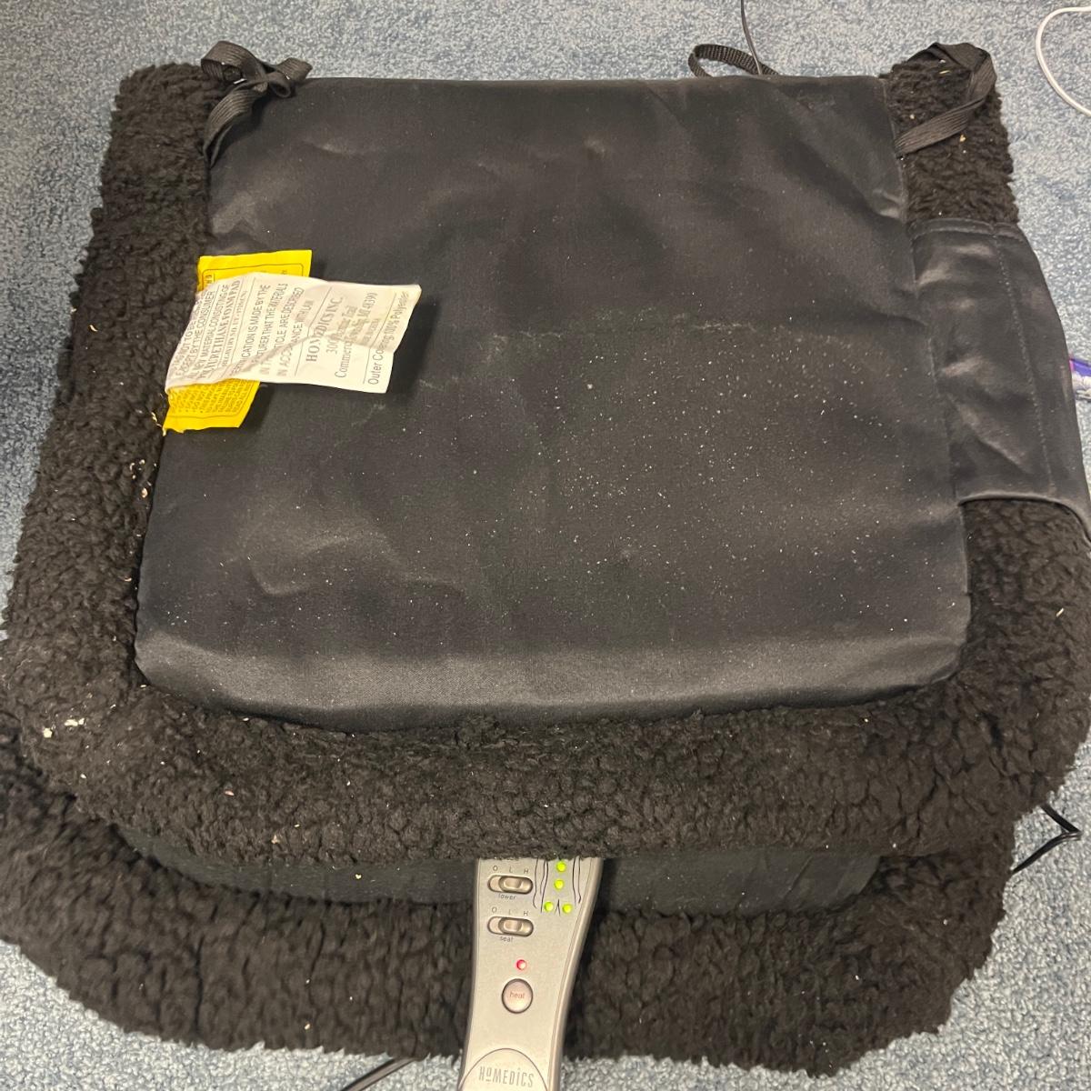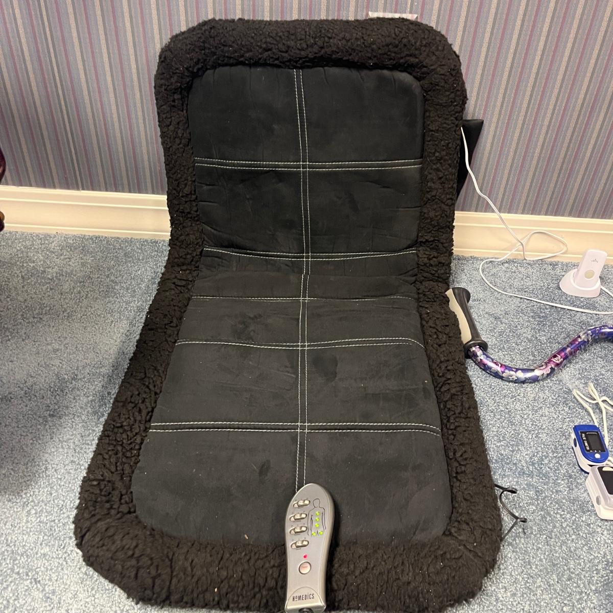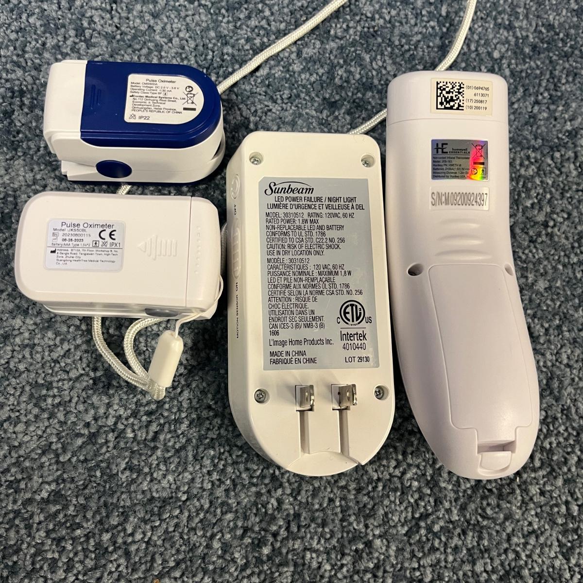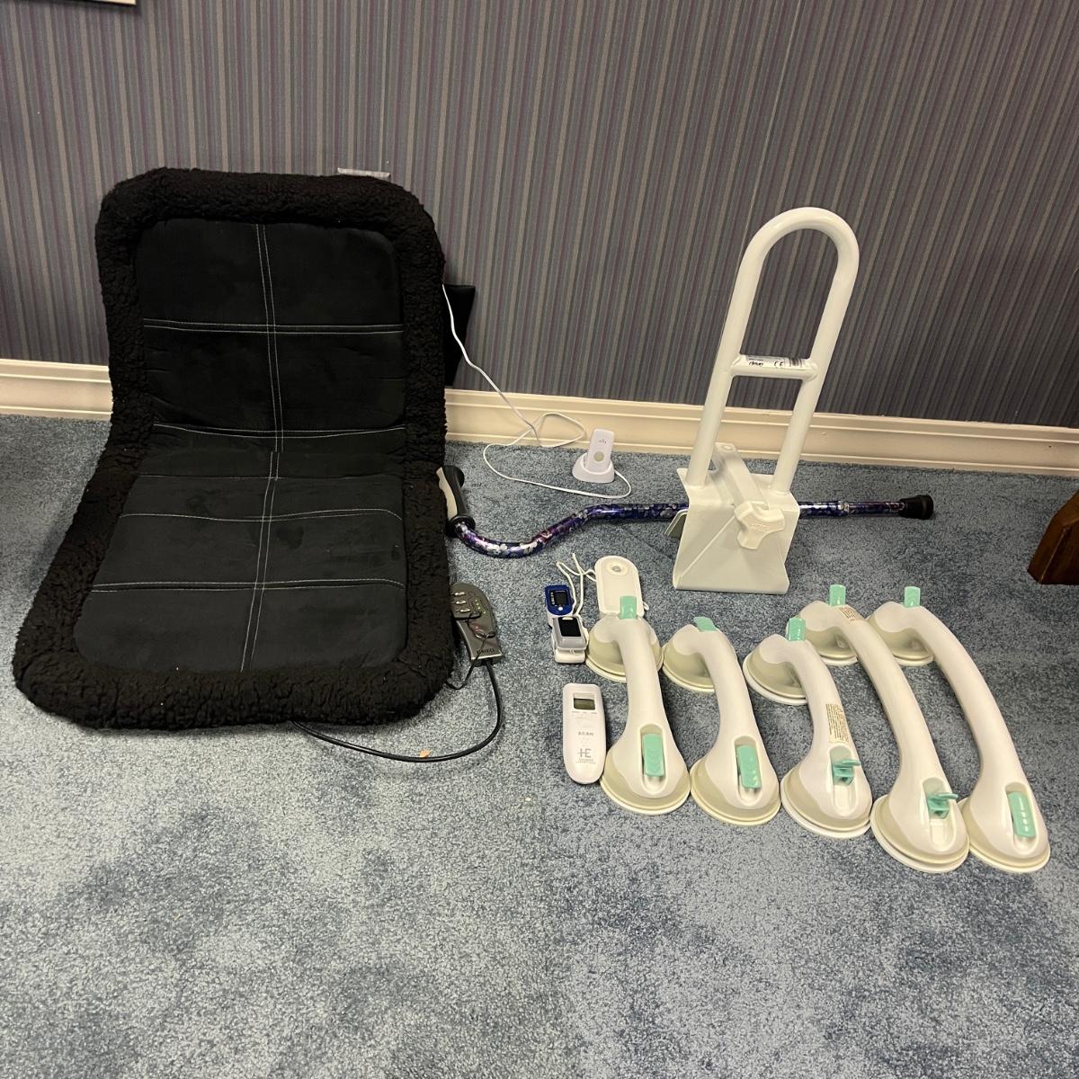 Lot includes five suction cup handles, Homedics vibrating and heated chair cover, metal cane, Drive bed brace, thermometer, emergency flashlight and two pulse oximeters. All electrical items powered on when plugged in. One pulse oximeter appears to need batteries. Bed brace measures 8” x 6” x 20”H.