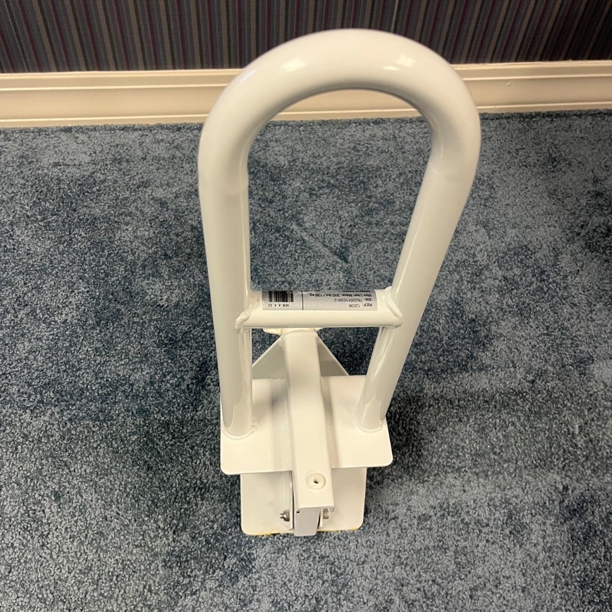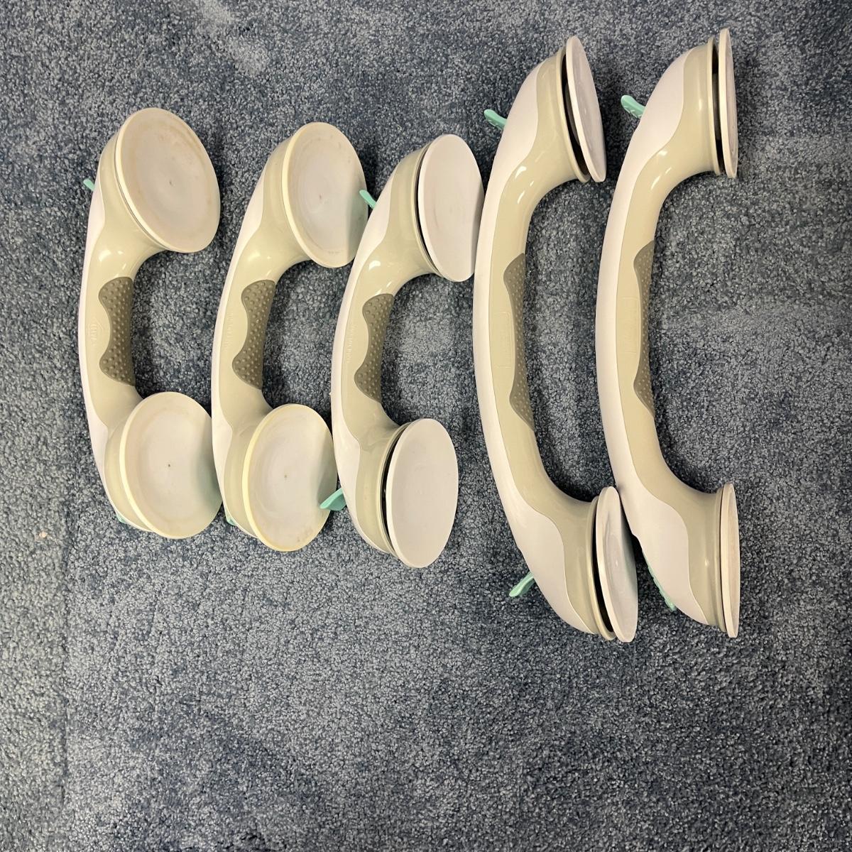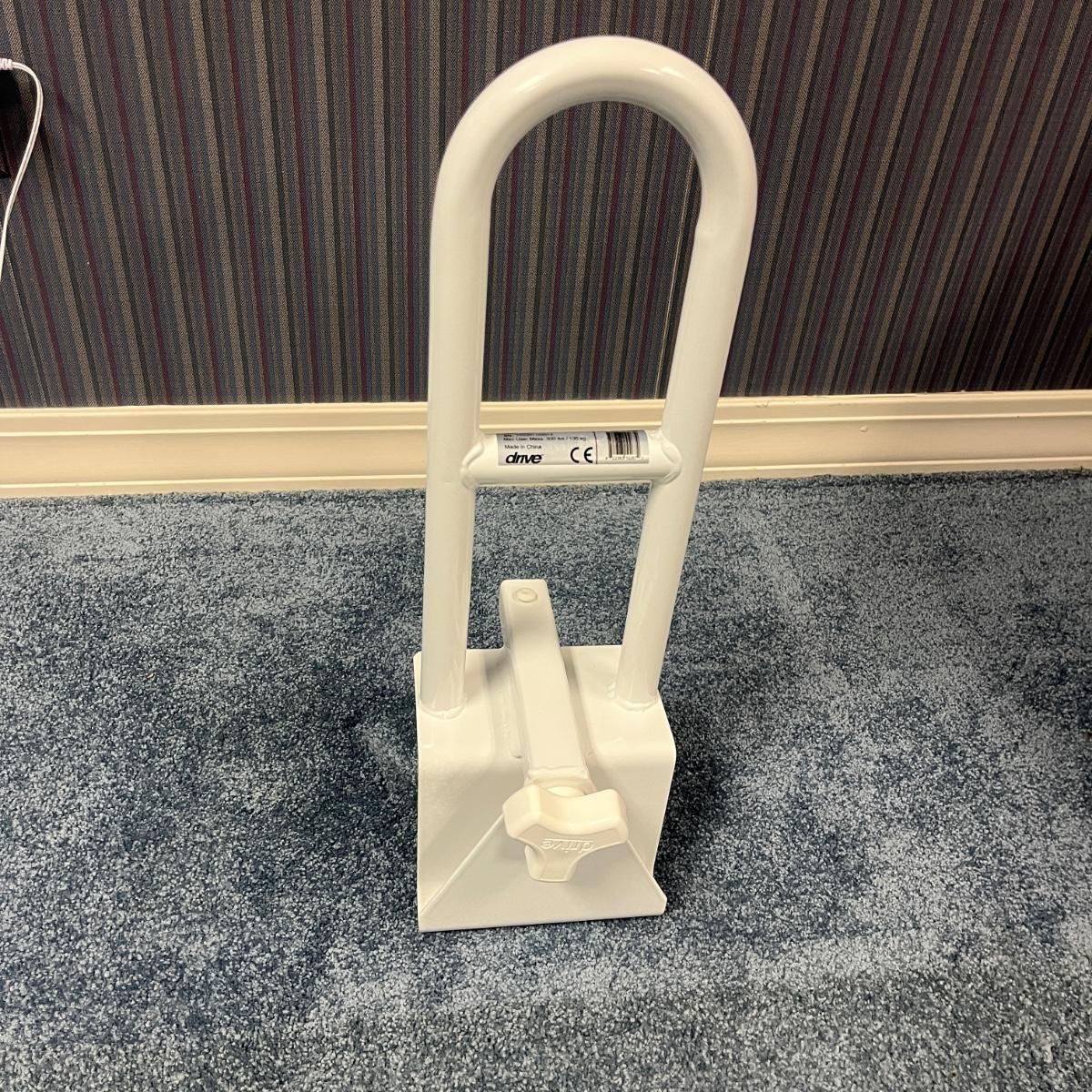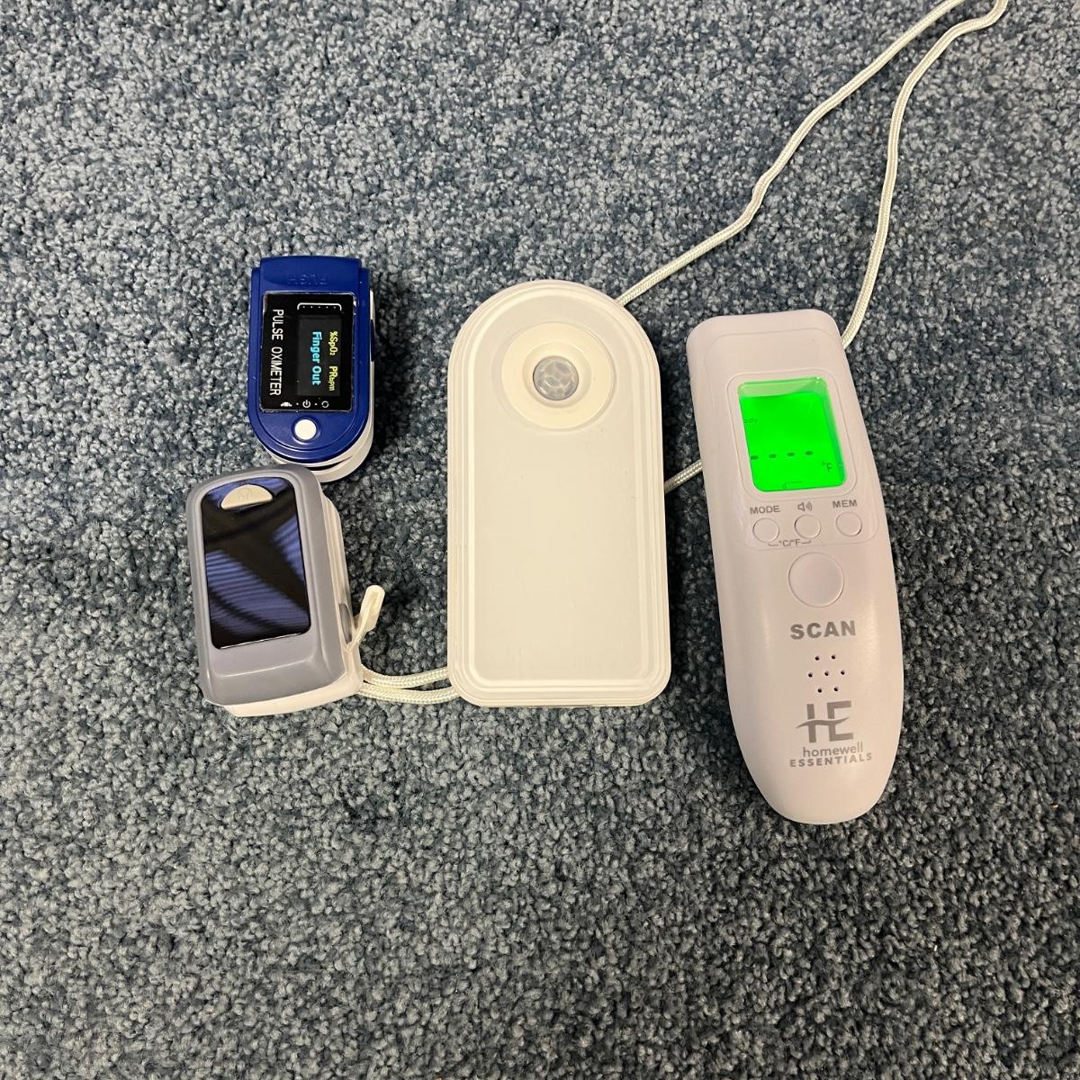 Lot includes five suction cup handles, Homedics vibrating and heated chair cover, metal cane, Drive bed brace, thermometer, emergency flashlight and two pulse oximeters. All electrical items powered on when plugged in. One pulse oximeter appears to need batteries. Bed brace measures 8” x 6” x 20”H.