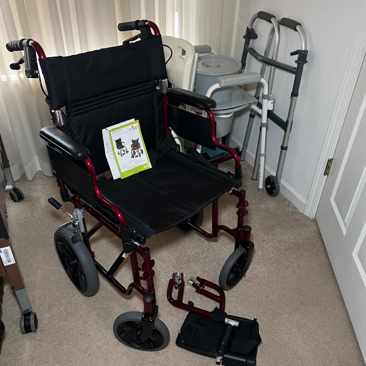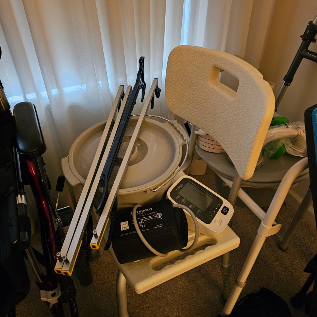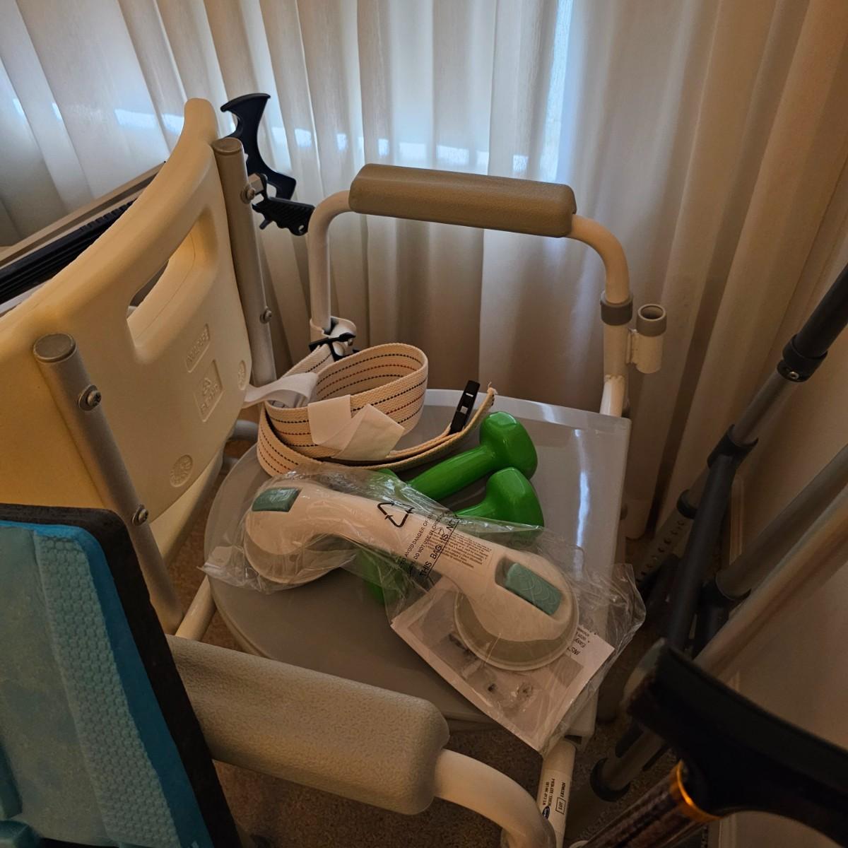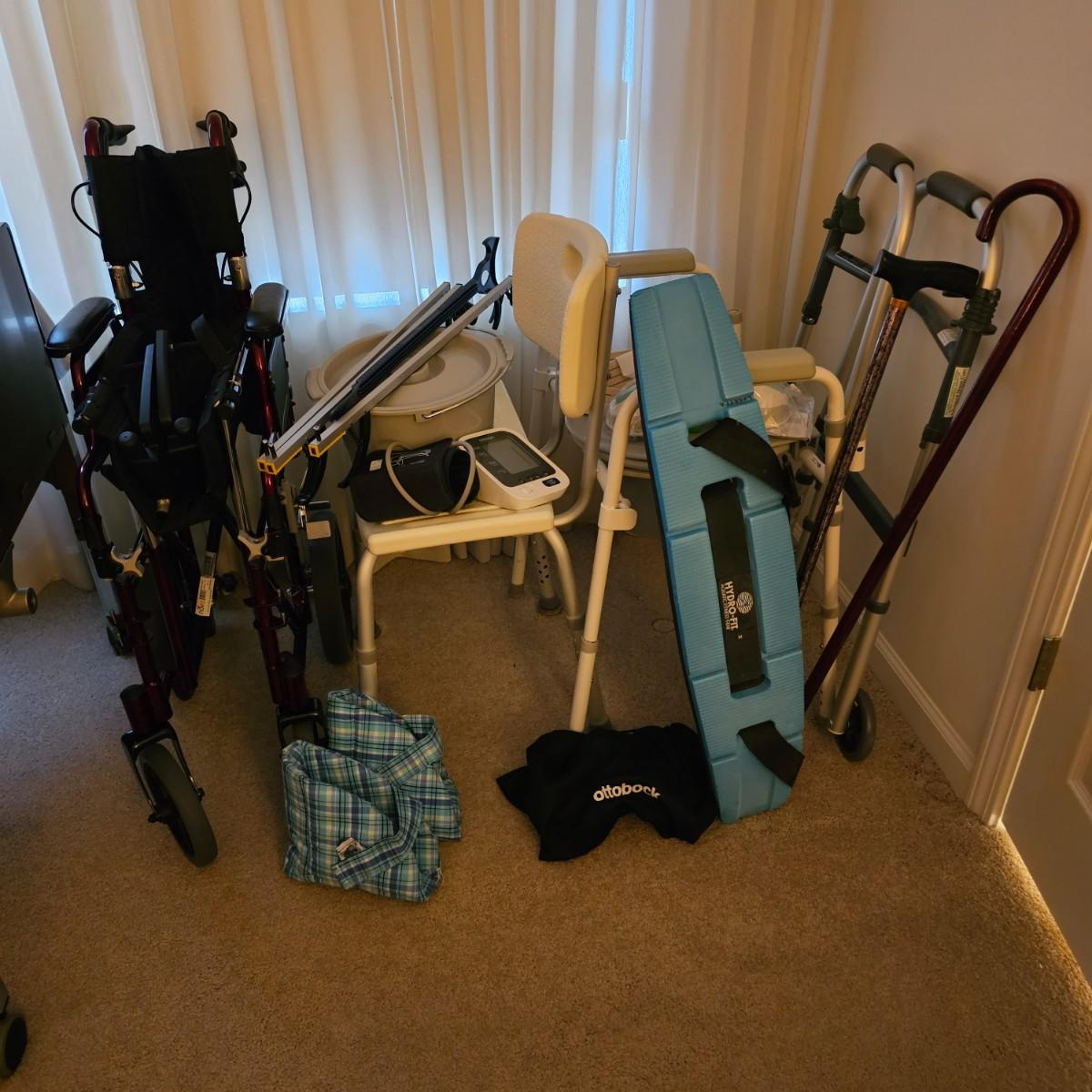 Several pieces of health care items for the home. Foldable walker, two canes, "reach" grabbers, shower chair, toilet chair, Nova wheelchair and more. Walker, shower chair and toilet chair are by Invacare. One Omron blood pressure cuff, battery operated, untested. Two 3lb hand weights, one Hydrofit pool belt. Assorted other gear, see photos for details. Shower chair 20" x 15" x 32"h, adjustable. Toilet chair 21" x 20" x 28"h, adjustable. Wheelchair 23" x 30" x 38" h, has add on footrests, hand brakes and wheel locks. Local pickup only.