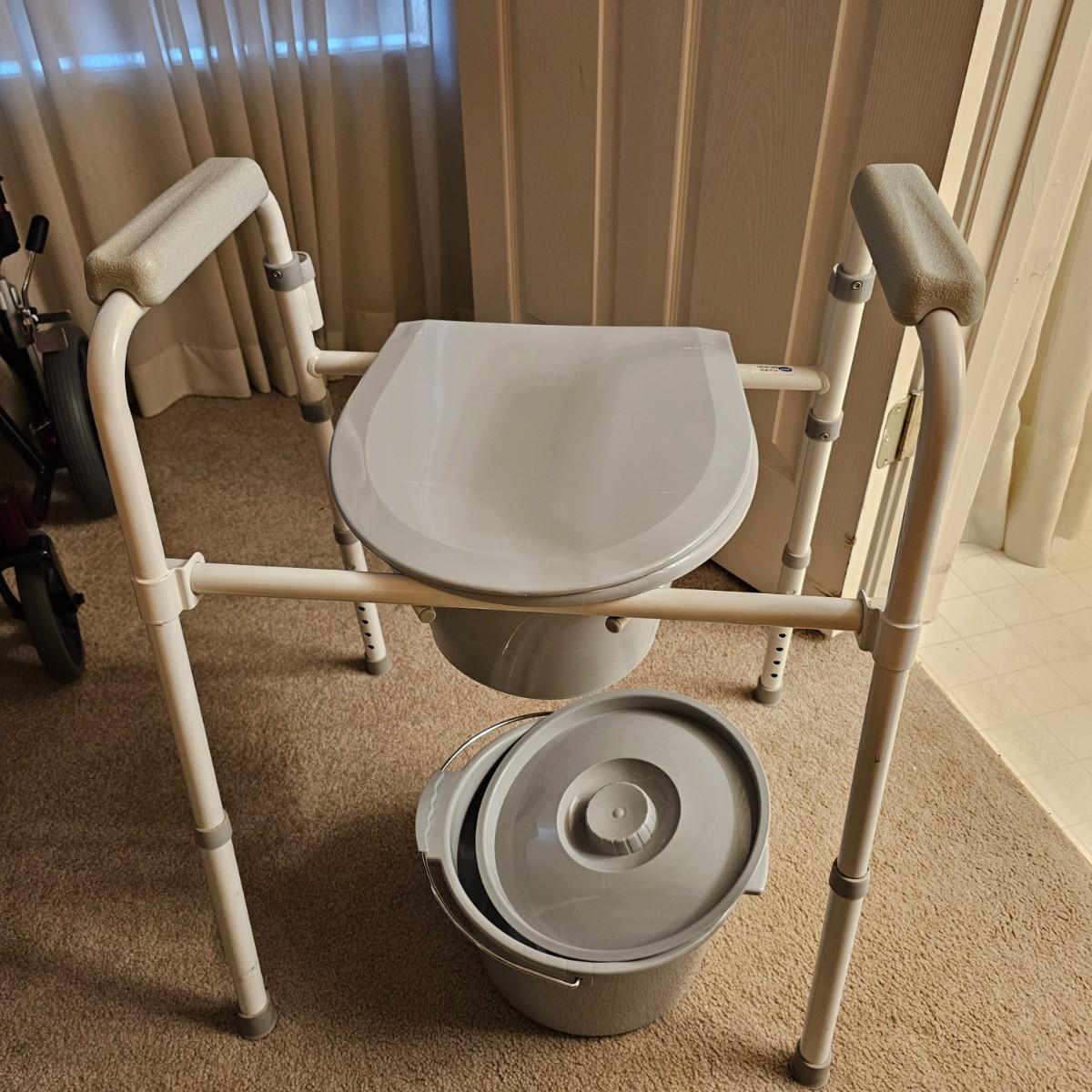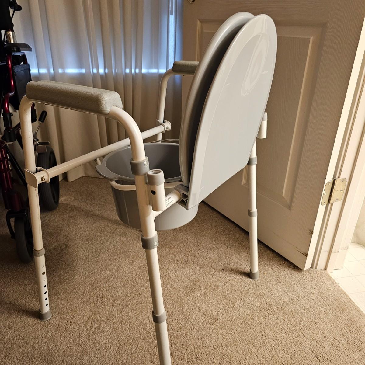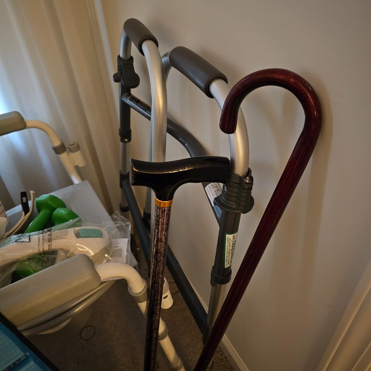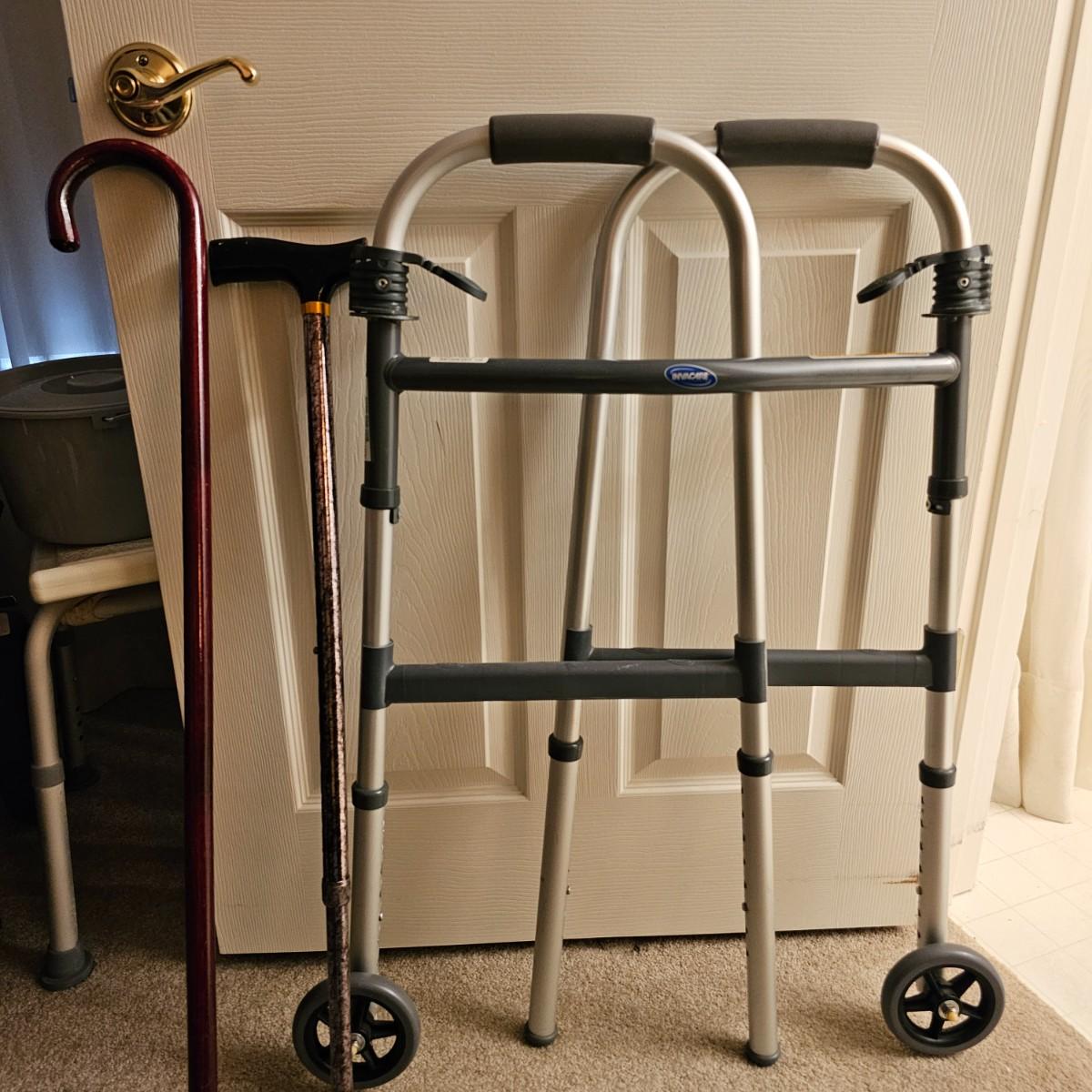 Several pieces of health care items for the home. Foldable walker, two canes, "reach" grabbers, shower chair, toilet chair, Nova wheelchair and more. Walker, shower chair and toilet chair are by Invacare. One Omron blood pressure cuff, battery operated, untested. Two 3lb hand weights, one Hydrofit pool belt. Assorted other gear, see photos for details. Shower chair 20" x 15" x 32"h, adjustable. Toilet chair 21" x 20" x 28"h, adjustable. Wheelchair 23" x 30" x 38" h, has add on footrests, hand brakes and wheel locks. Local pickup only.