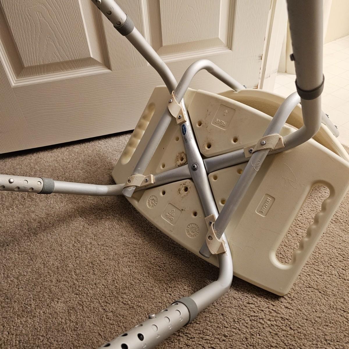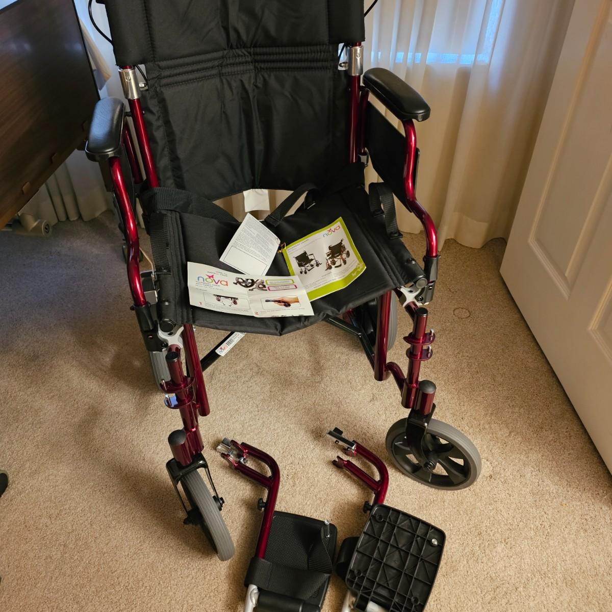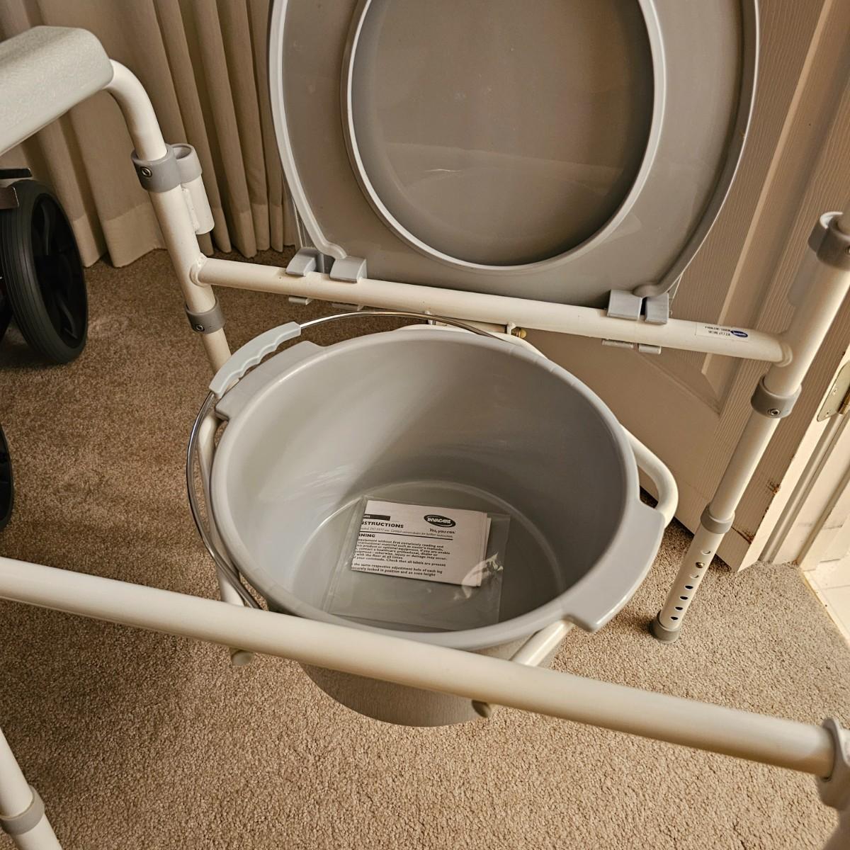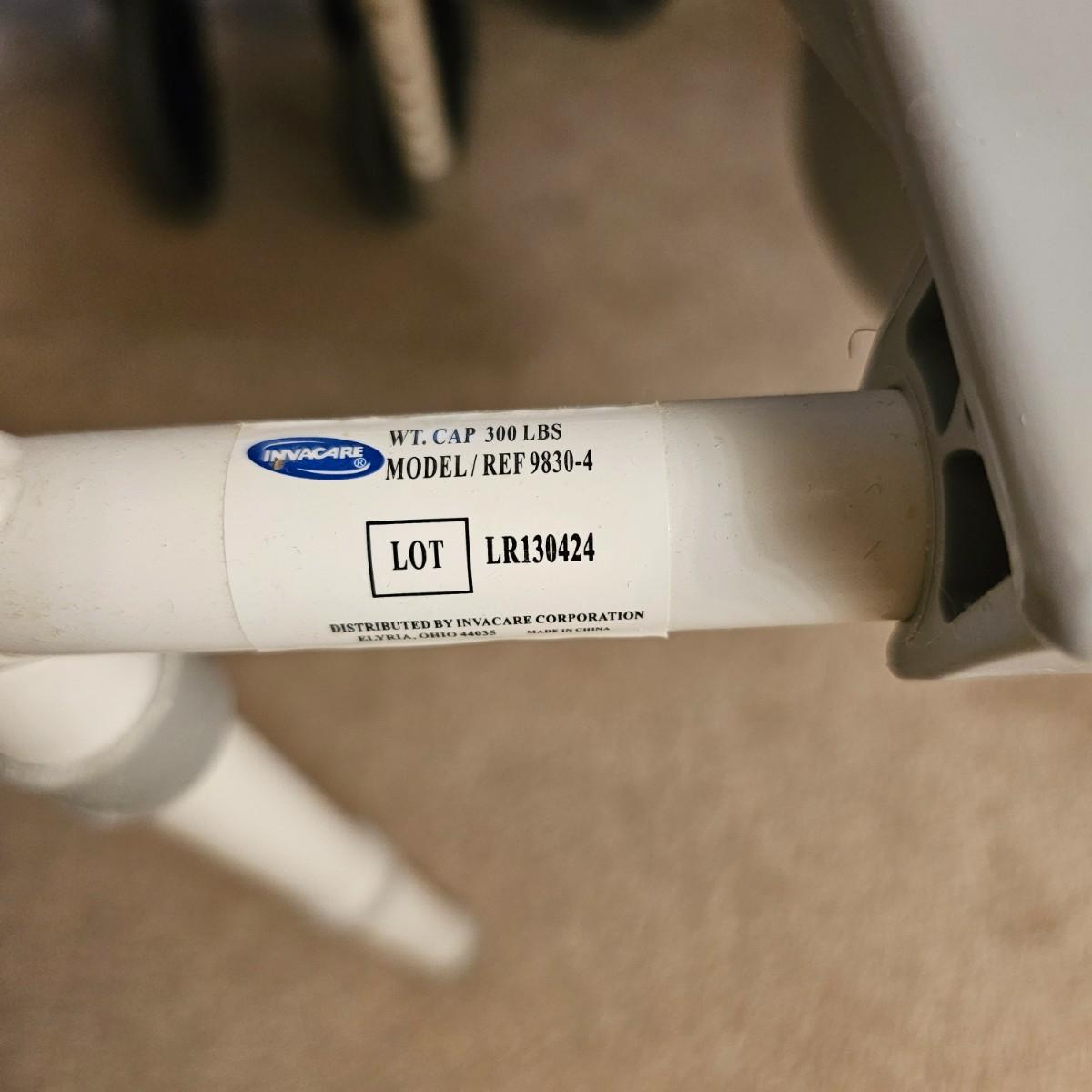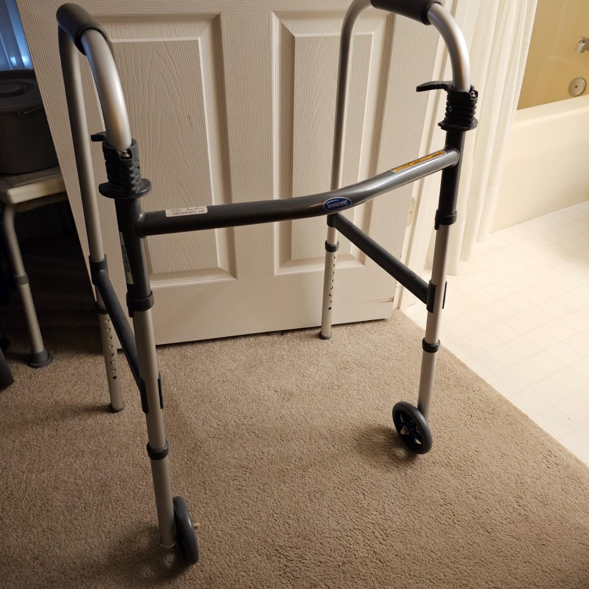 Several pieces of health care items for the home. Foldable walker, two canes, "reach" grabbers, shower chair, toilet chair, Nova wheelchair and more. Walker, shower chair and toilet chair are by Invacare. One Omron blood pressure cuff, battery operated, untested. Two 3lb hand weights, one Hydrofit pool belt. Assorted other gear, see photos for details. Shower chair 20" x 15" x 32"h, adjustable. Toilet chair 21" x 20" x 28"h, adjustable. Wheelchair 23" x 30" x 38" h, has add on footrests, hand brakes and wheel locks. Local pickup only.