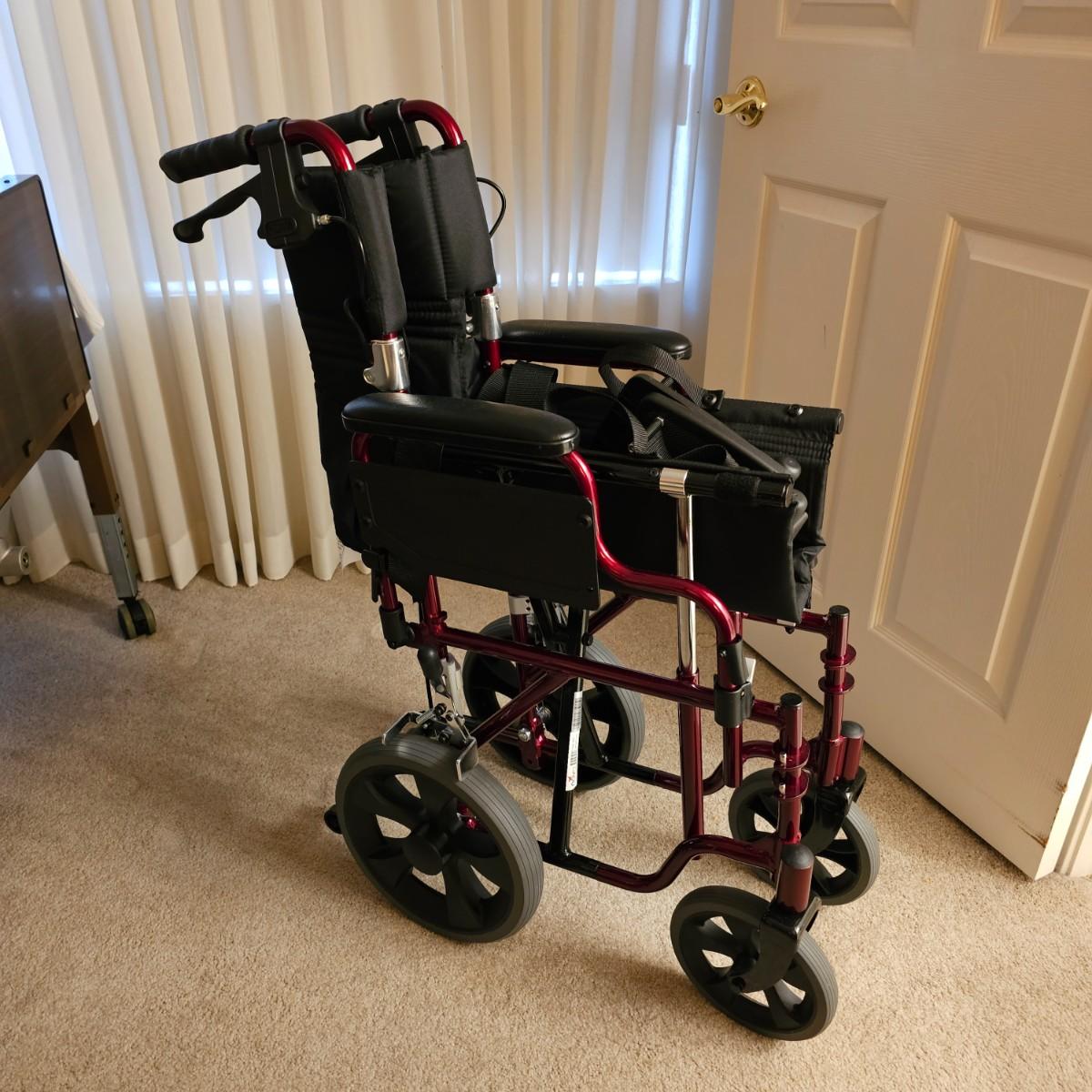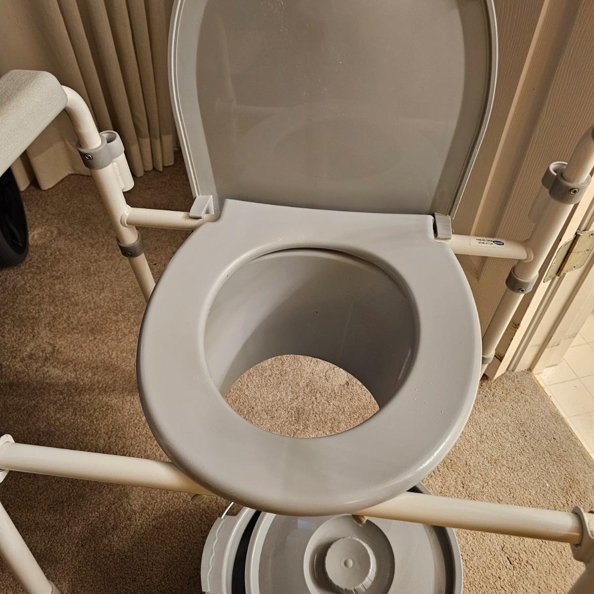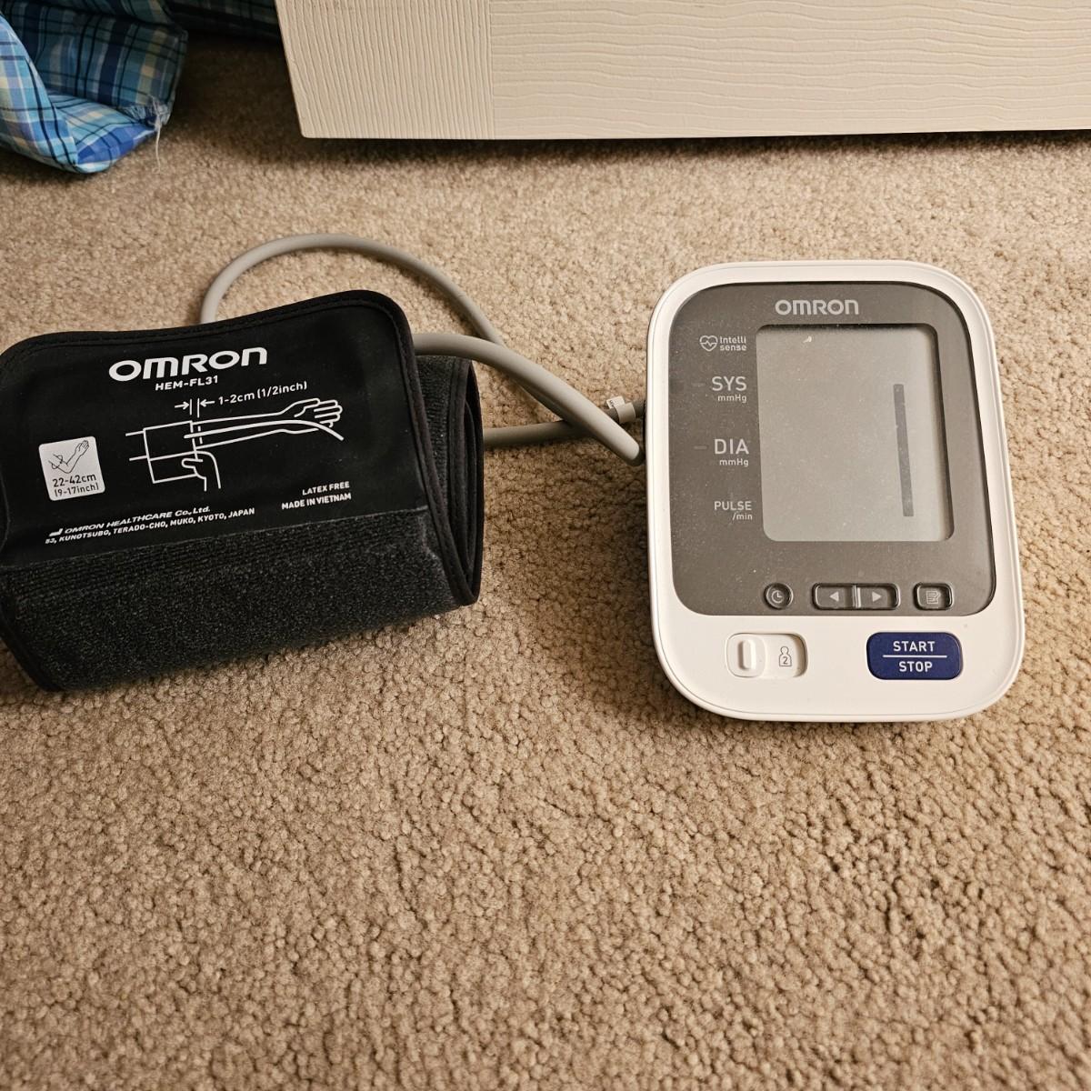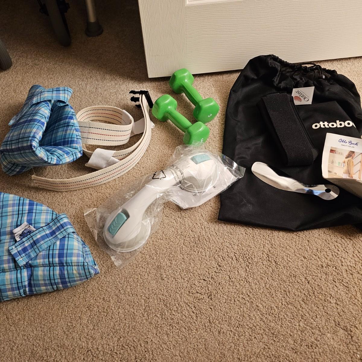 Several pieces of health care items for the home. Foldable walker, two canes, "reach" grabbers, shower chair, toilet chair, Nova wheelchair and more. Walker, shower chair and toilet chair are by Invacare. One Omron blood pressure cuff, battery operated, untested. Two 3lb hand weights, one Hydrofit pool belt. Assorted other gear, see photos for details. Shower chair 20" x 15" x 32"h, adjustable. Toilet chair 21" x 20" x 28"h, adjustable. Wheelchair 23" x 30" x 38" h, has add on footrests, hand brakes and wheel locks. Local pickup only.