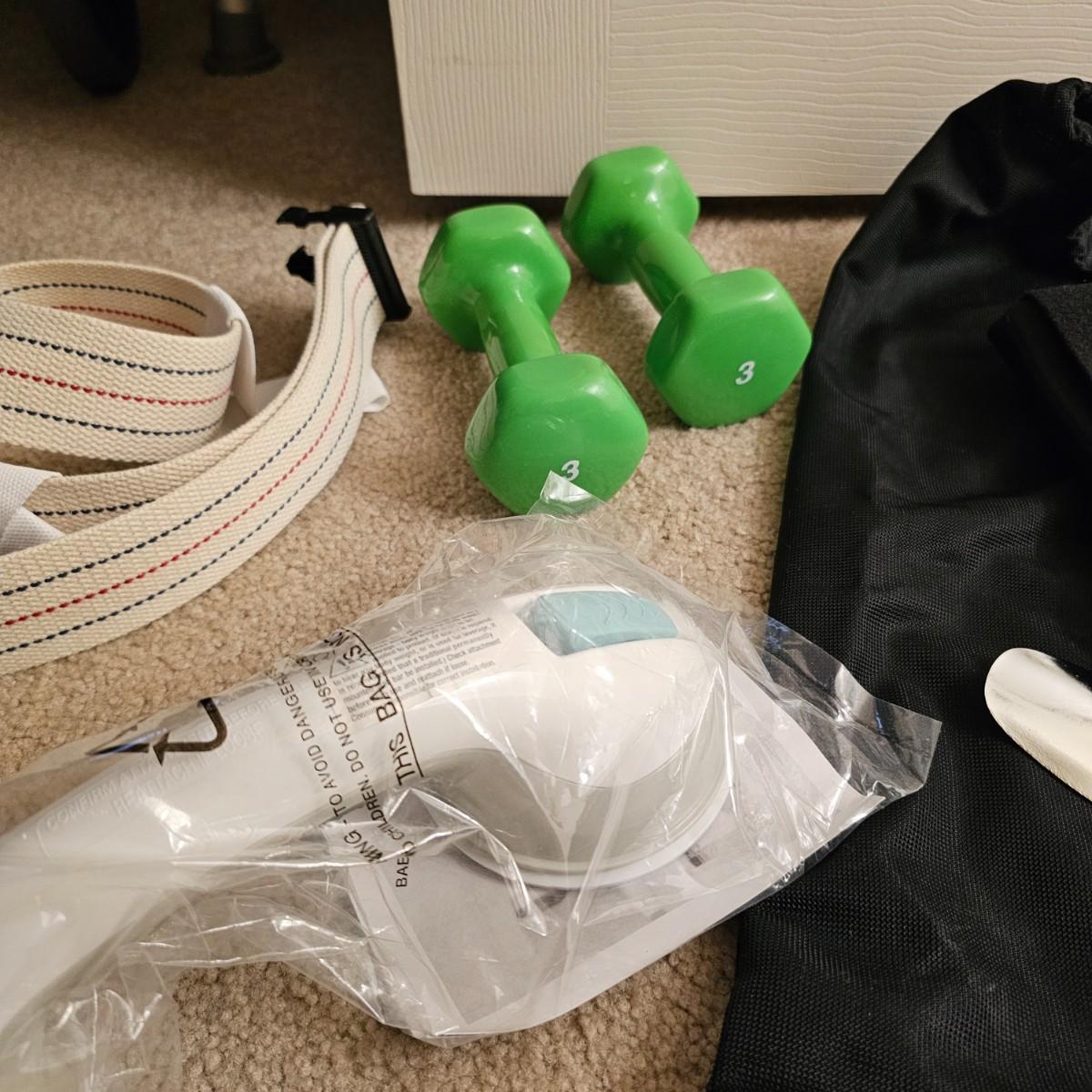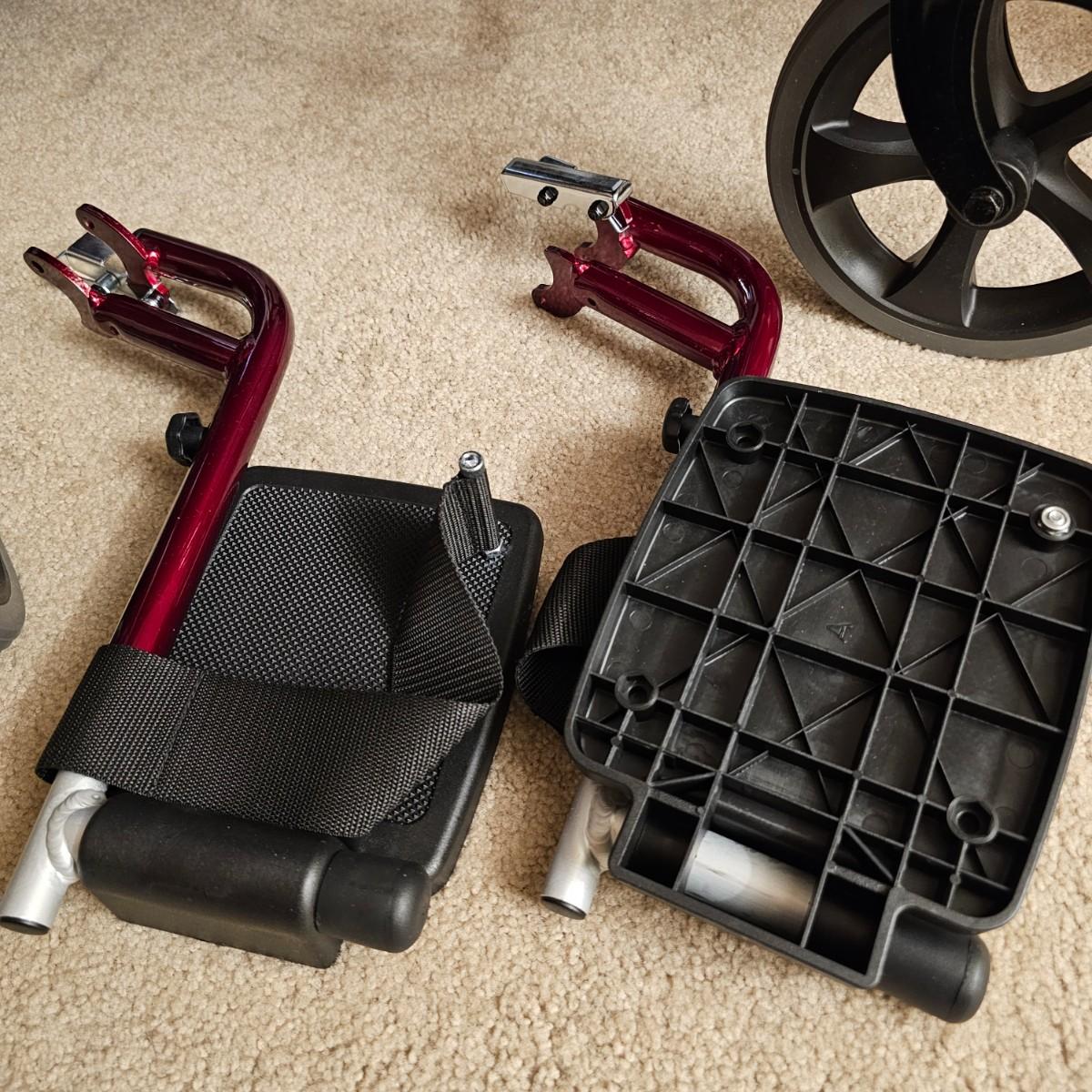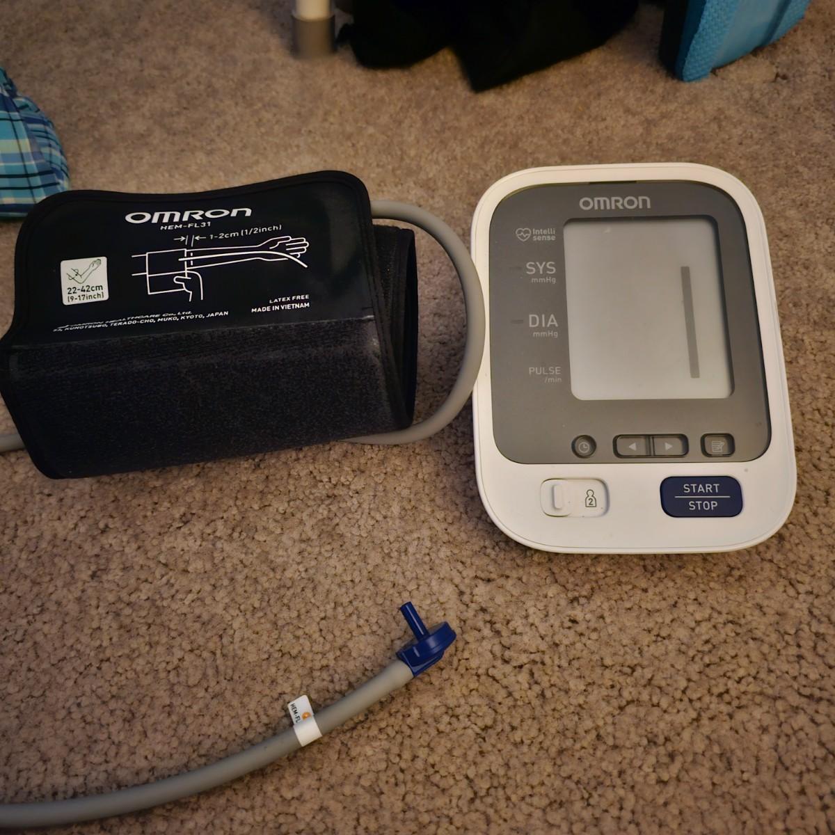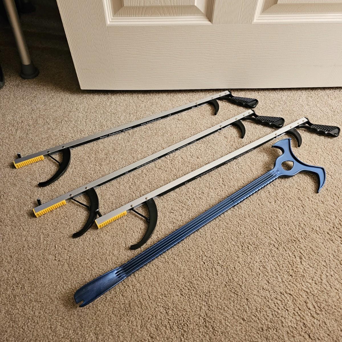 Several pieces of health care items for the home. Foldable walker, two canes, "reach" grabbers, shower chair, toilet chair, Nova wheelchair and more. Walker, shower chair and toilet chair are by Invacare. One Omron blood pressure cuff, battery operated, untested. Two 3lb hand weights, one Hydrofit pool belt. Assorted other gear, see photos for details. Shower chair 20" x 15" x 32"h, adjustable. Toilet chair 21" x 20" x 28"h, adjustable. Wheelchair 23" x 30" x 38" h, has add on footrests, hand brakes and wheel locks. Local pickup only.