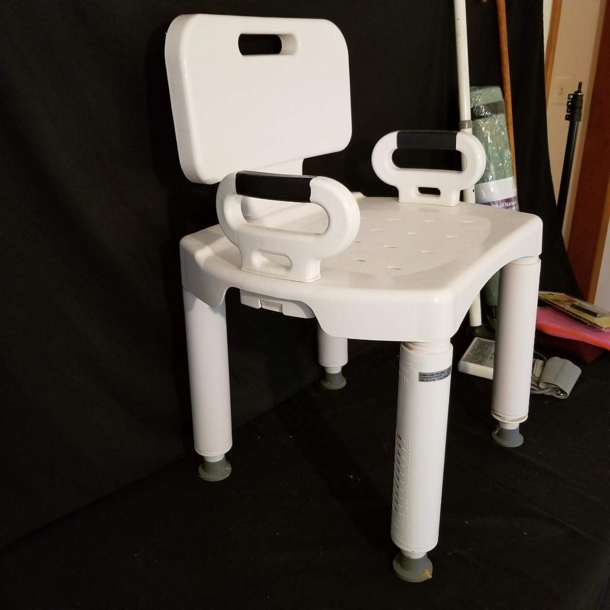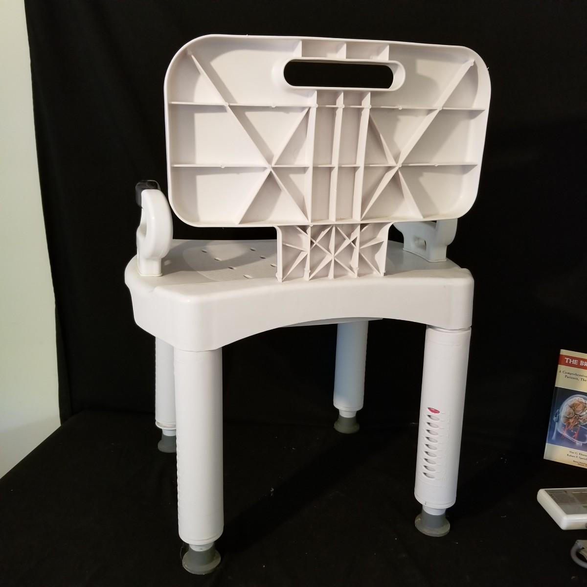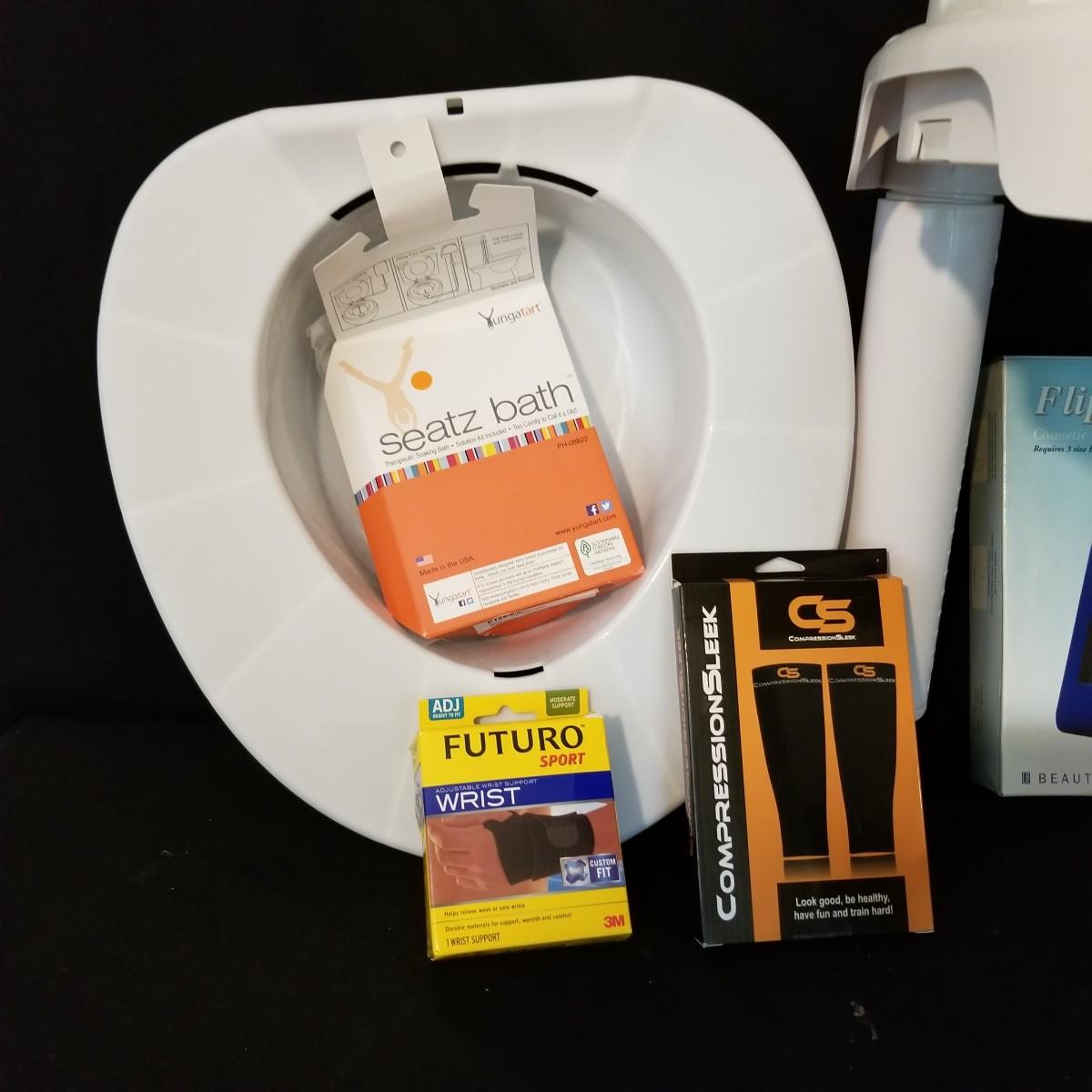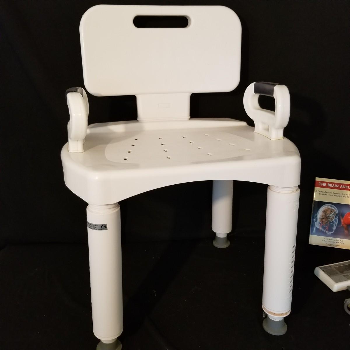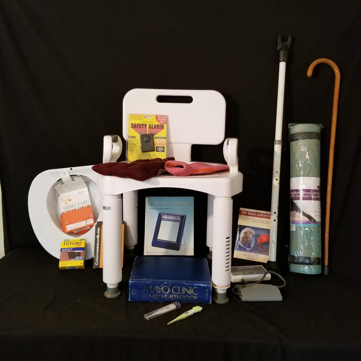 A collection of care items for home use. Shower chair, cane, yoga mat, thermometers, heat packs, books, braces, etc. Chair is 22"x18"19", cane is 35"long, and yoga mat is 62"x24". See photos for details. Local pickup only.
