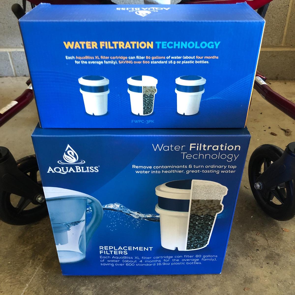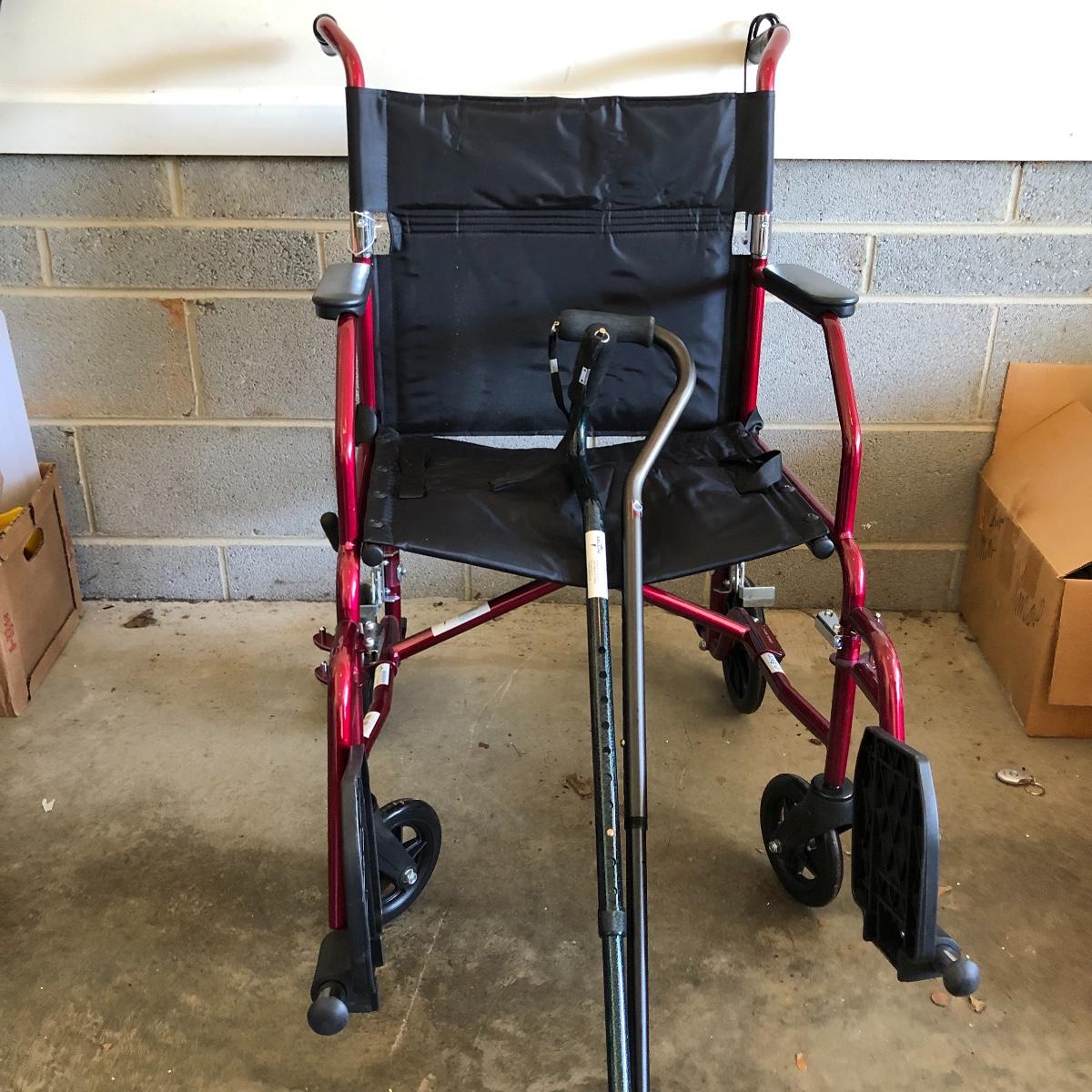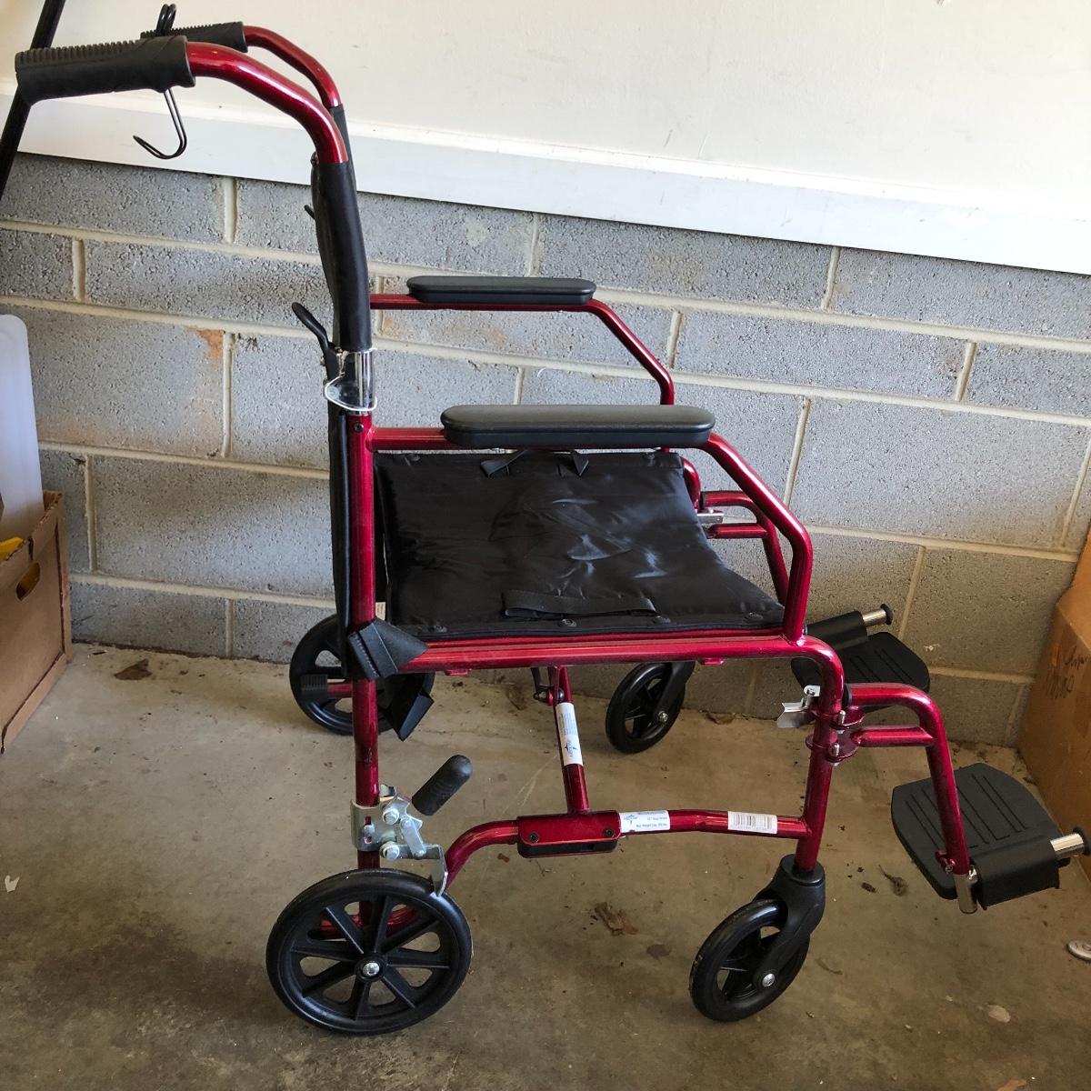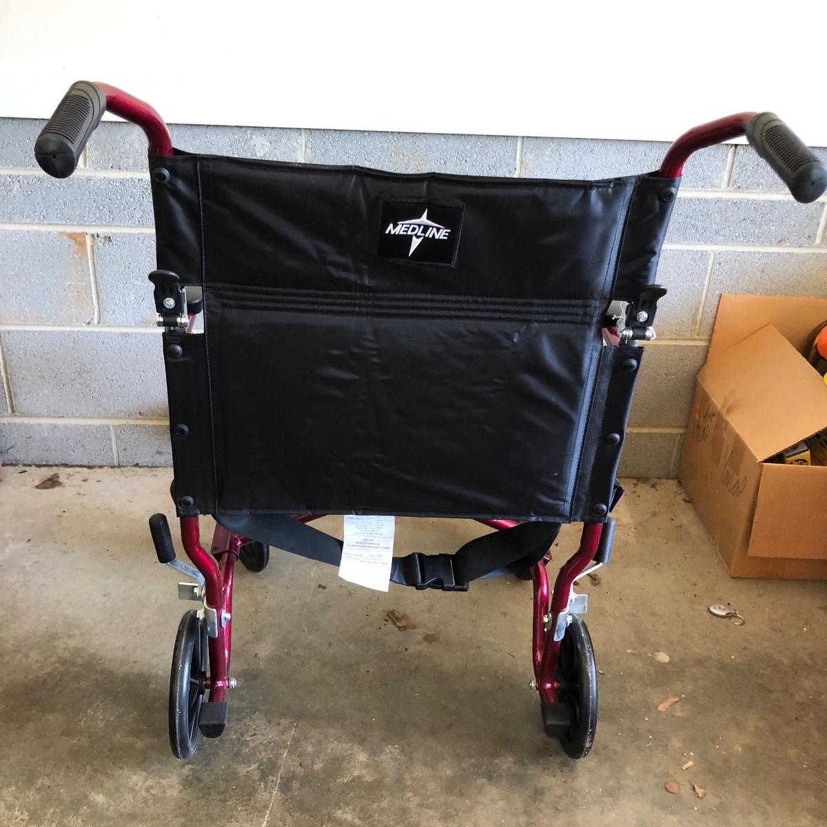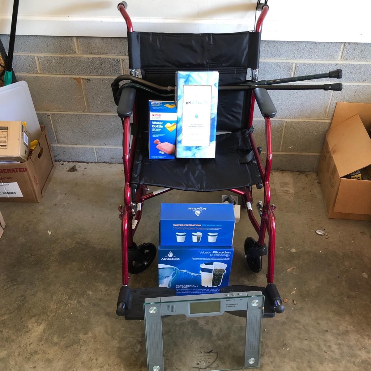 Lot includes scale, hot water bottle, Alkali be pitcher, water filter and extra filters, Omron Blood pressure cuff and a Medline wheelchair with a 19” wide seat.