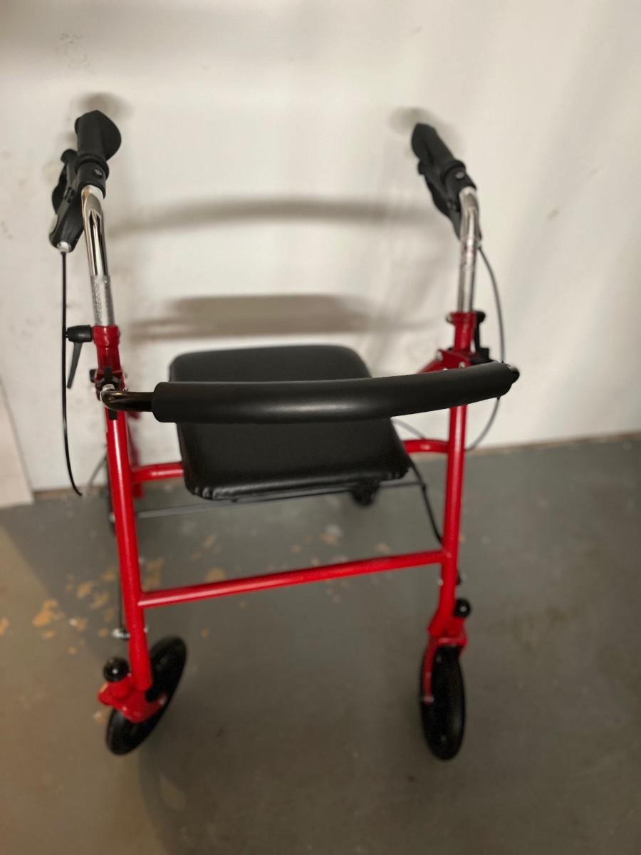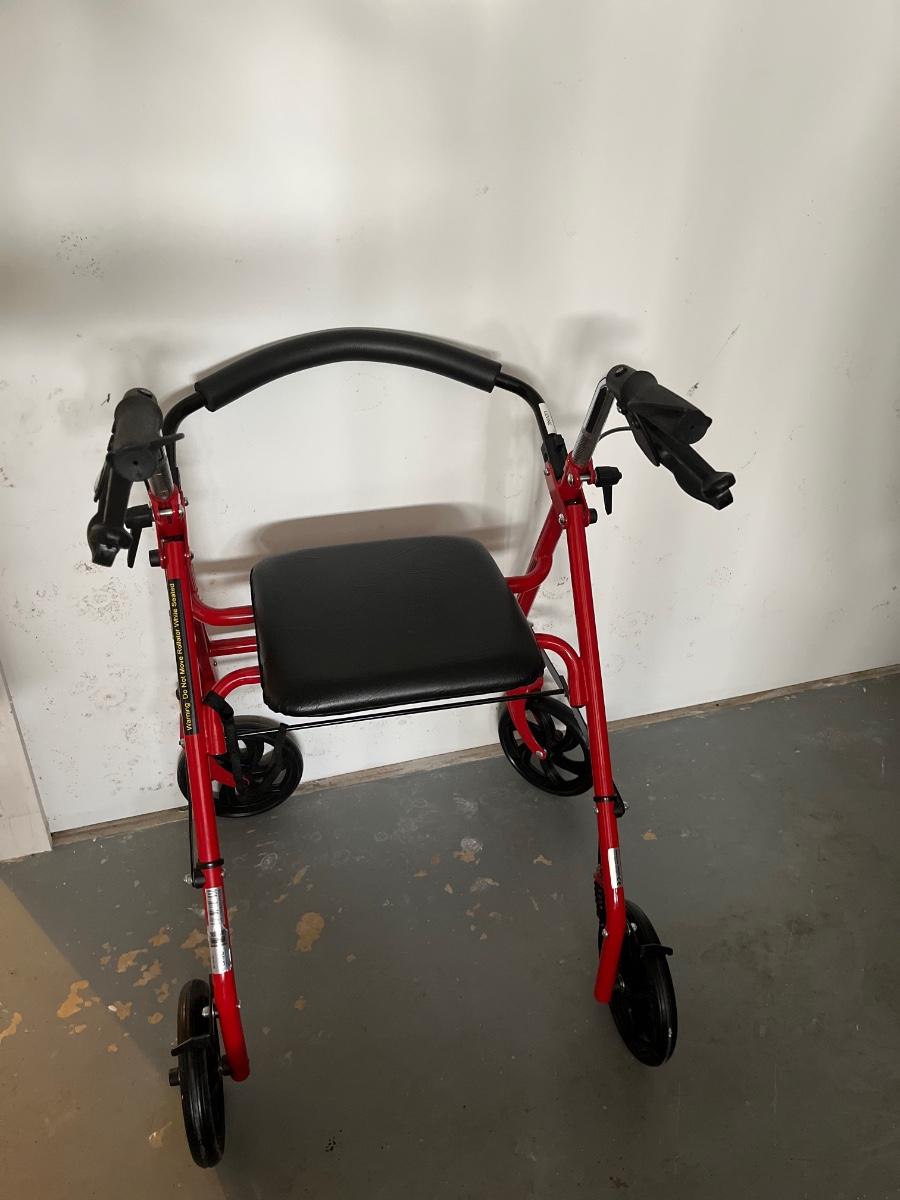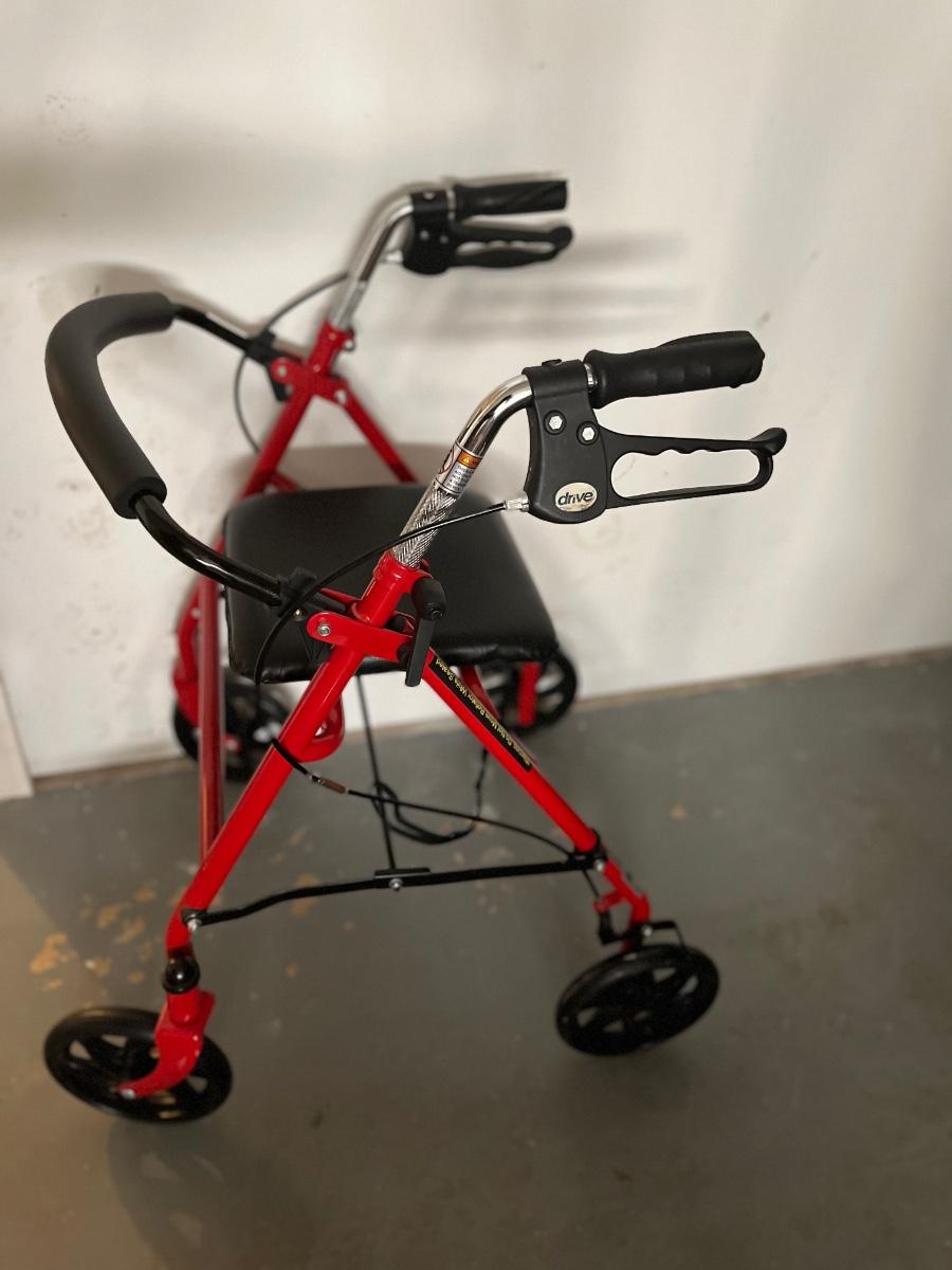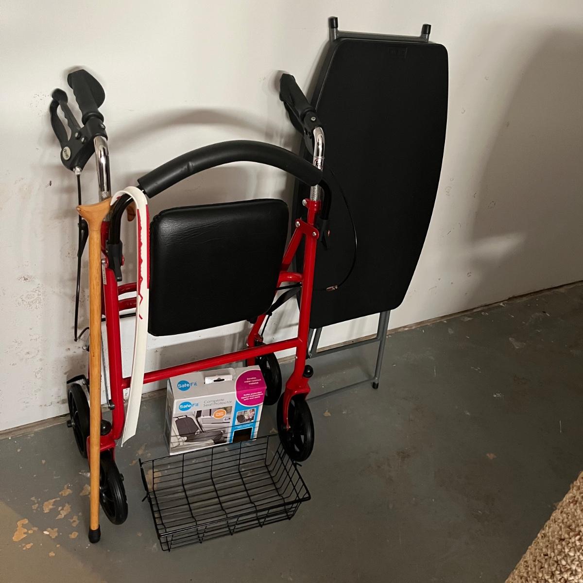 Lot includes Drive Walker, folding table wooden cane, seat protector and a small metal basket.