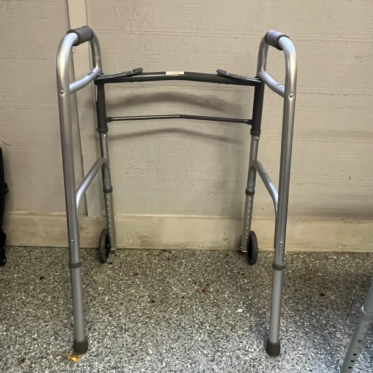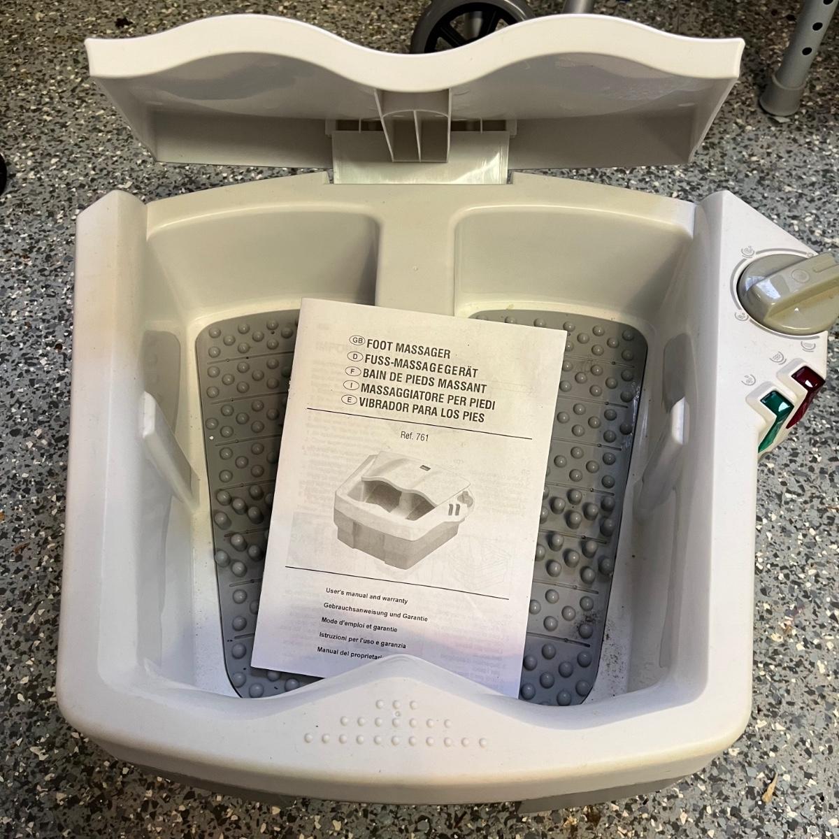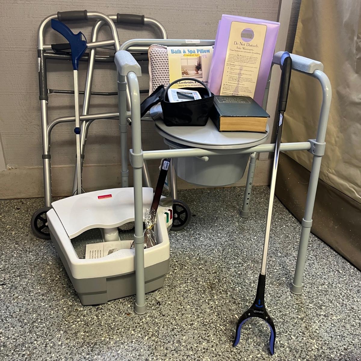 Lot includes a maniquick foot massager that powered on when plugged in. Also includes aluminum walker, CVS health blood pressure monitor that appears to need new batteries, Sole warmers, two grabbers and more.