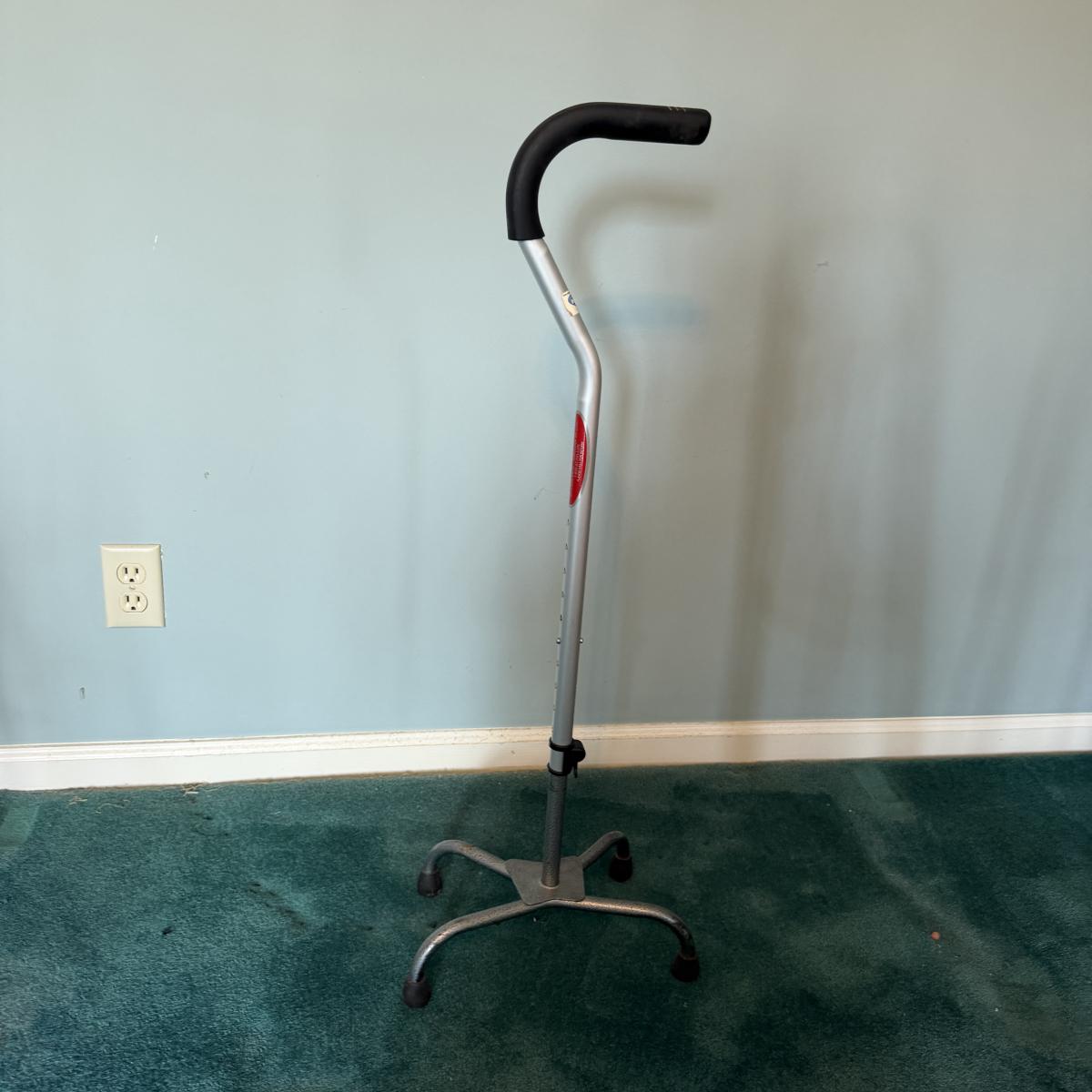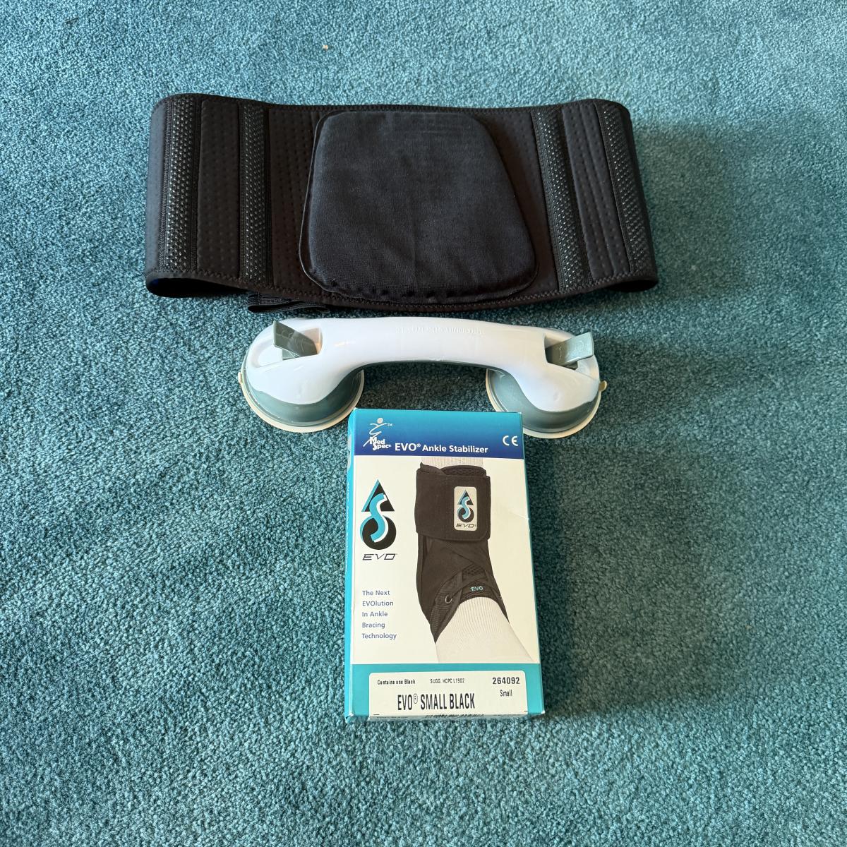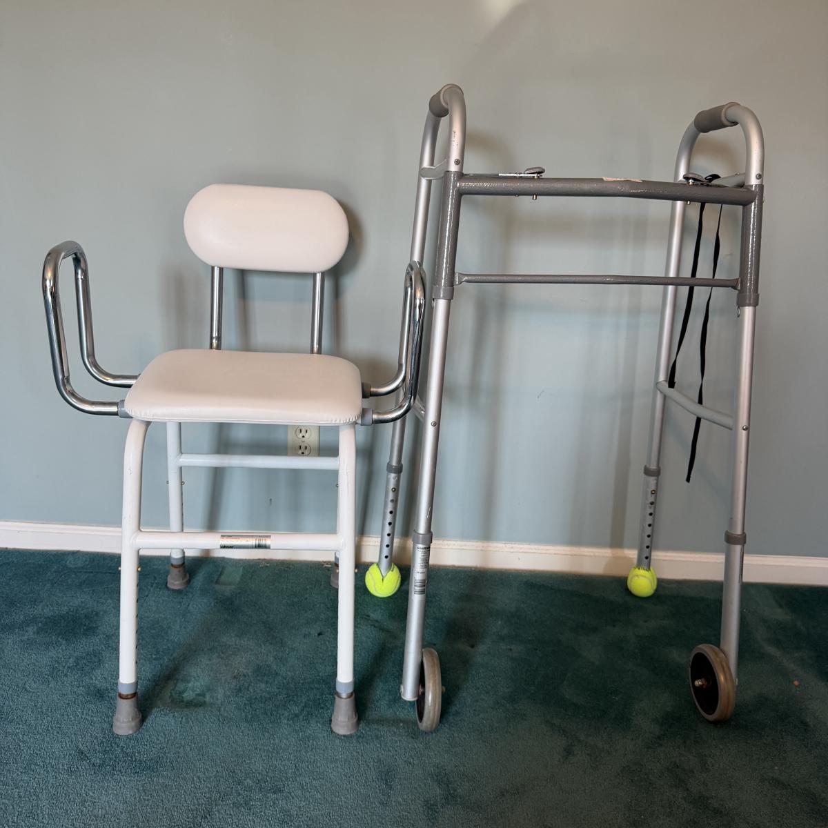This home health collection includes Walker, shower chair, three NIB shower heads with water filters, two 5 pound dumbbells, ankle brace and weight, back brace, grab handle and an aluminum cane. Walker measures 23” x 19” x 39”H.
