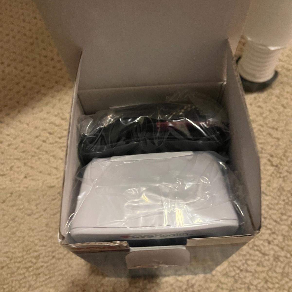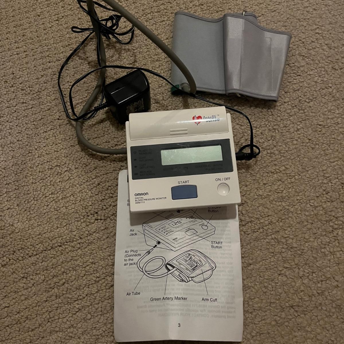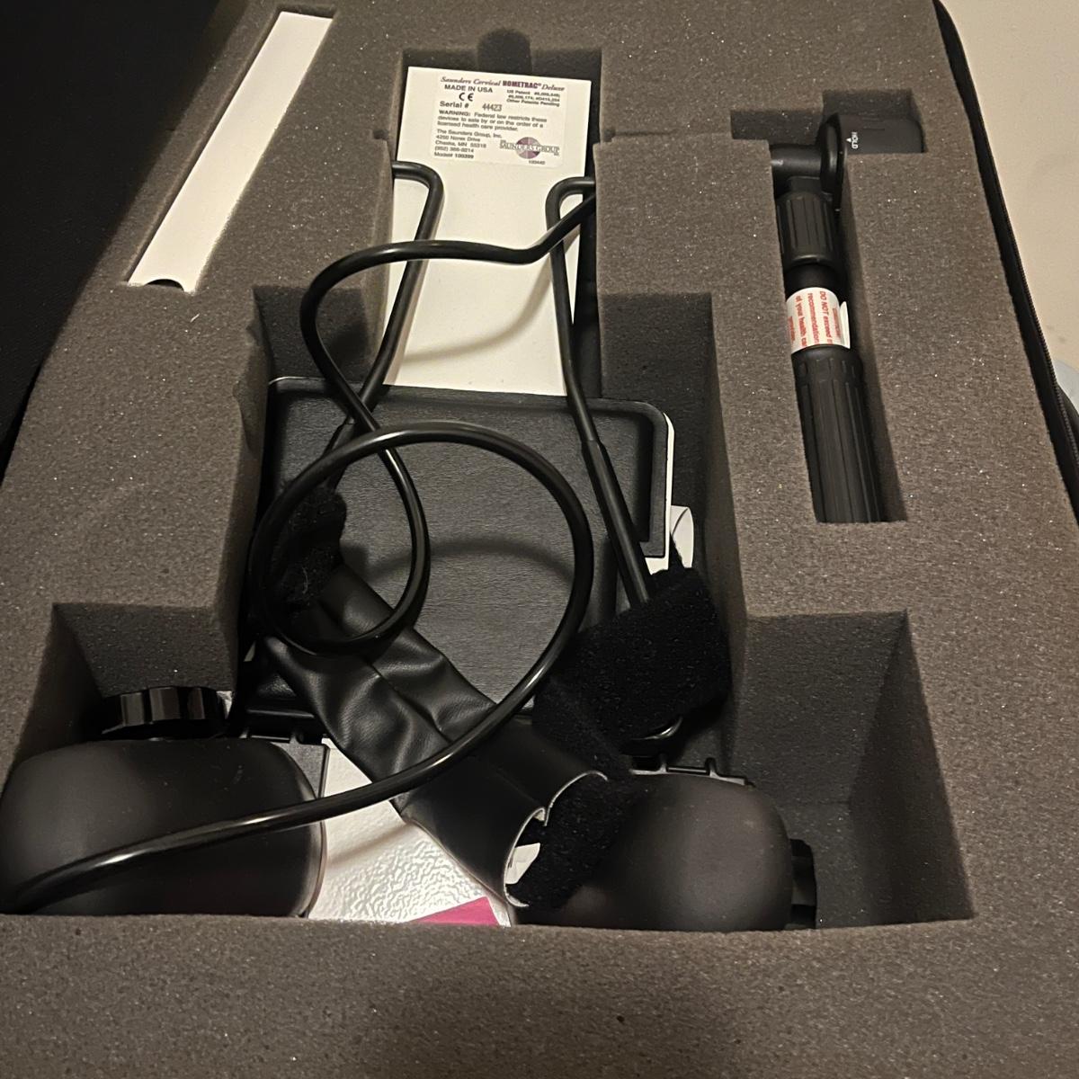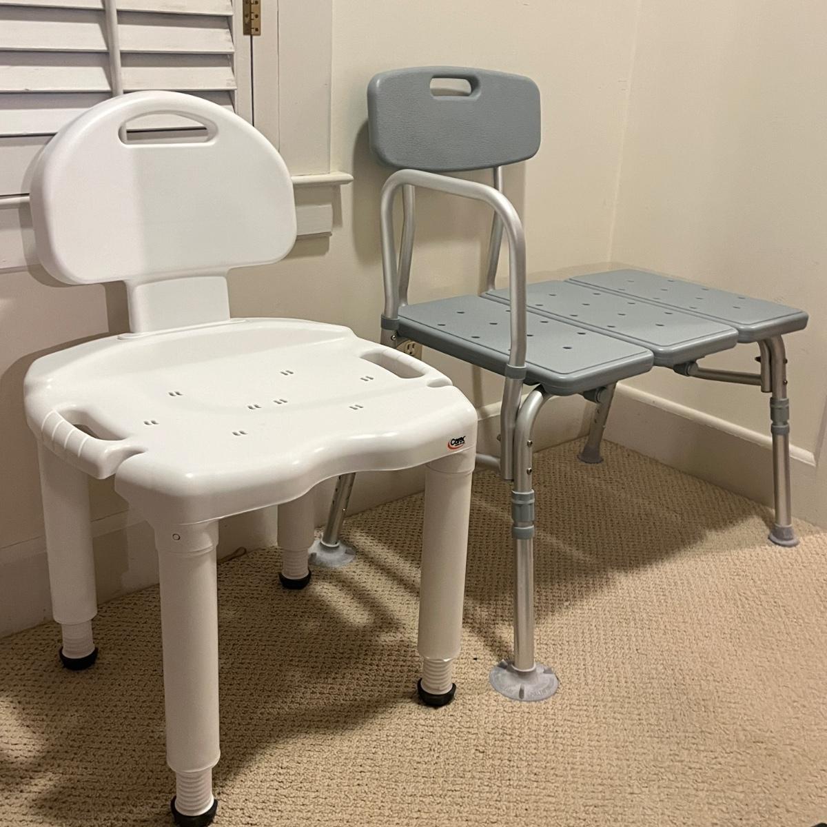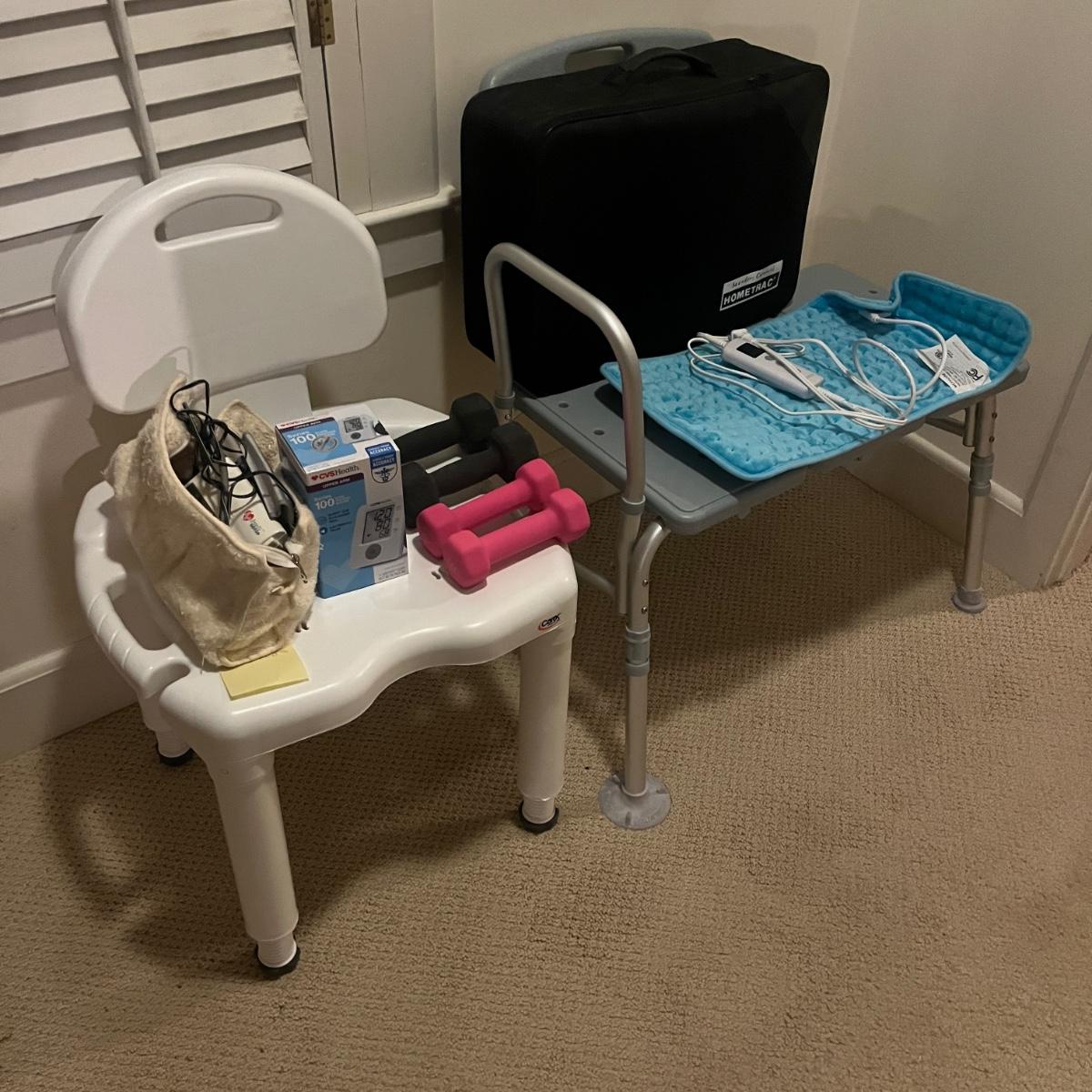 Lot includes Saunder cervical Hometrac, 3 and 5 pound dumbbells, heating pad, CVS blood pressure monitor NIB, Intelli sense blood pressure monitor and two shower chairs. BP monitor and heating pad both powered on when plugged in. Largest shower chair measures 21” x 30” x 33”H.