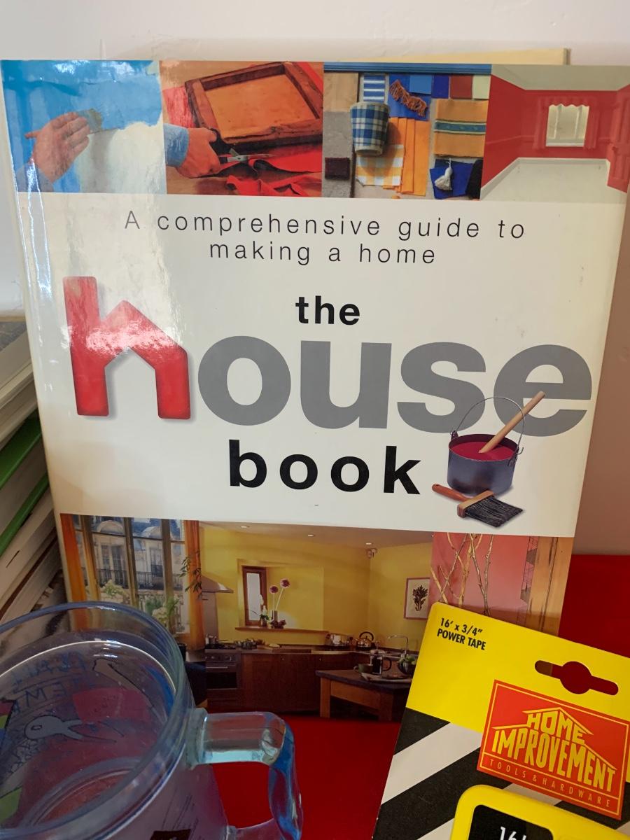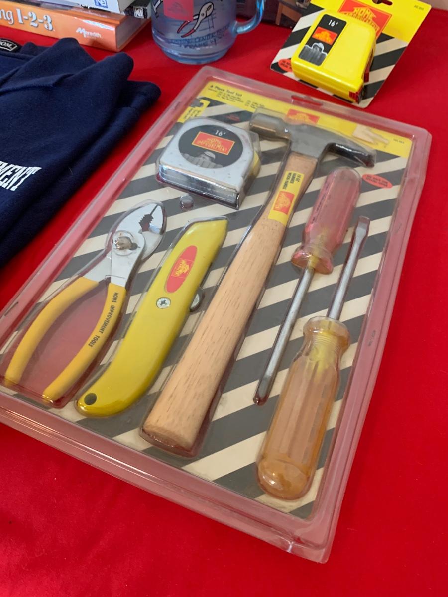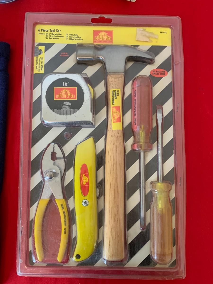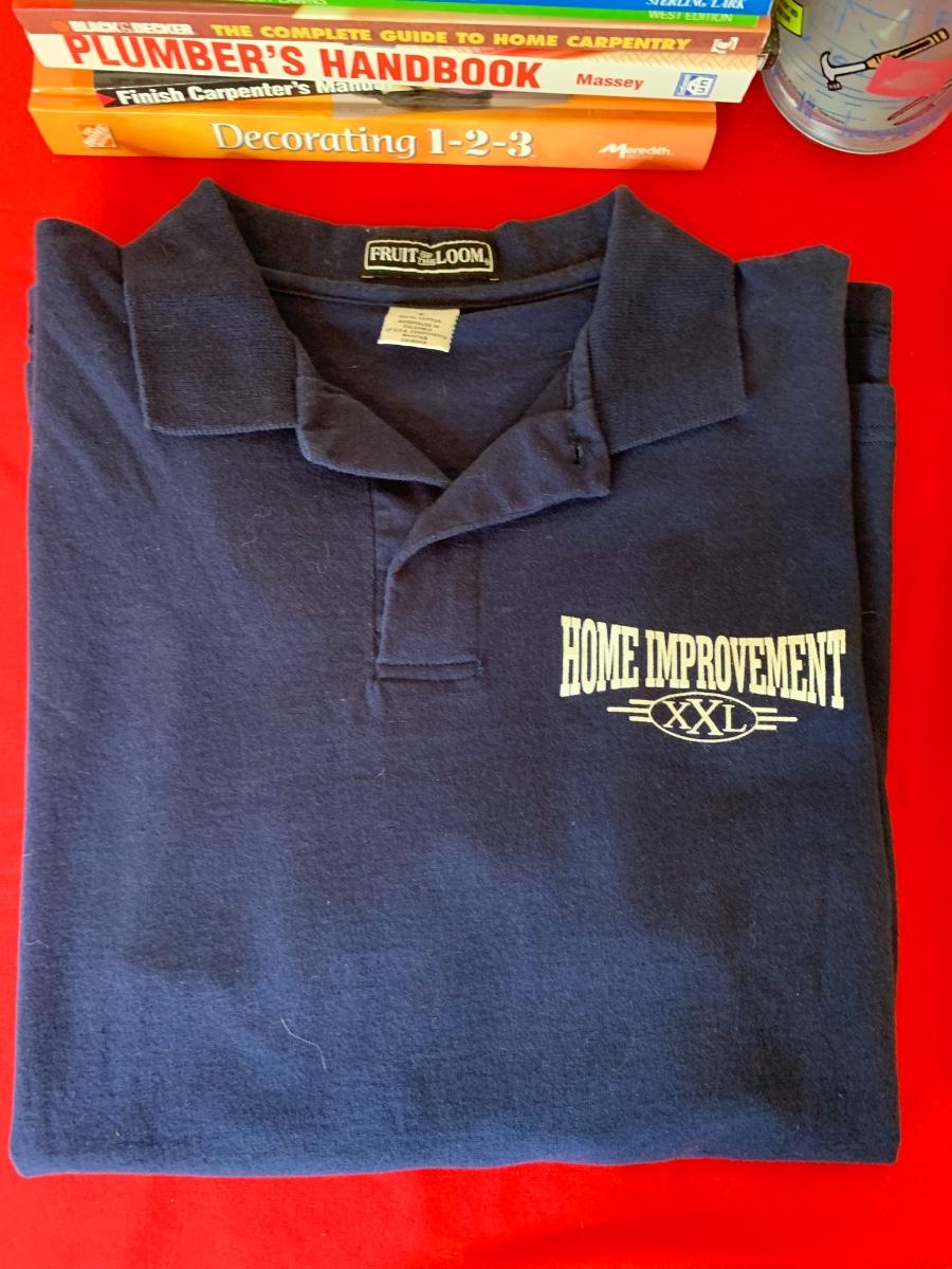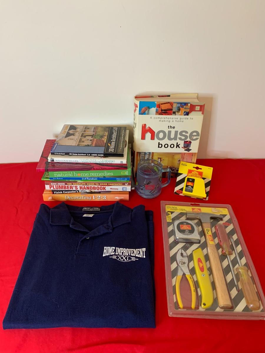 Lot includes a polo shirt and mug from Home Improvement TV show. We have added in a pile of Do-it-yourself home improvement books, a new package of Home Improvement 6 pcs tool set and a measuring tape.