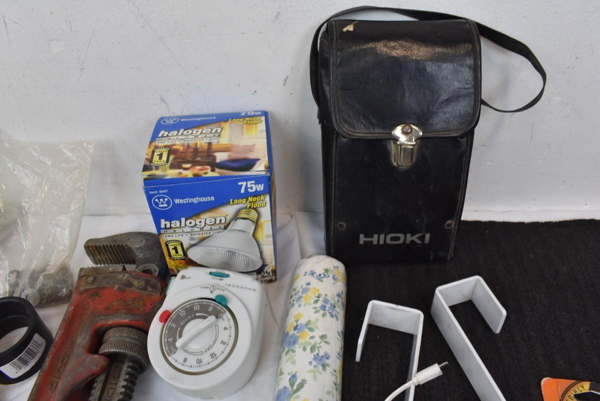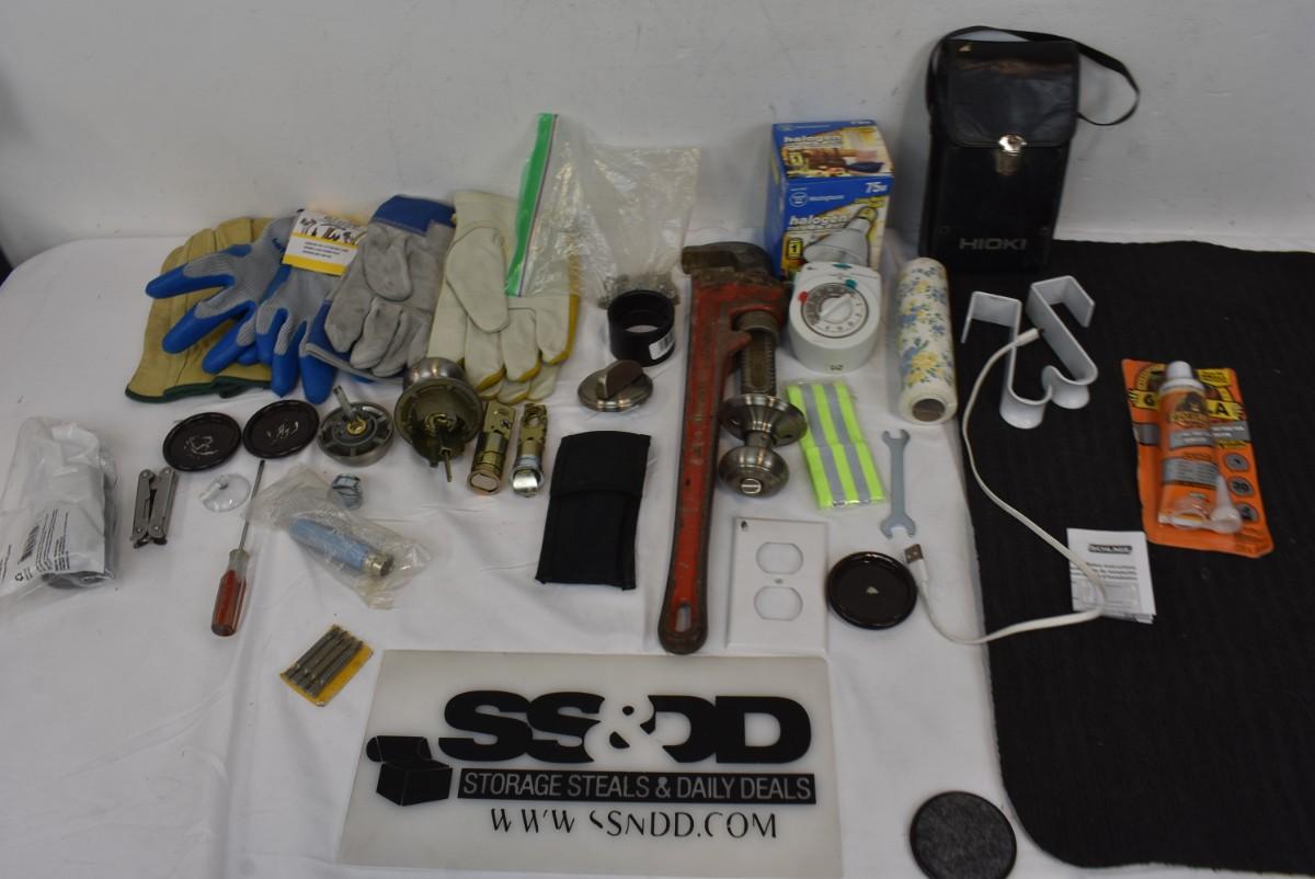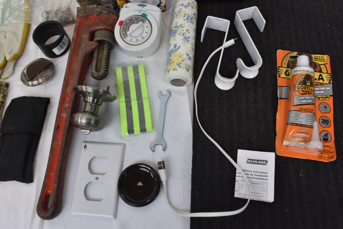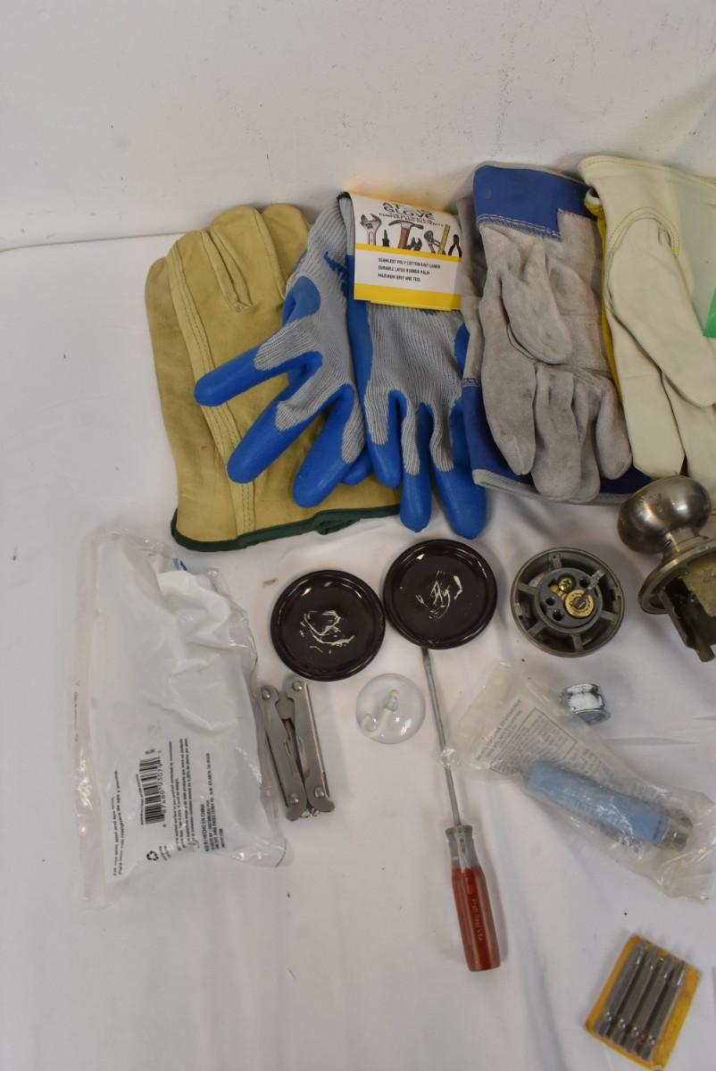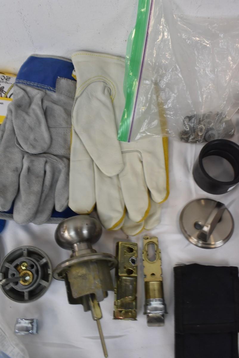 Home Improvement Lot: Gloves, Monkey Wrench, Lightbulb