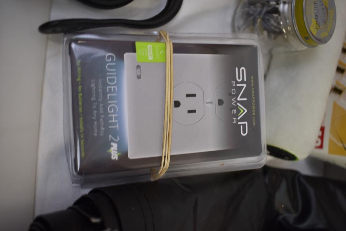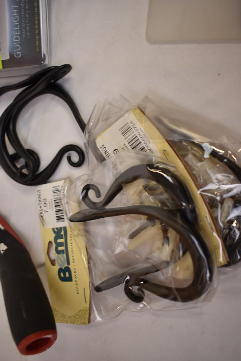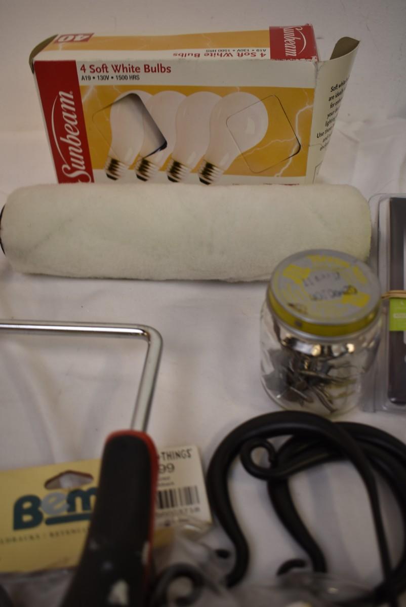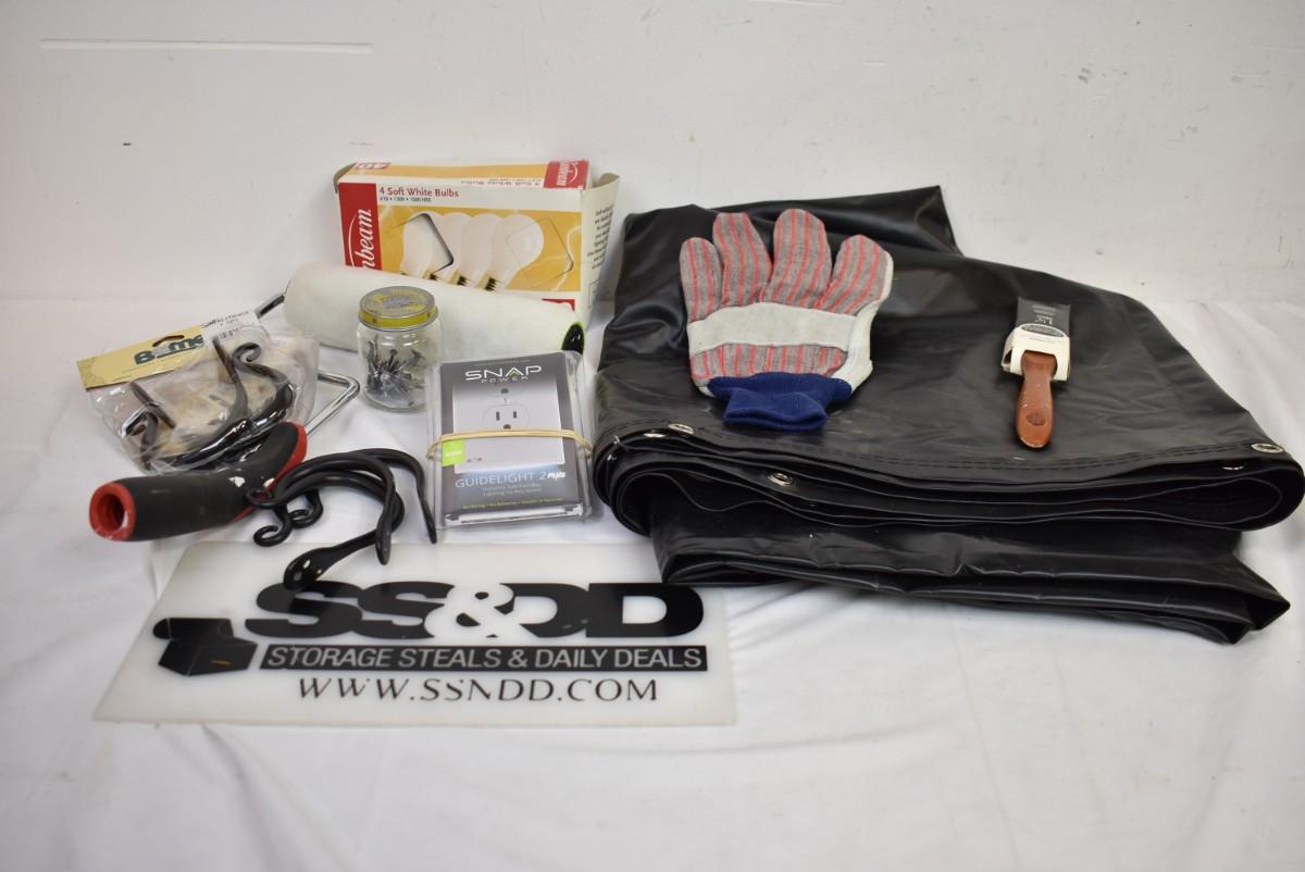 Home Improvement/decor lot: heavy duty tarp, paint supplies, lightbulbs, holdbacks for curtains