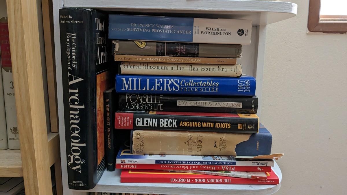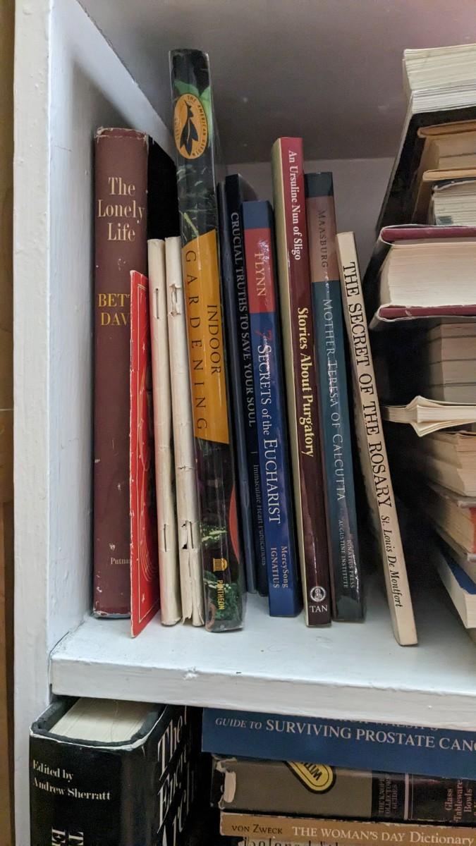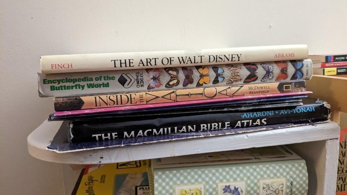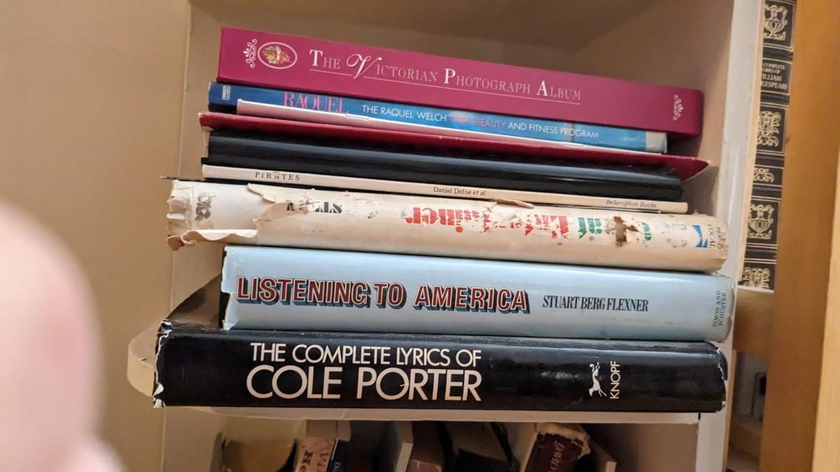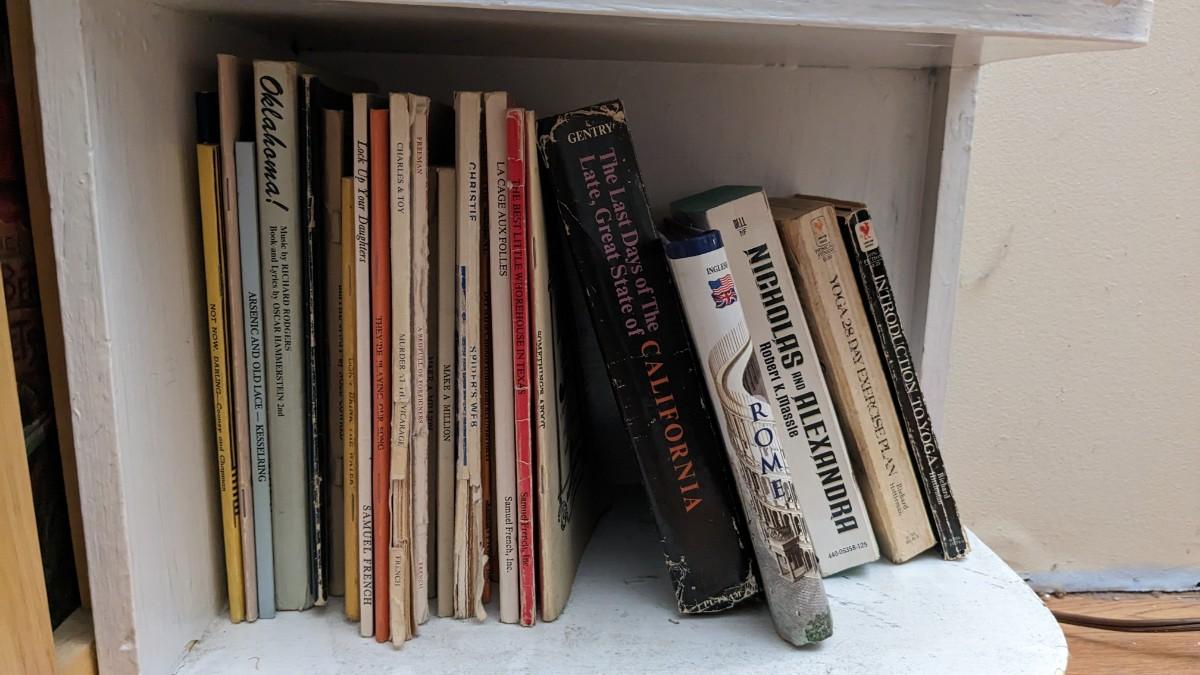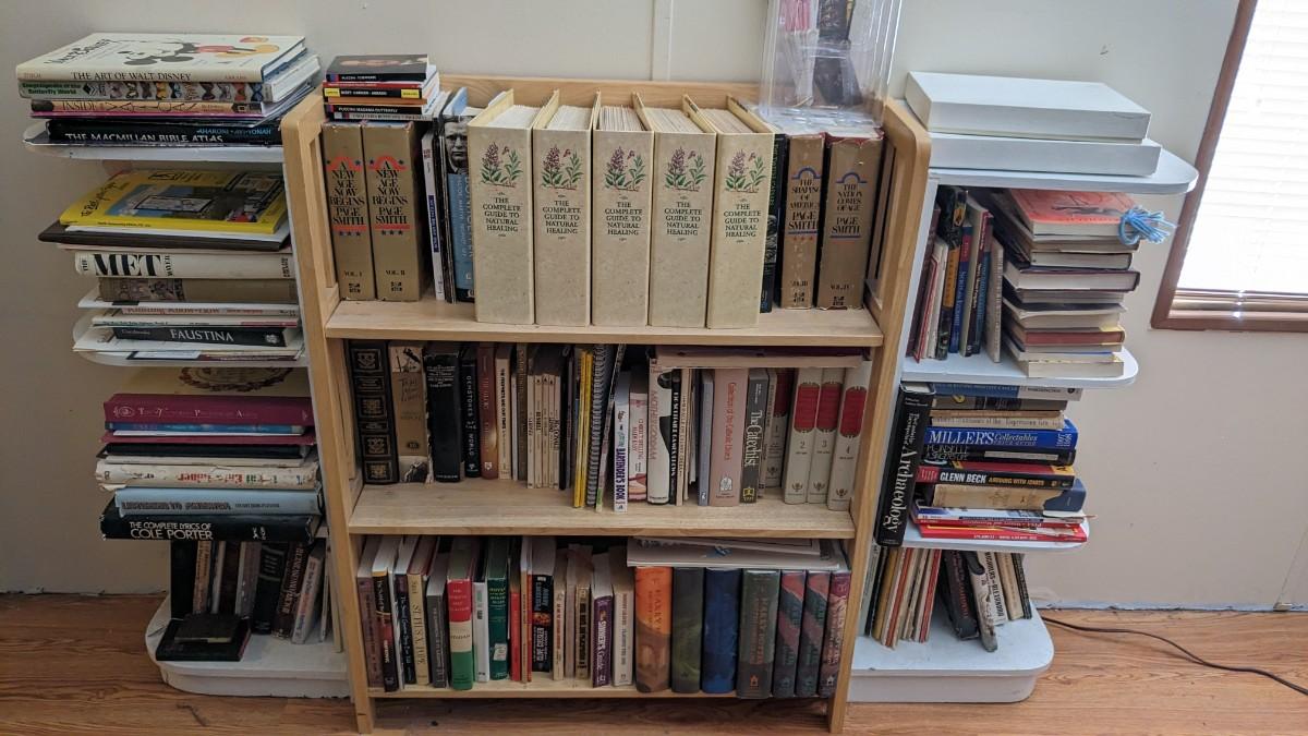 a great 30 1/8"x 12"x 38" folding shelf with mated 14.75"x9.5"x 35.5" curved corner shelves. Each are just about as full as can be with every subject you could cover. Informational, musical, religious, scripts, playbills, a great Walt Disney book. Mix of paperback and hardcover. Lots of harder to find titles in this one. no shipping. winning bidder responsible for removal of all items. livingroom