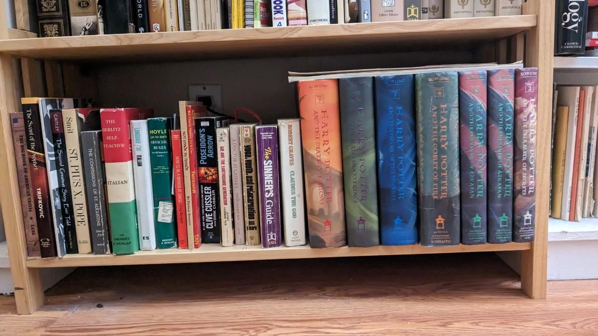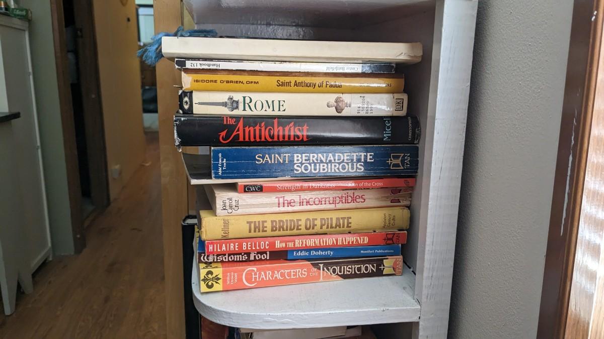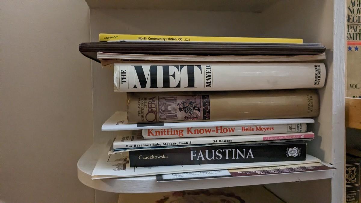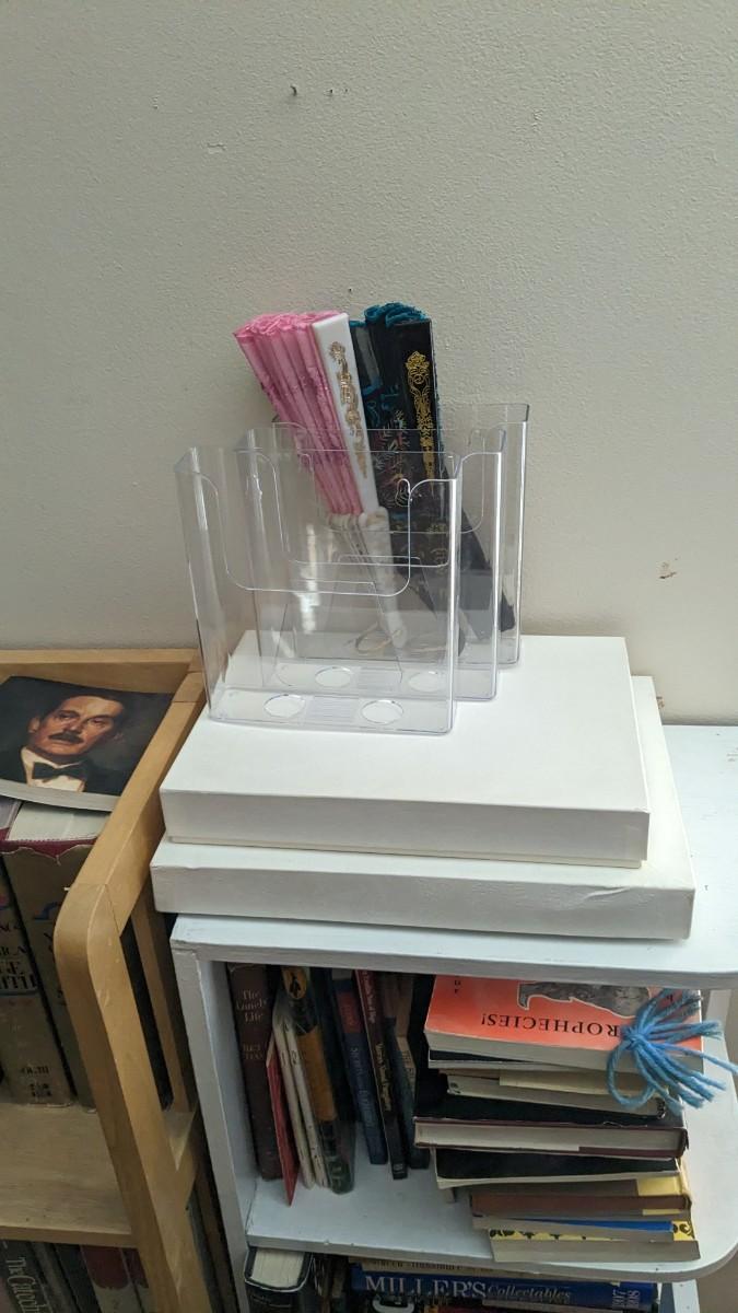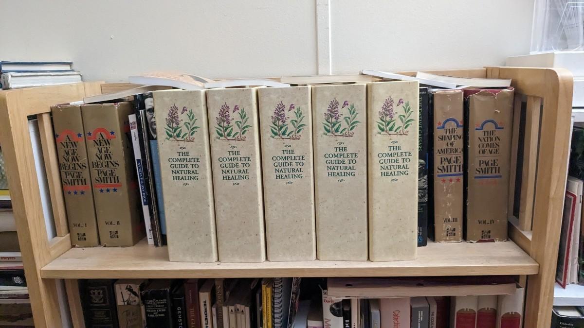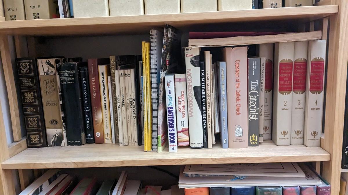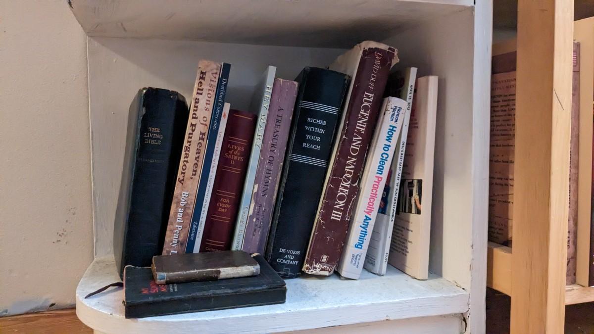a great 30 1/8"x 12"x 38" folding shelf with mated 14.75"x9.5"x 35.5" curved corner shelves. Each are just about as full as can be with every subject you could cover. Informational, musical, religious, scripts, playbills, a great Walt Disney book. Mix of paperback and hardcover. Lots of harder to find titles in this one. no shipping. winning bidder responsible for removal of all items. livingroom