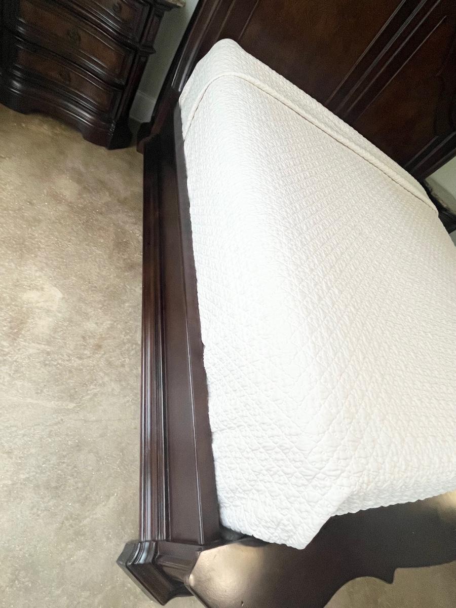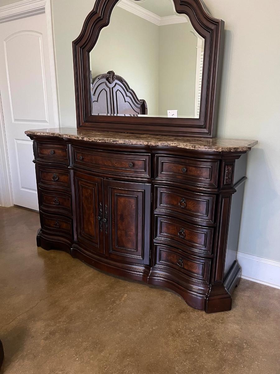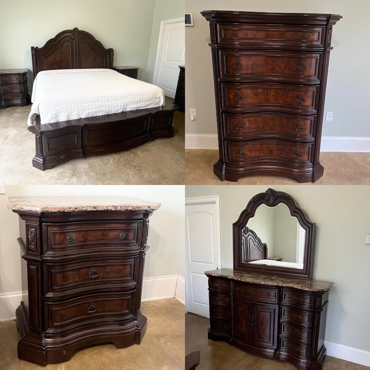 *Mattress & boxspring not included ~ Headboard = 72” H ~ 9 drawer dresser = 40” H x 71” W x 18” D ~ Mirror = 44” H ~ Two 3-drawer night stands = 32.5” H x 32” W x 28” D ~ 5-drawer chest = 60” H x 43” W x 20” D ~ mirror detaches ~ Top drawers are felt lined ~ All drawers slide in & out easily ~ Normal wear & tear, has wear from vacuum cleaner, see photos