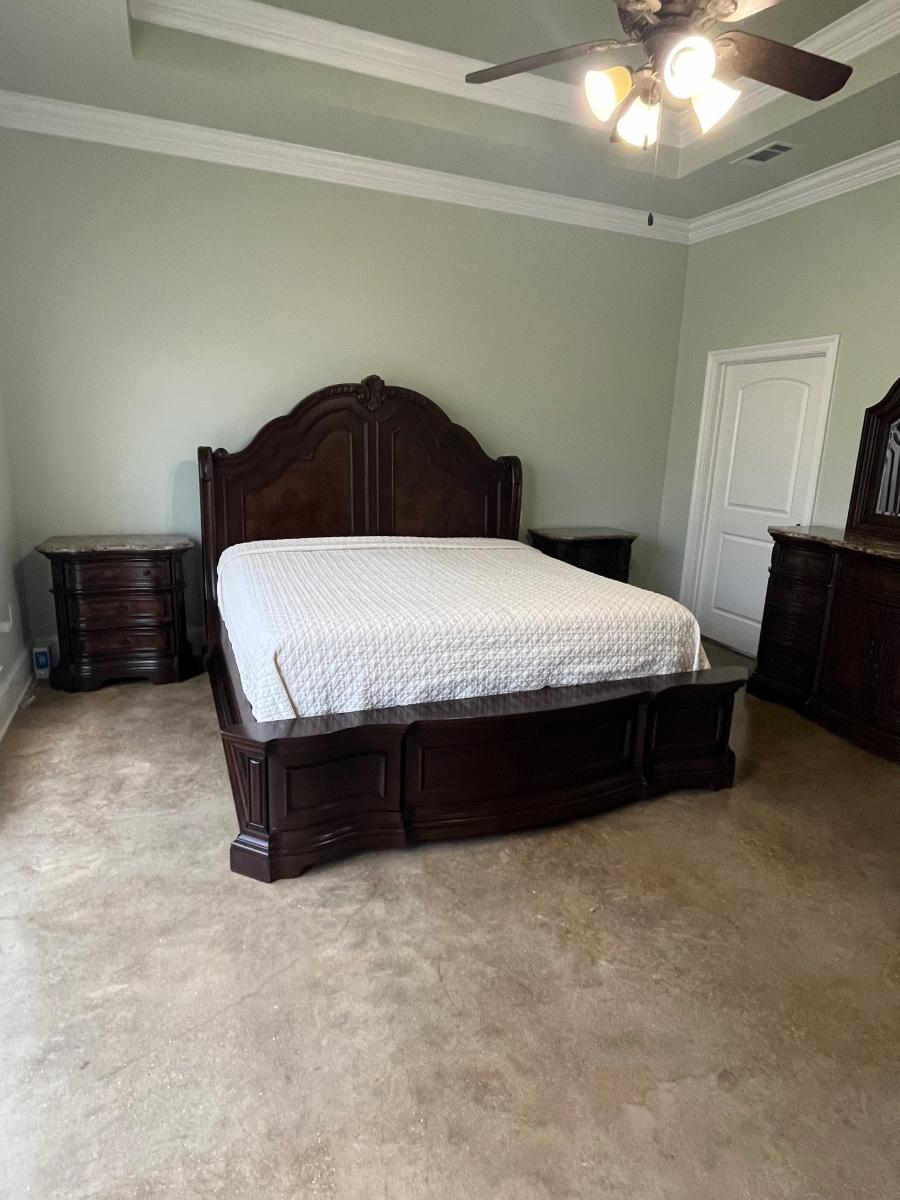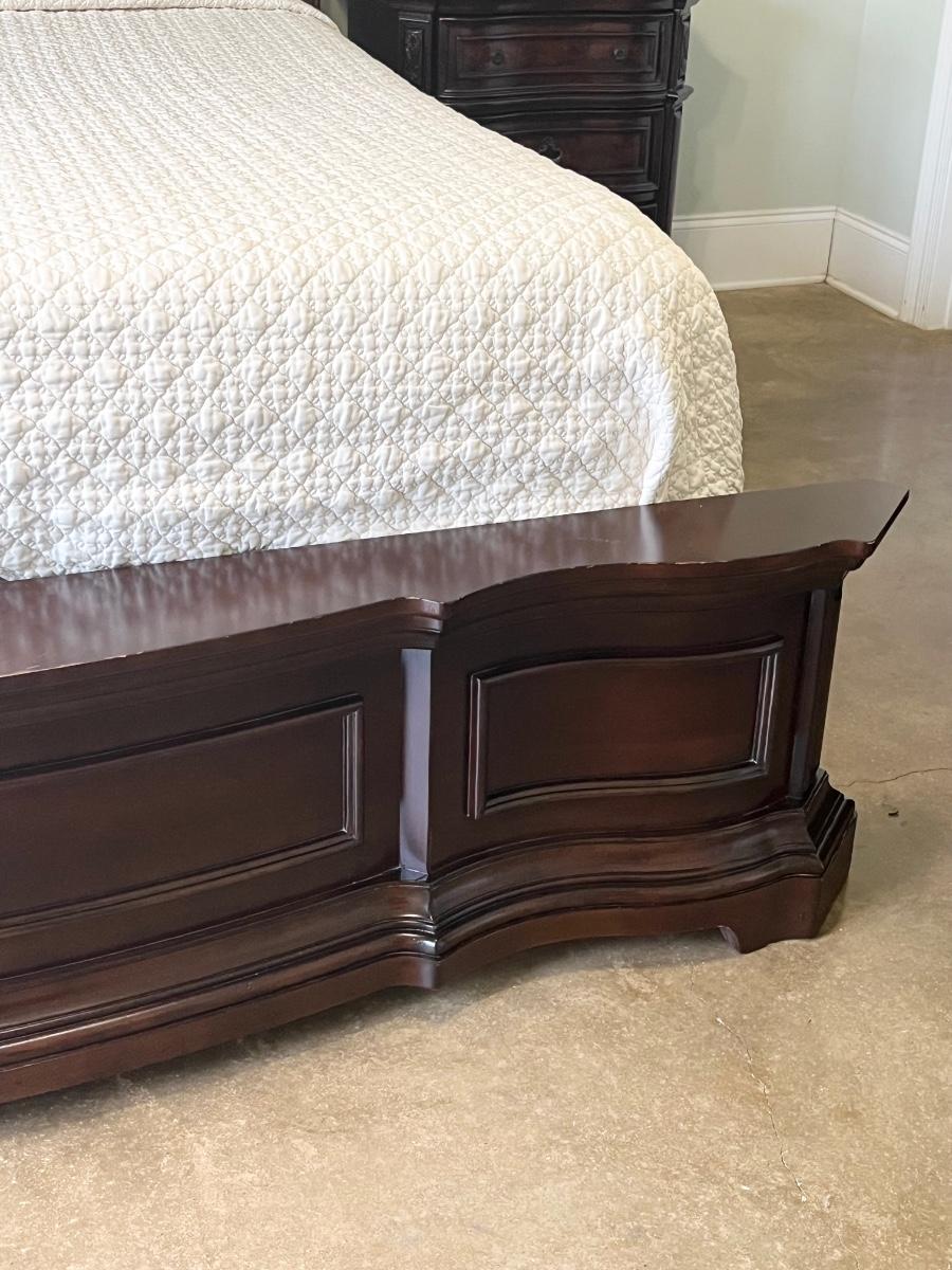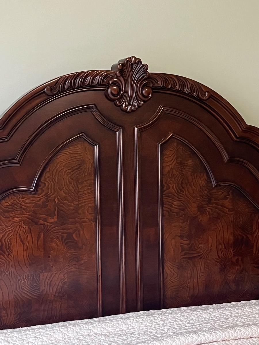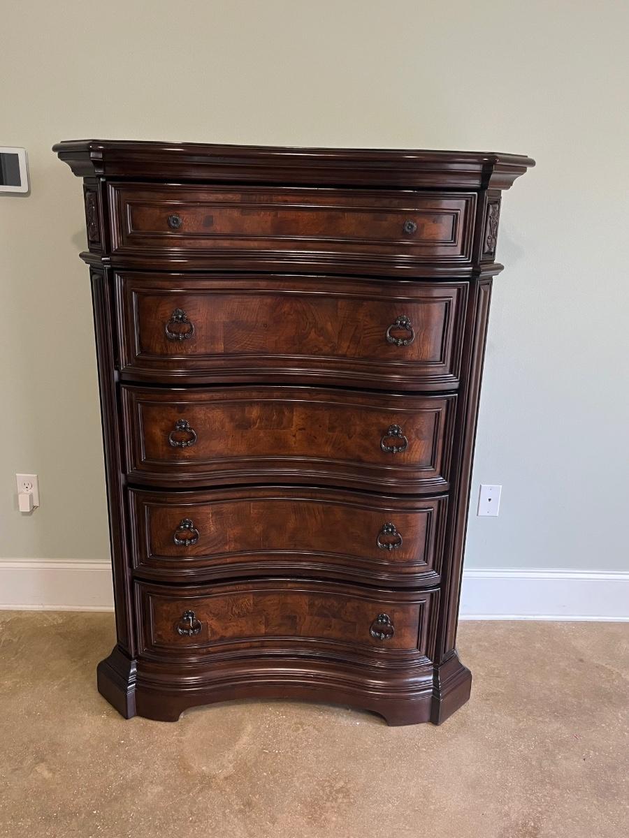*Mattress & boxspring not included ~ Headboard = 72” H ~ 9 drawer dresser = 40” H x 71” W x 18” D ~ Mirror = 44” H ~ Two 3-drawer night stands = 32.5” H x 32” W x 28” D ~ 5-drawer chest = 60” H x 43” W x 20” D ~ mirror detaches ~ Top drawers are felt lined ~ All drawers slide in & out easily ~ Normal wear & tear, has wear from vacuum cleaner, see photos