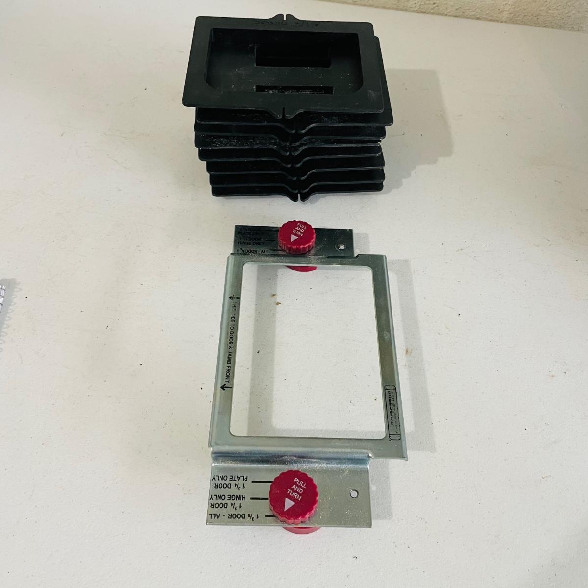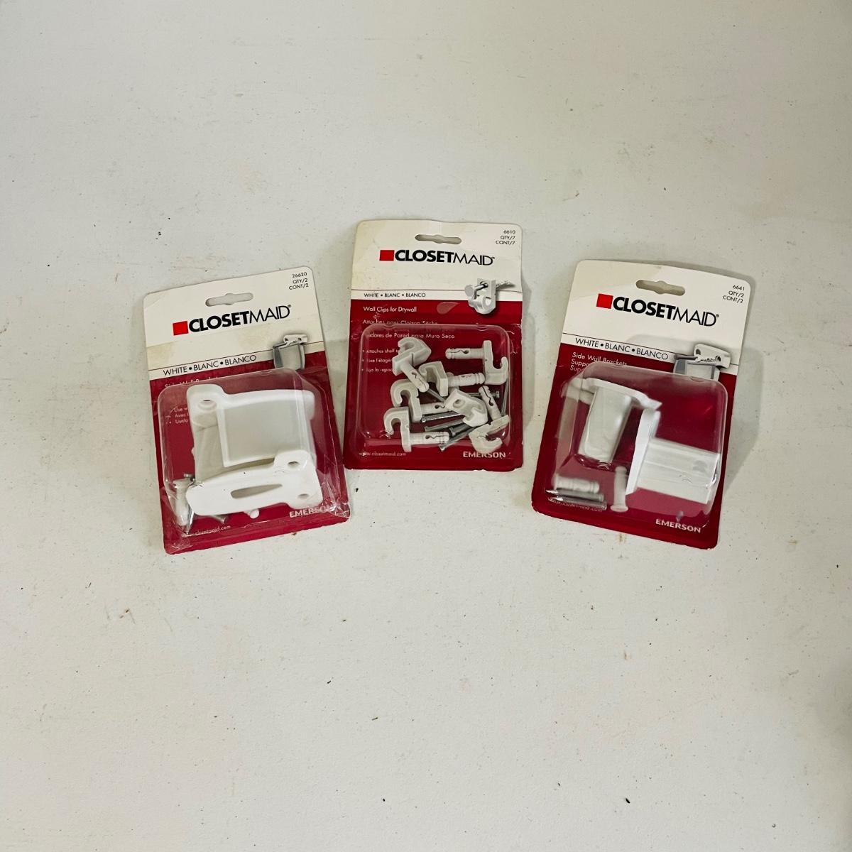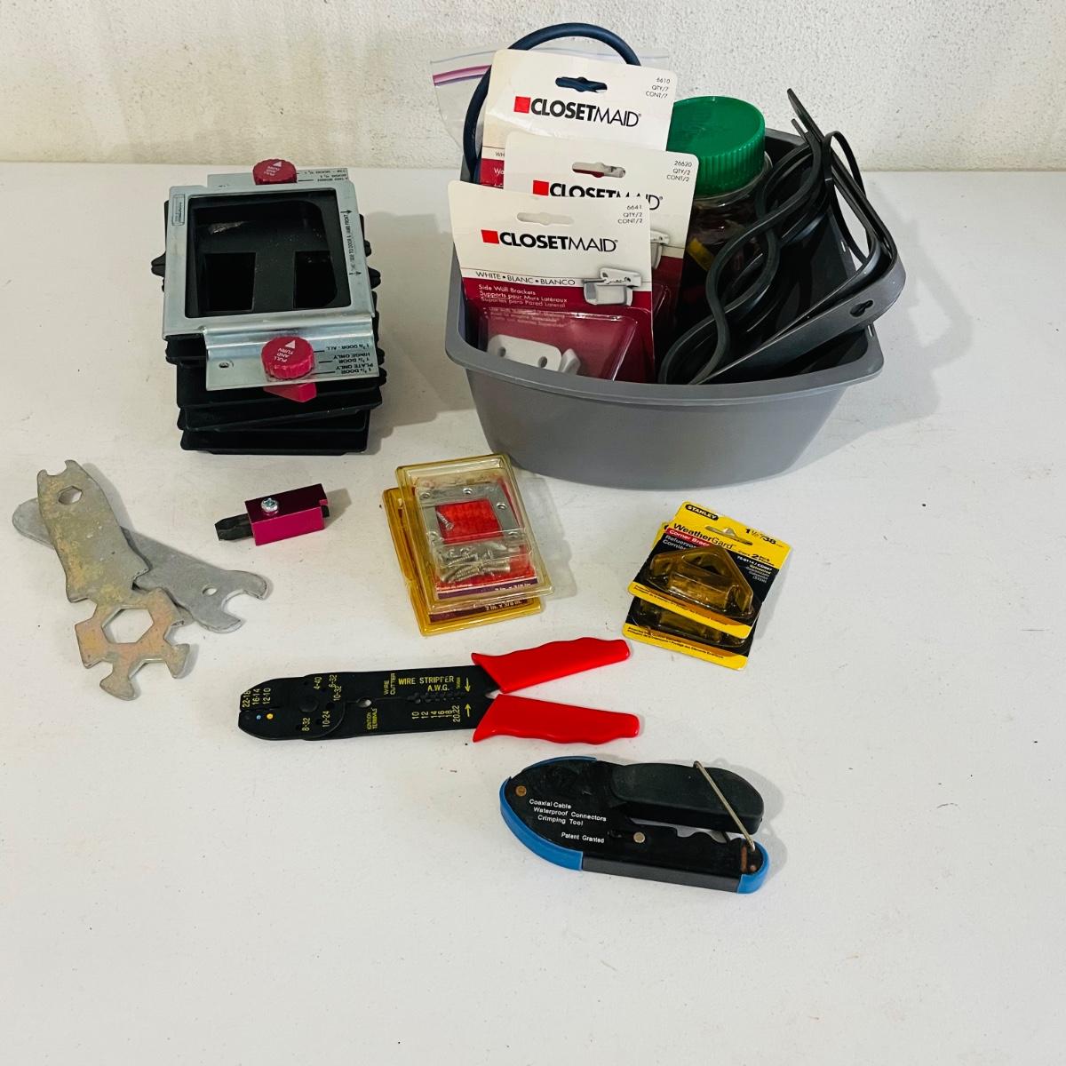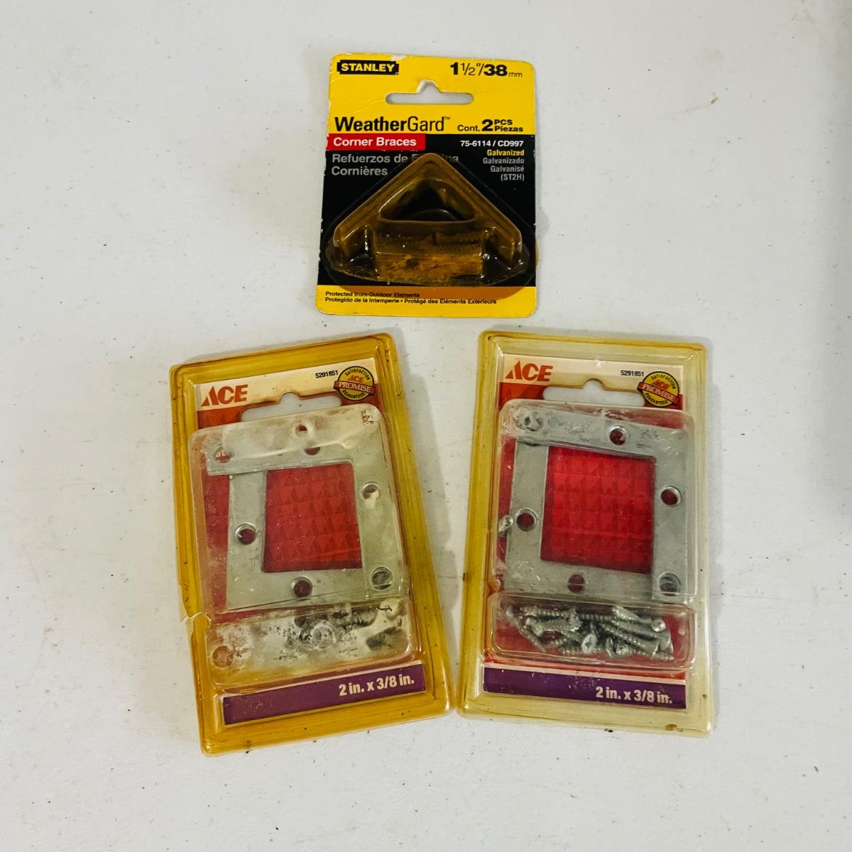 Lot includes a Milescraft door installation kit with 8 template plates. A wire stripper and cutter. Coaxial cable waterproof connectors crimping tool. 2 Closet Maid 2pk of side wall brackets,white, still in packaging. A 7pk of closet maid wall clips for drywall, white, new still in packaging. 2 Ace 2”x 3/8”flat corner brace packs-new. 2 Weather Guard galvanized 1 1/2” corner brace 2pk. 3 8” pewter Celtic scroll brackets. All items are in new to good condition.