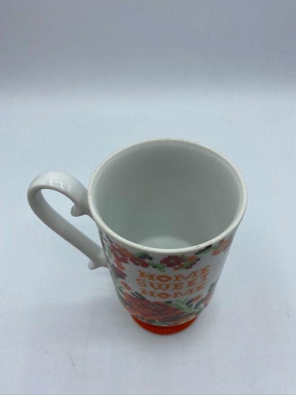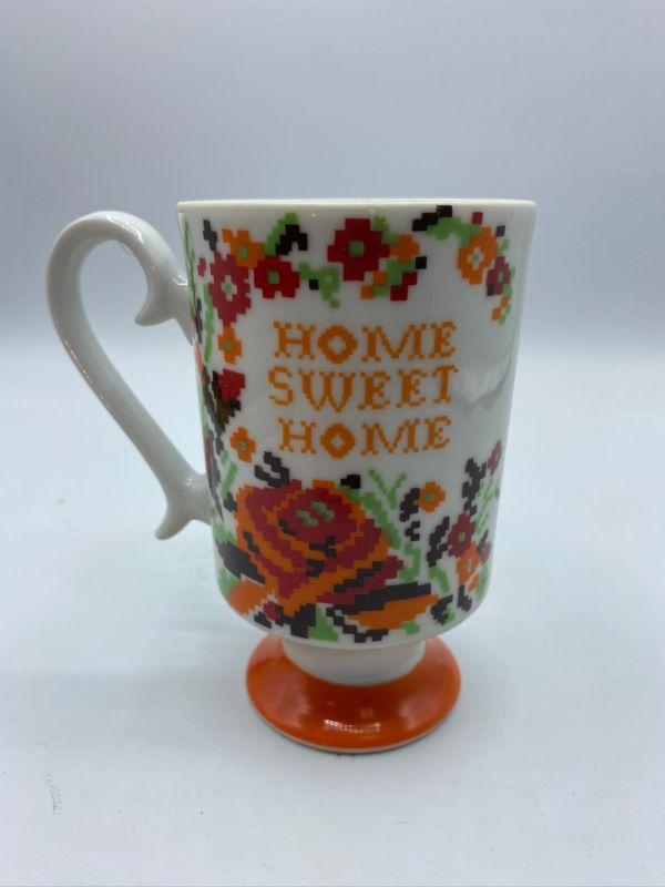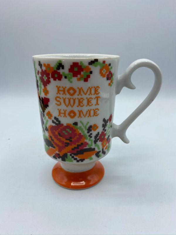 Arnart Smug Mug "Home Sweet Home". Looks like a cross stitched picture in oranges and reds. Good Condition.