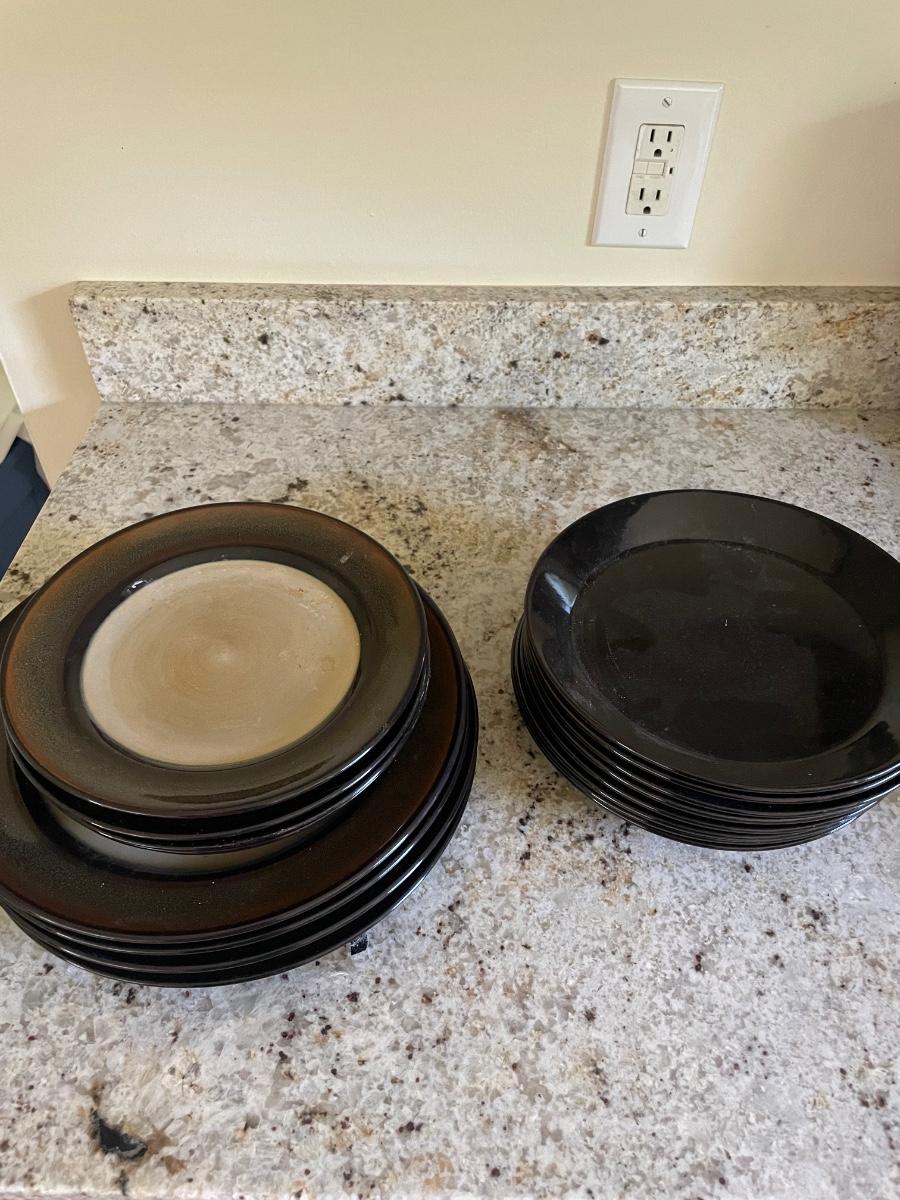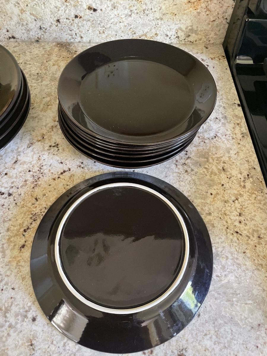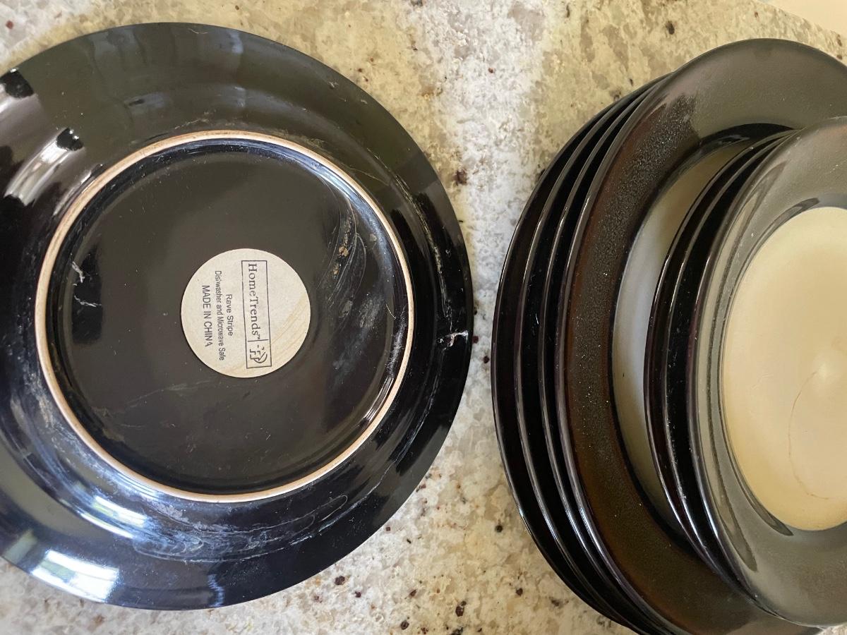 This Home Trends set includes 4 each of side and dinner plates (dinner plates measure 11” d) and 2 cups. Also included are 8 unmarked dark brown plates and 8 tall glasses.