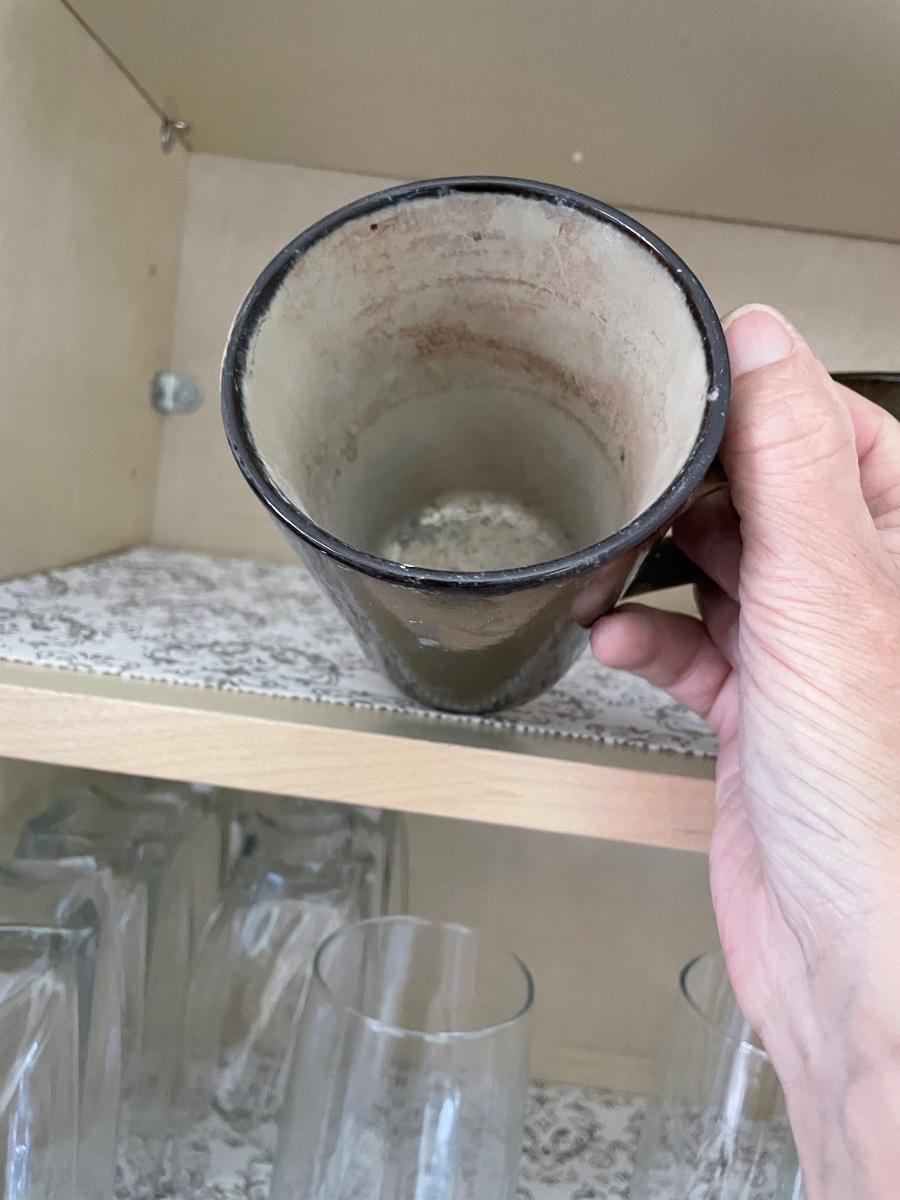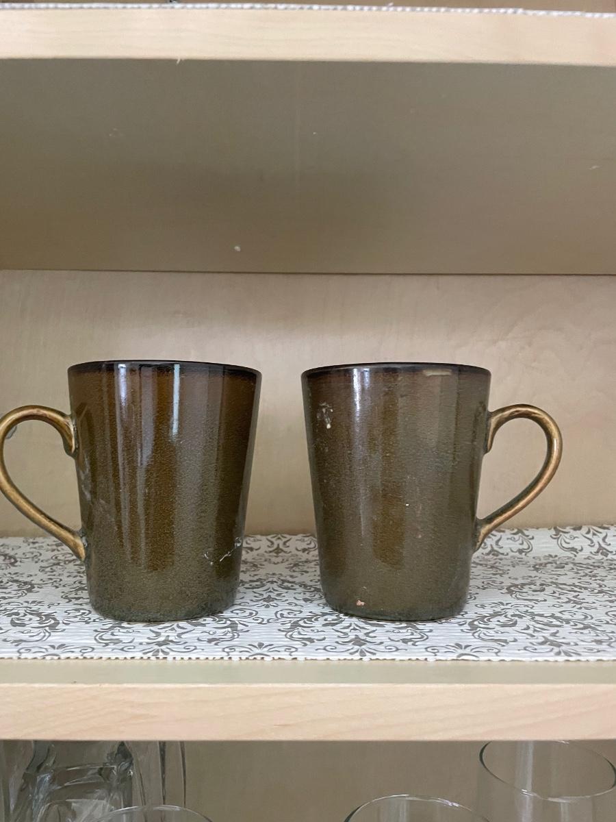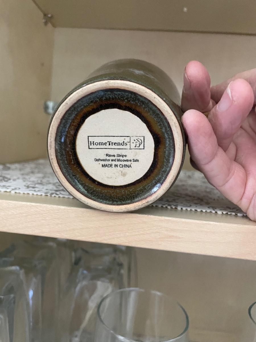 This Home Trends set includes 4 each of side and dinner plates (dinner plates measure 11” d) and 2 cups. Also included are 8 unmarked dark brown plates and 8 tall glasses.