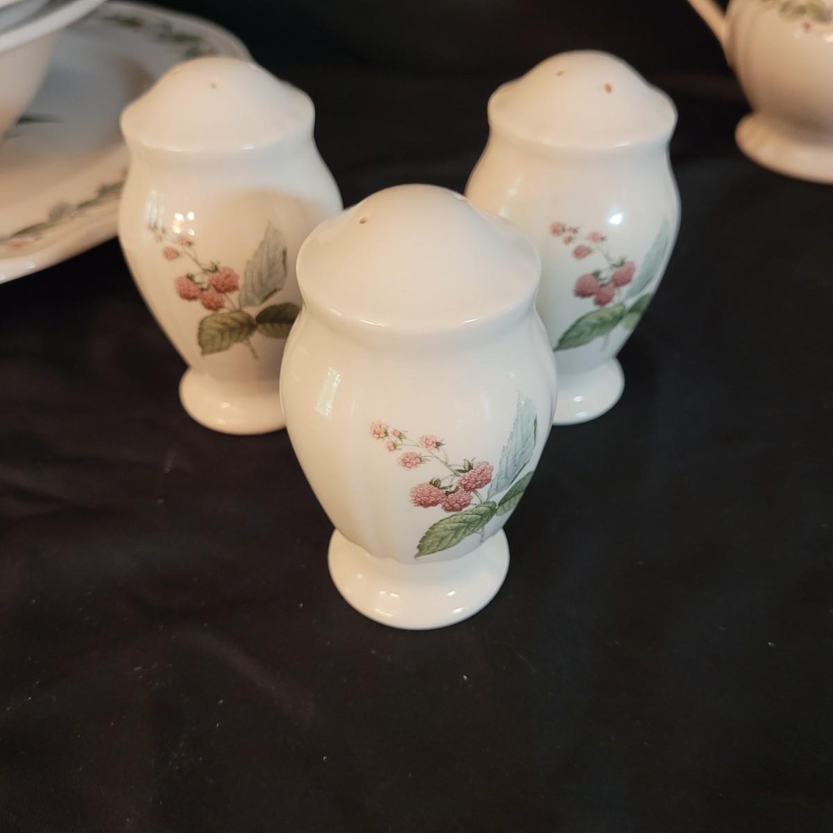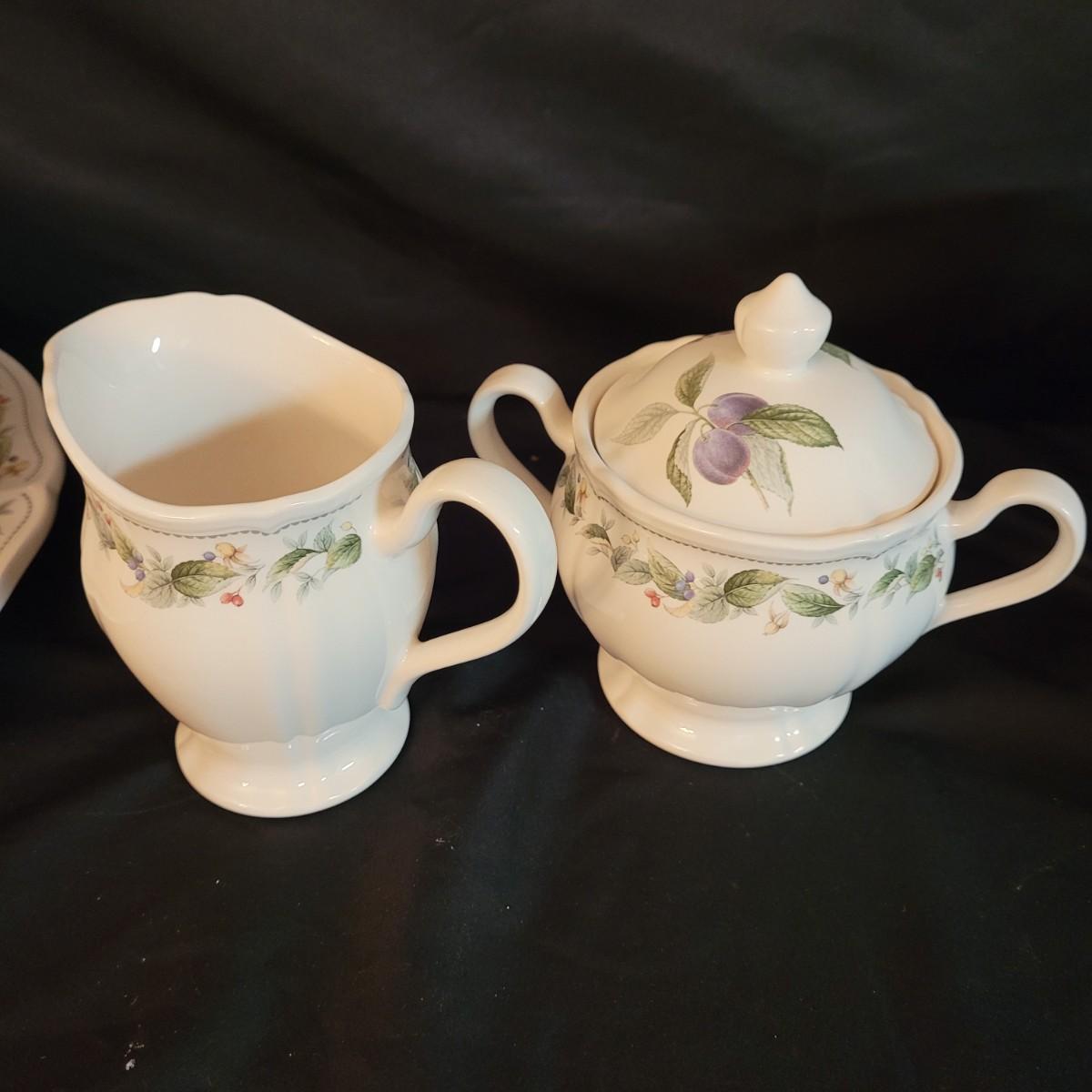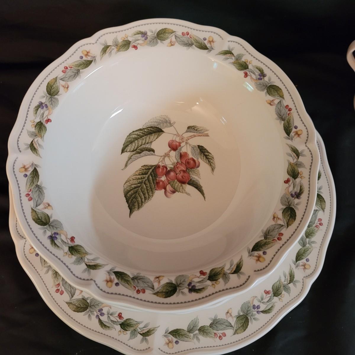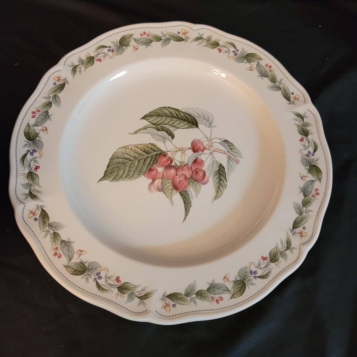 This lovely set of dishes and serveware depicts plums, cherries and raspberries in beautiful detail. Set includes one large serving dish, ten large plates, five medium plates, three large bowls, three medium bowls, six small bowls, eight saucer plates, six mugs, a creamer and sugar jar, two salt shakers and one pepper shaker. Very few chips (see photos). Large serving dish measures approximately 12.5”DIA. Shipping available. Shipping can be costly. We suggest contacting our preferred local shipping provider, Postage Express, with dimensions and getting an estimate before bidding: (828) 670-5501or postageexpress@yahoo.com.