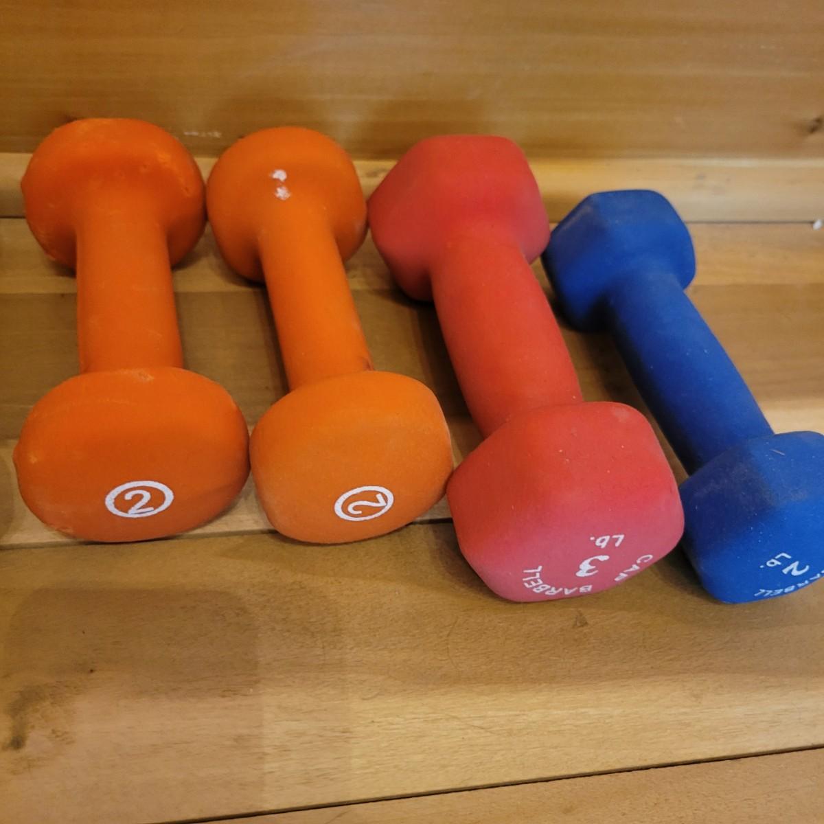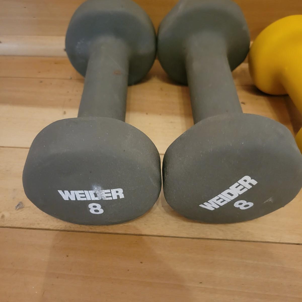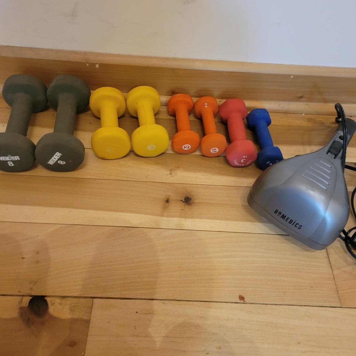 A Homedics massager that powered on when plugged in. It features adjustable vibration and and the width of the vibrators can be adjusted. This lot also also includes eight dumbells ranging from eight pounds to two pounds. Local pickup only